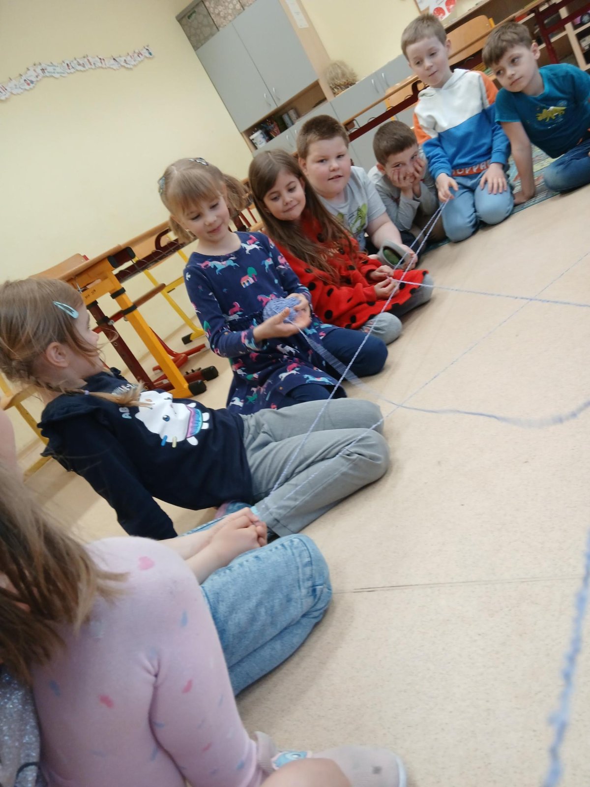 Ve školní družině jsme si dnes vyzkoušeli zábavnou a zároveň milou aktivitu s klubkem vlny. Sedli jsme si do kruhu a navzájem si házeli klubko, čímž postupně vznikala „pavučina“. Každý, kdo klubko chytil, řekl o tom, komu ho hází, něco hezkého – co se mu na něm líbí nebo co na něm oceňuje.