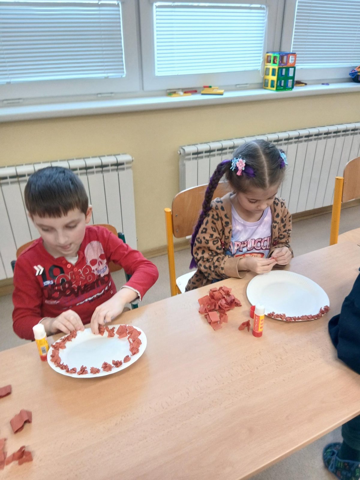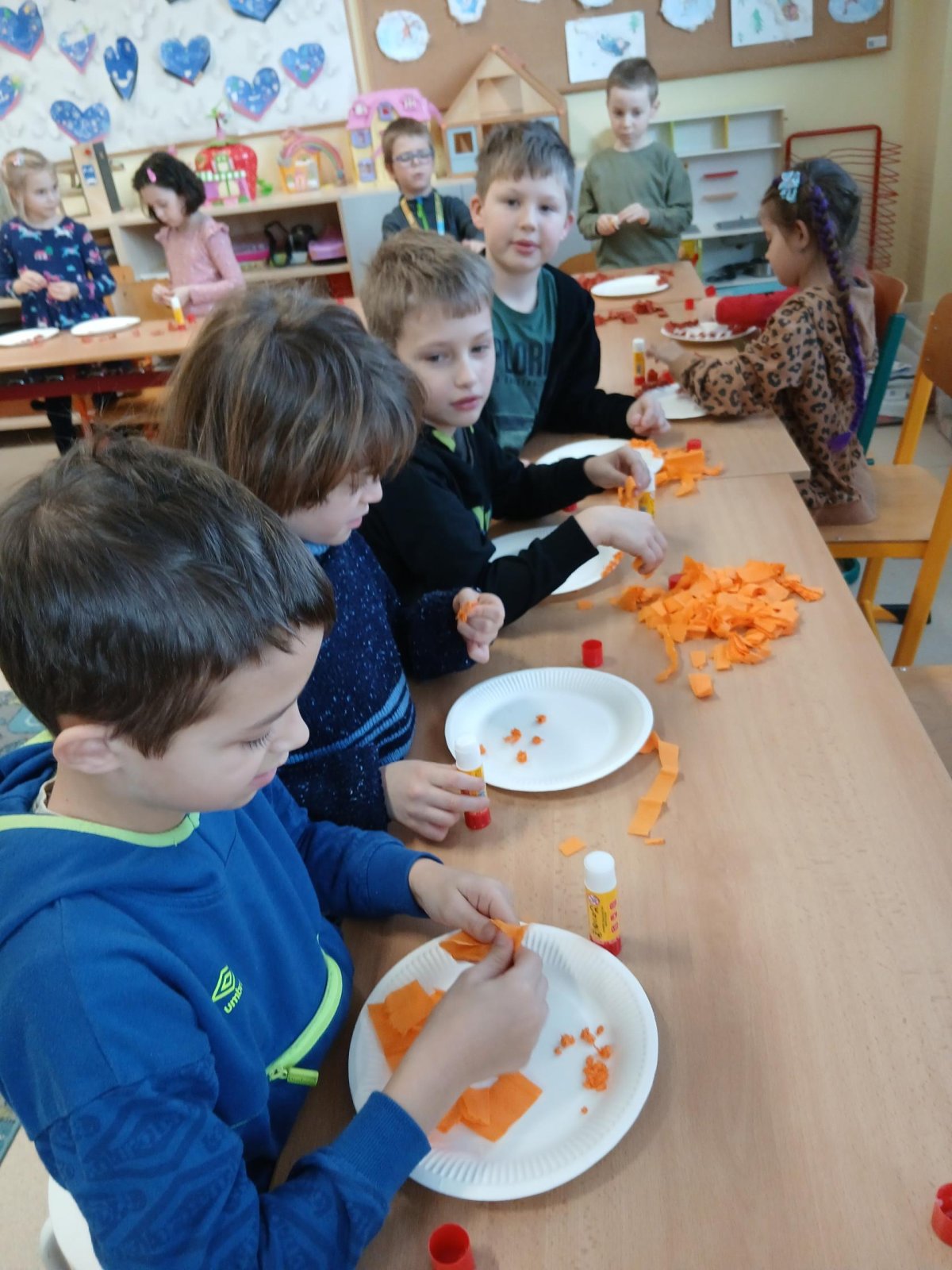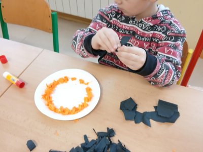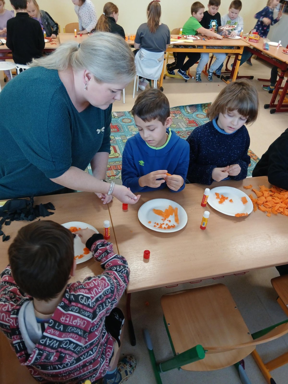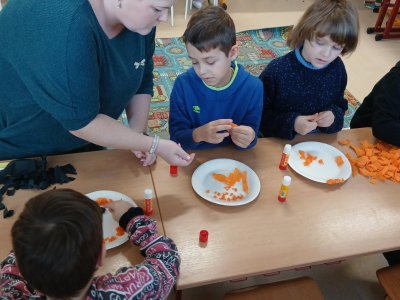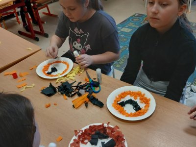 V rámci tematického bloku Masopust si děti ve školní družině vyzkoušely tvořivou činnost – vyráběly masopustní koláče z krepového papíru. Pomocí lepení barevných kuliček na tácek vznikaly originální a velmi povedené „koláče“, které dětem rozvíjely jemnou motoriku, fantazii i trpělivost. Práce je velmi bavila a výsledné výtvory se jim opravdu povedly.