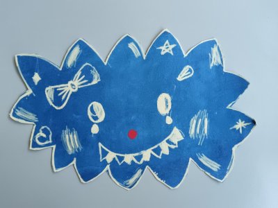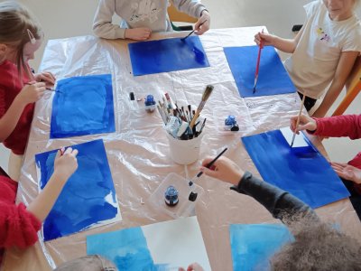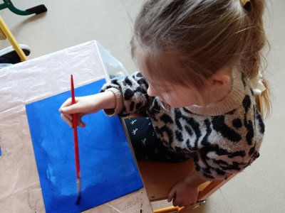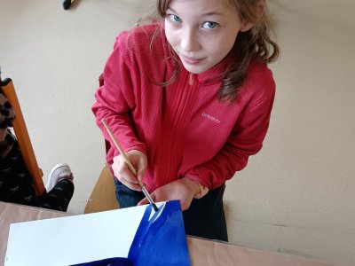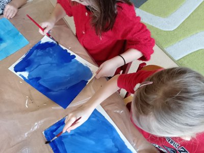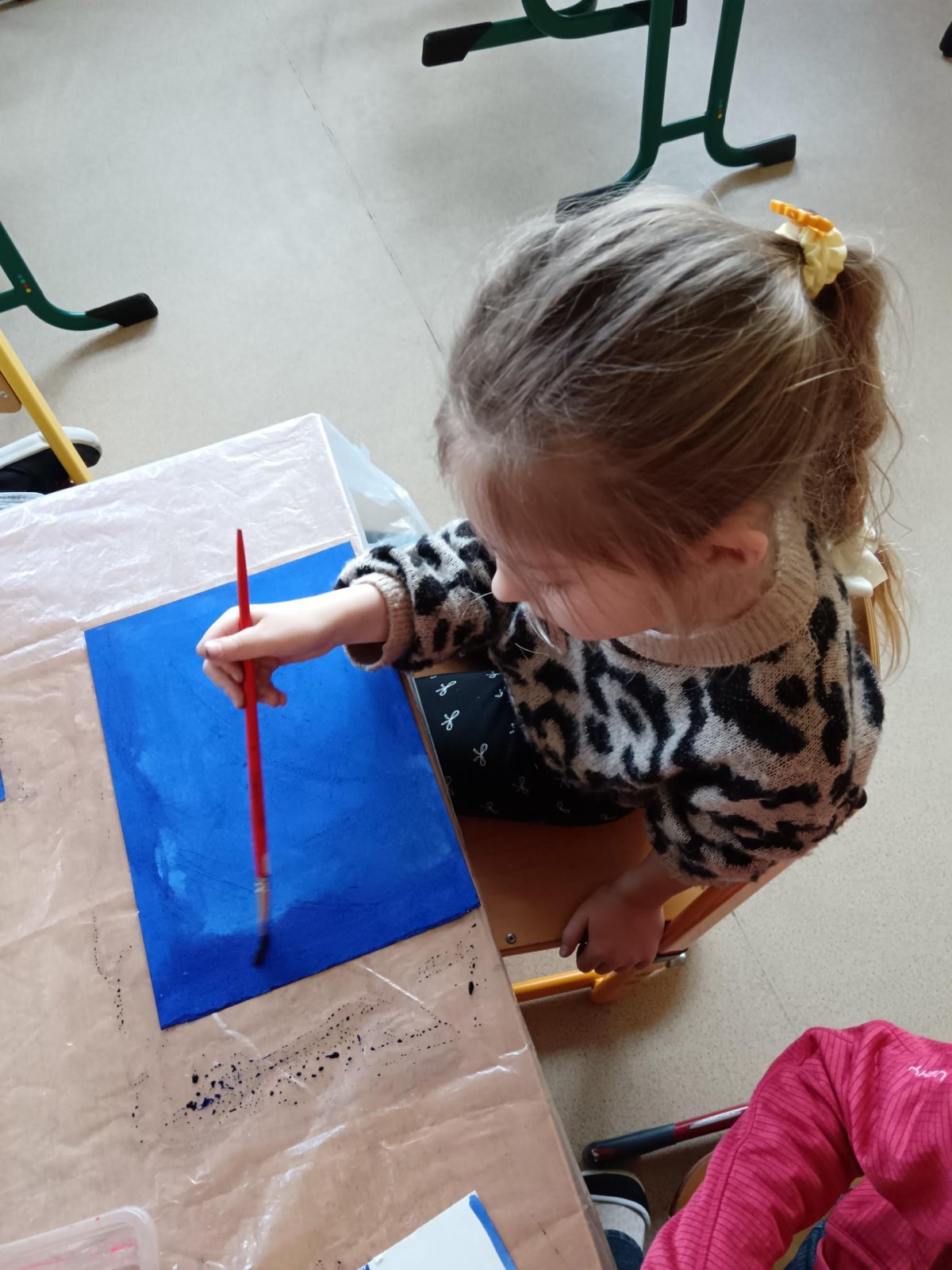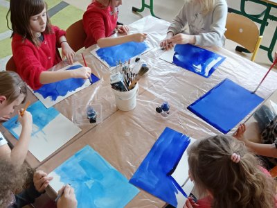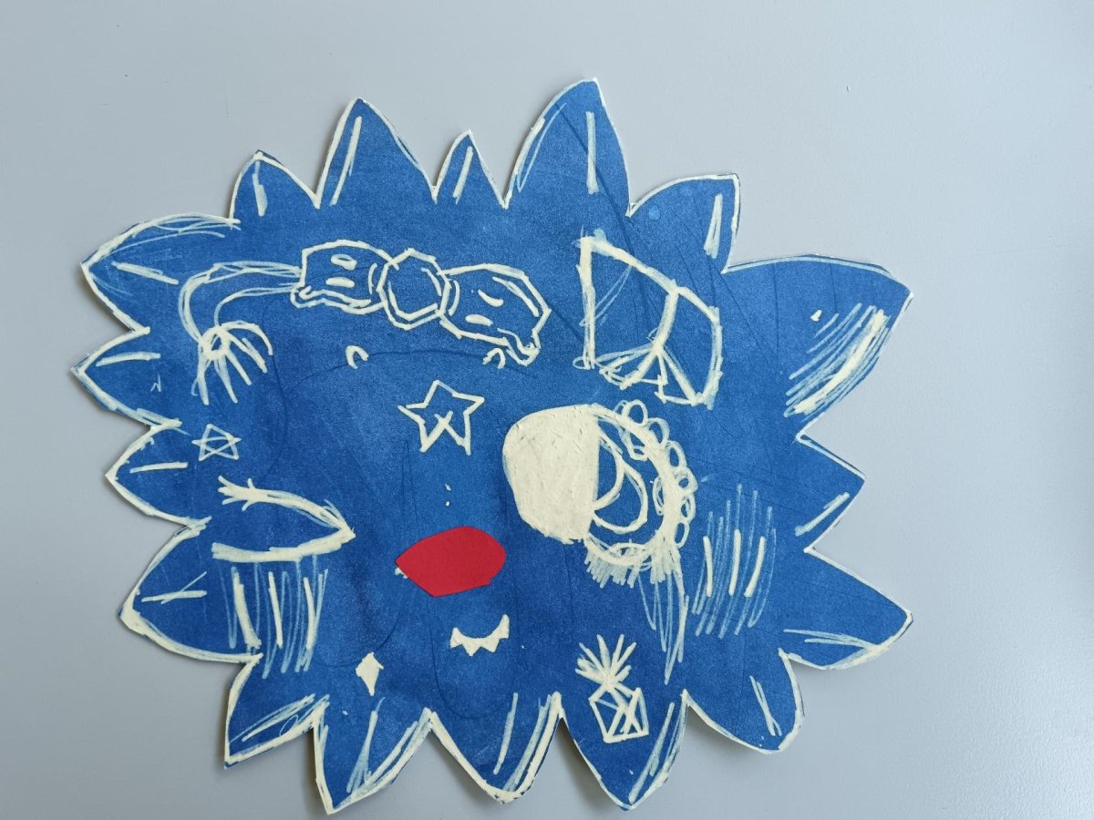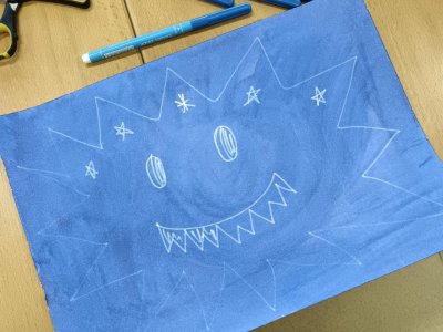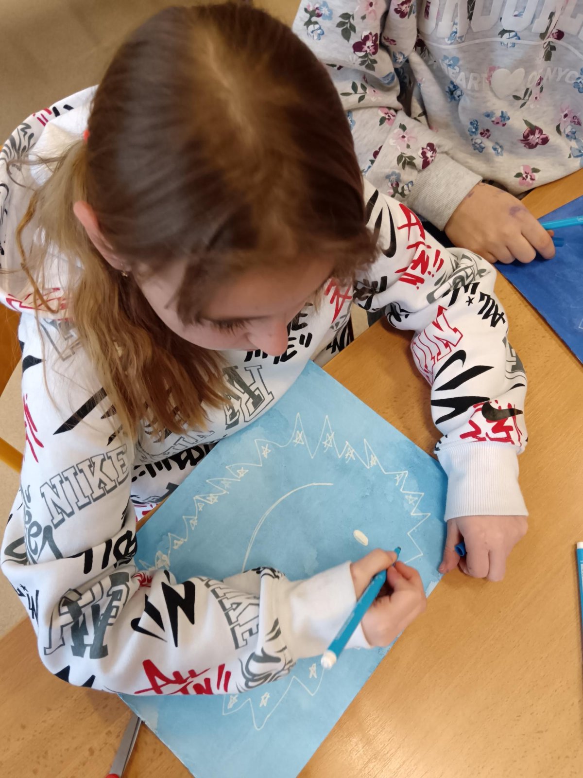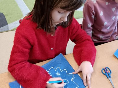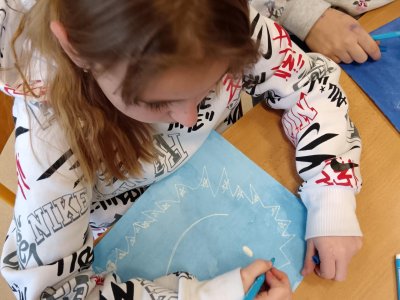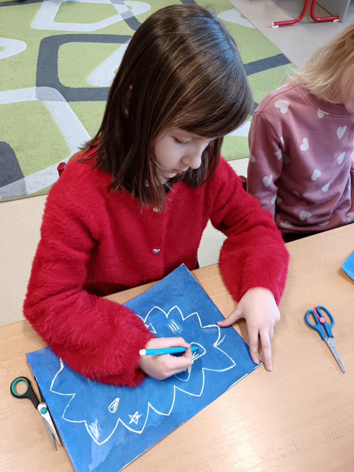 Malovaný mrazík ozdobil nástěnku mrazivým úsměvem. A proměnil ji v kouzelné umělecké dílo. Obrázky se povedly a rozzářily prostor u vchodových dveří.