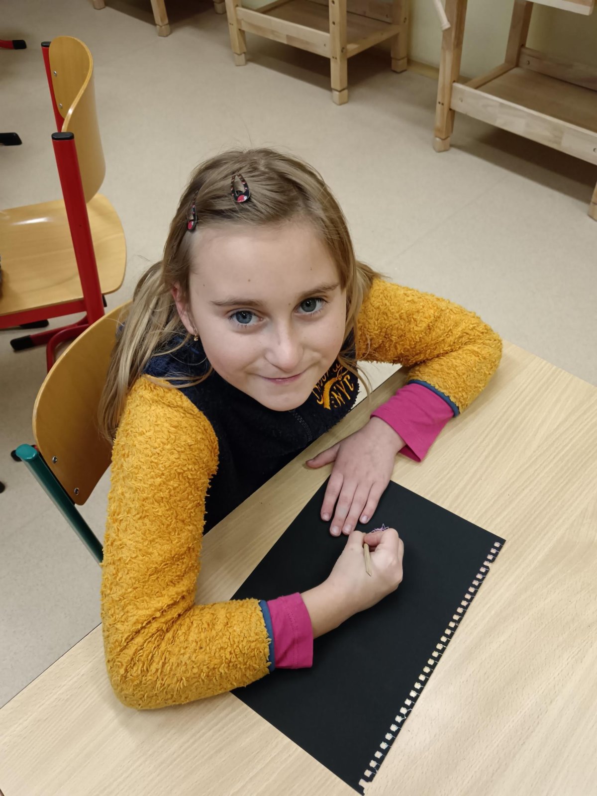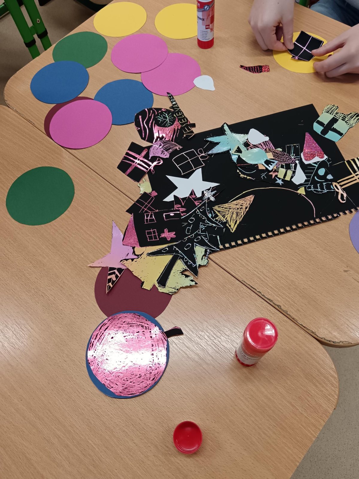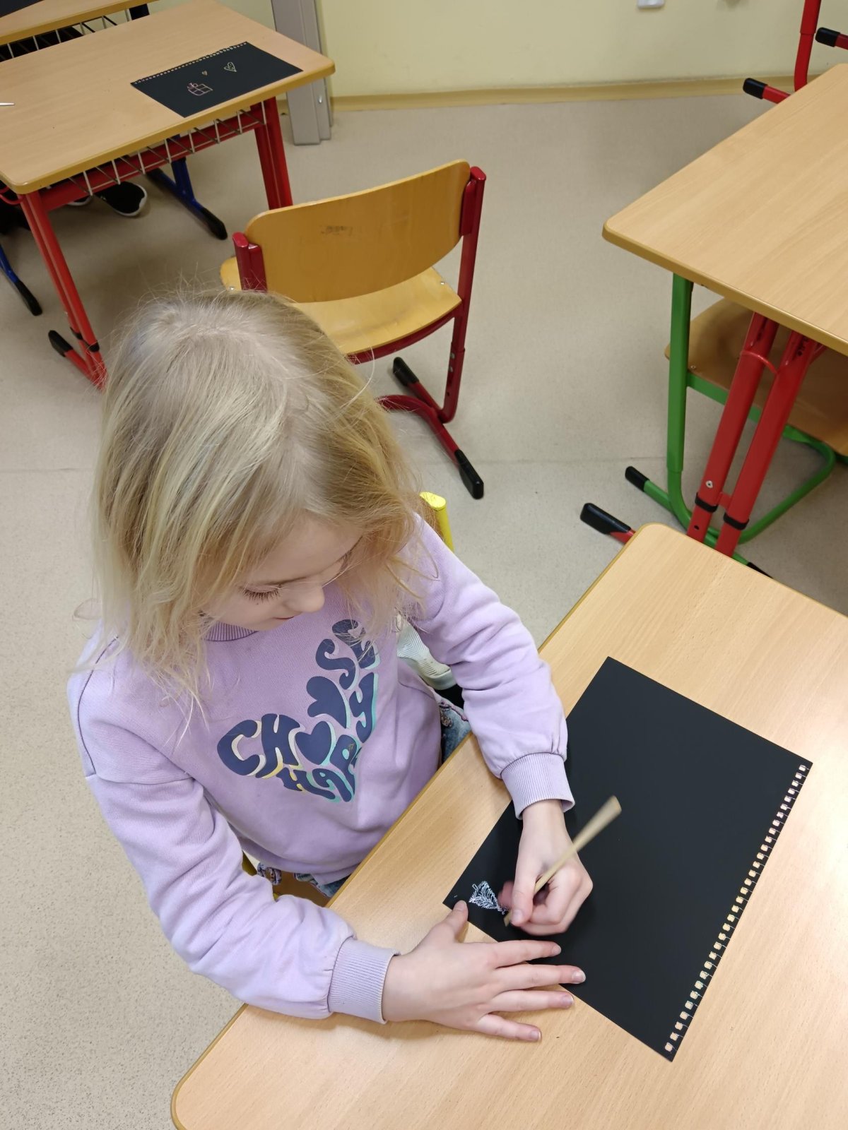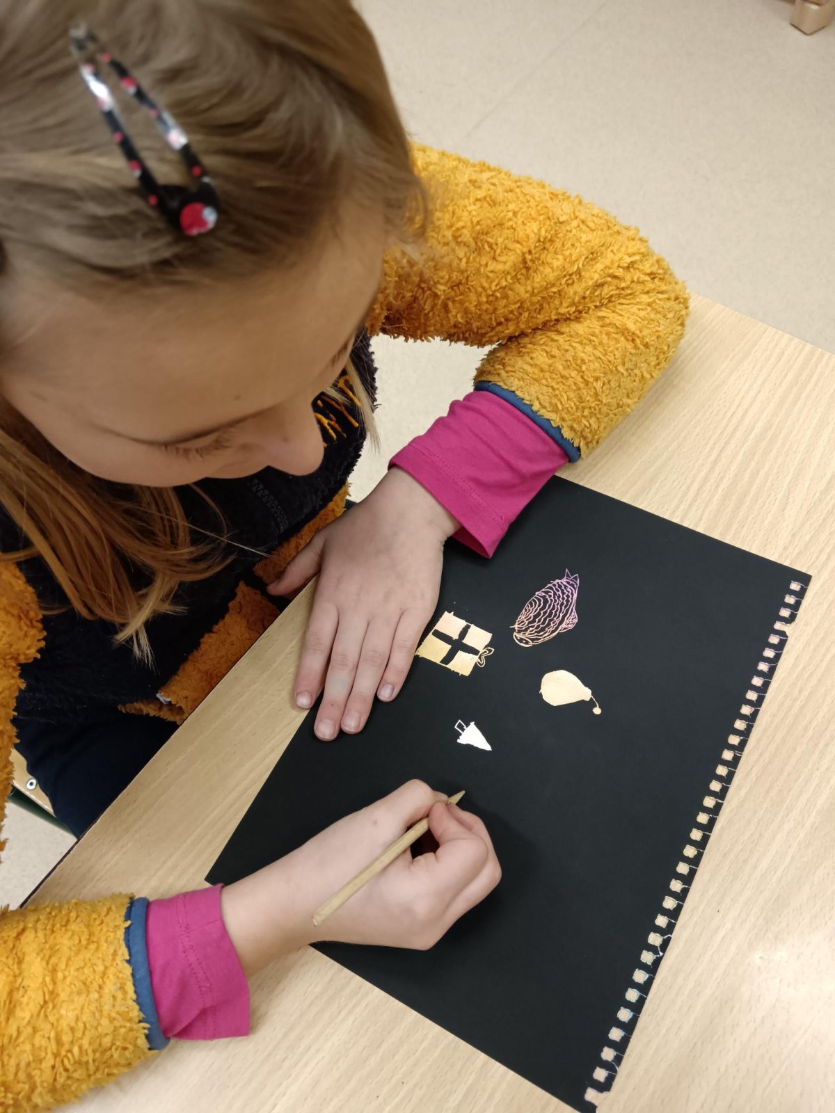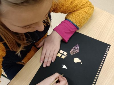 Děti vyráběly vánoční ozdoby na stromeček pomocí vyškrabávacích obrázků. Vytvořily se tak barevné a originální motivy. S radostí objevovaly skryté barvy pod černou vrstvou a každá ozdoba tak získala jedinečný vzhled.