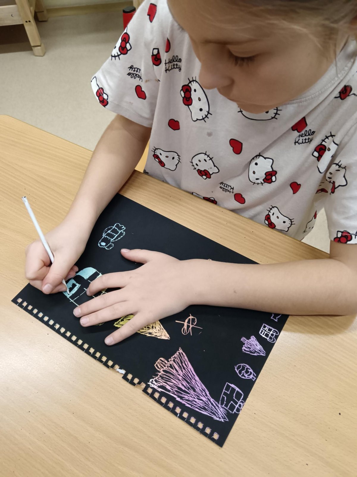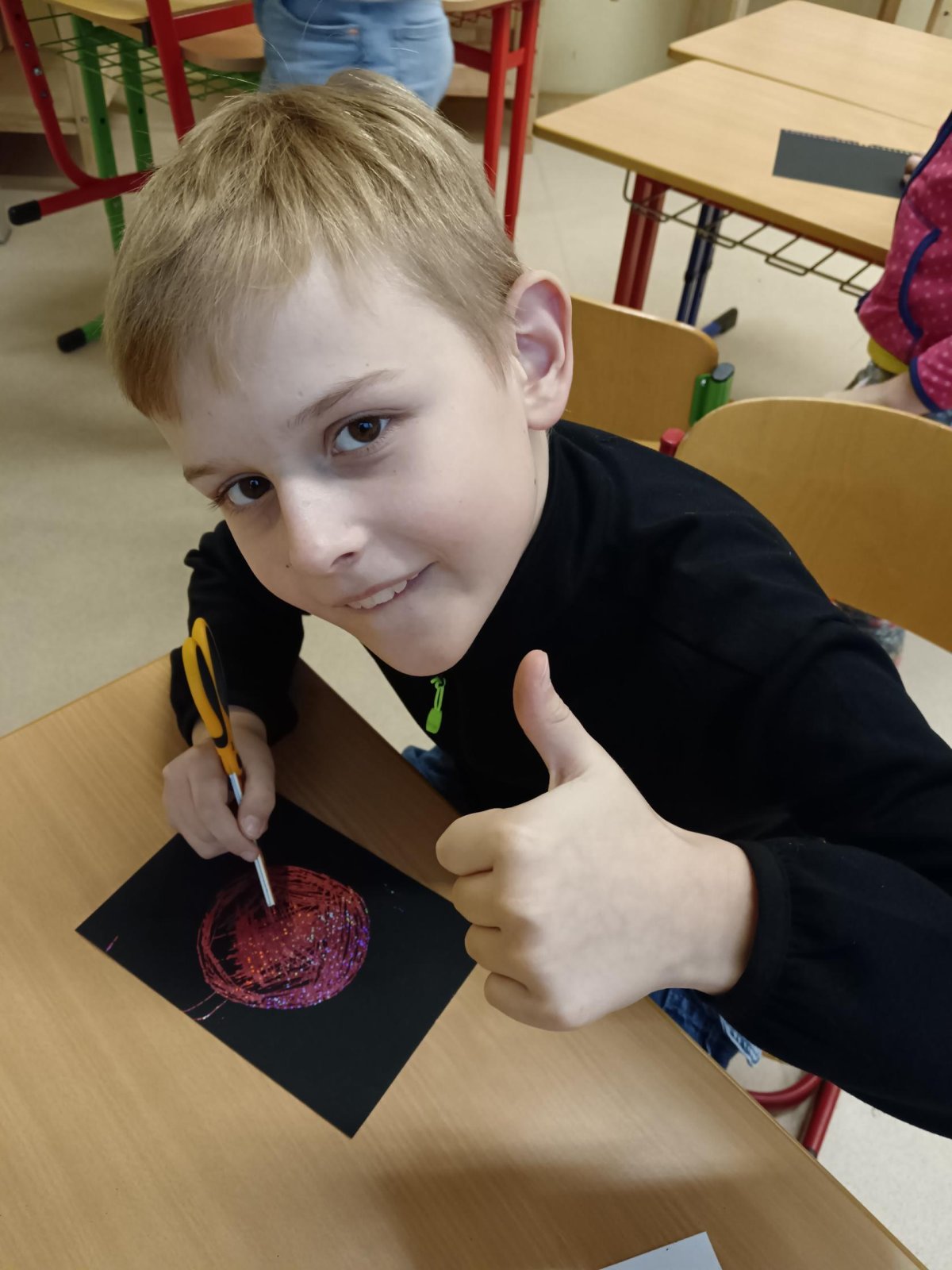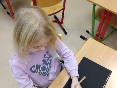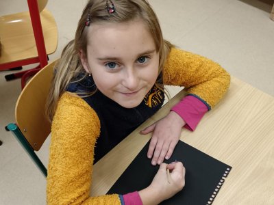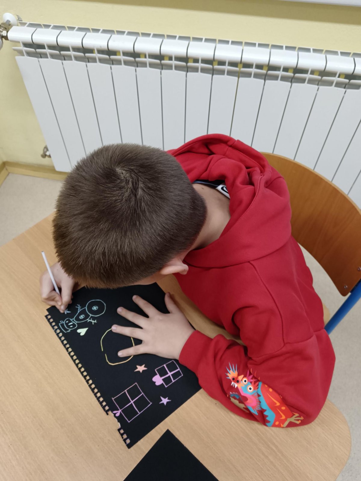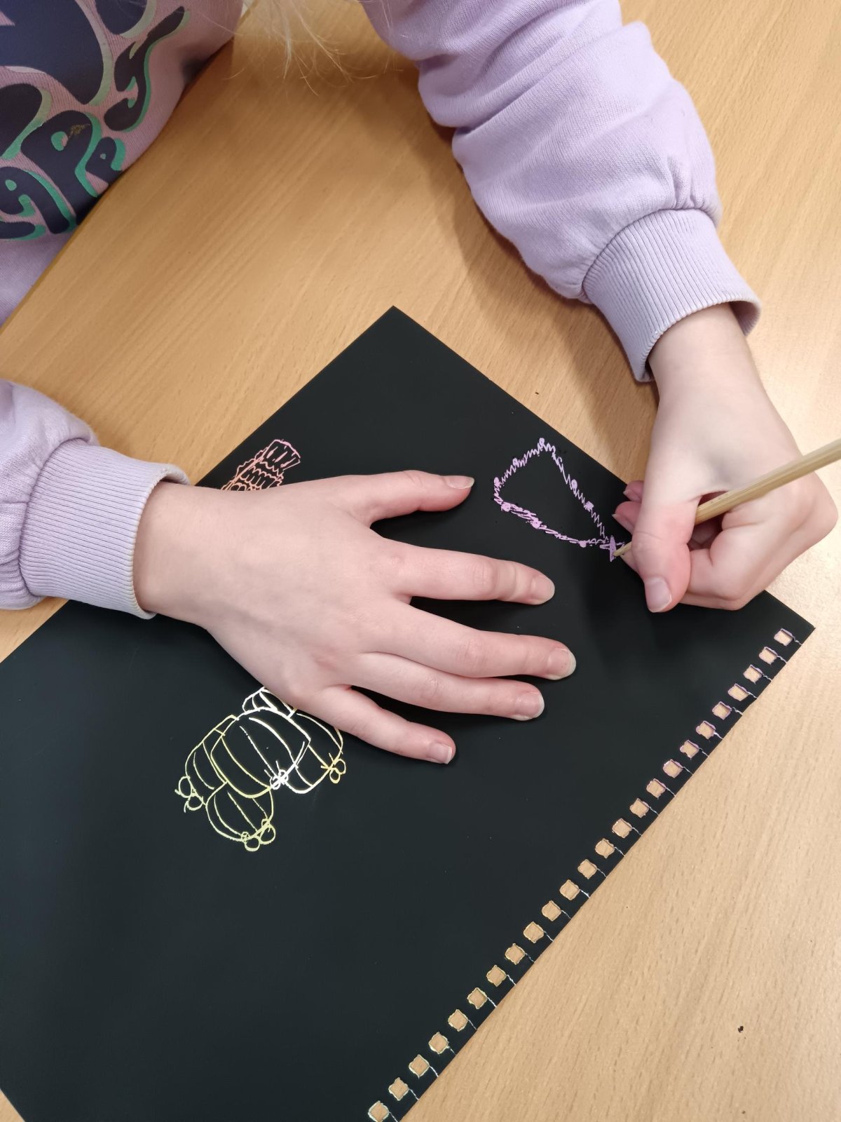 Děti vyráběly vánoční ozdoby na stromeček pomocí vyškrabávacích obrázků. Vytvořily se tak barevné a originální motivy. S radostí objevovaly skryté barvy pod černou vrstvou a každá ozdoba tak získala jedinečný vzhled.