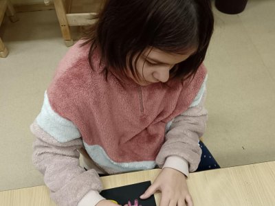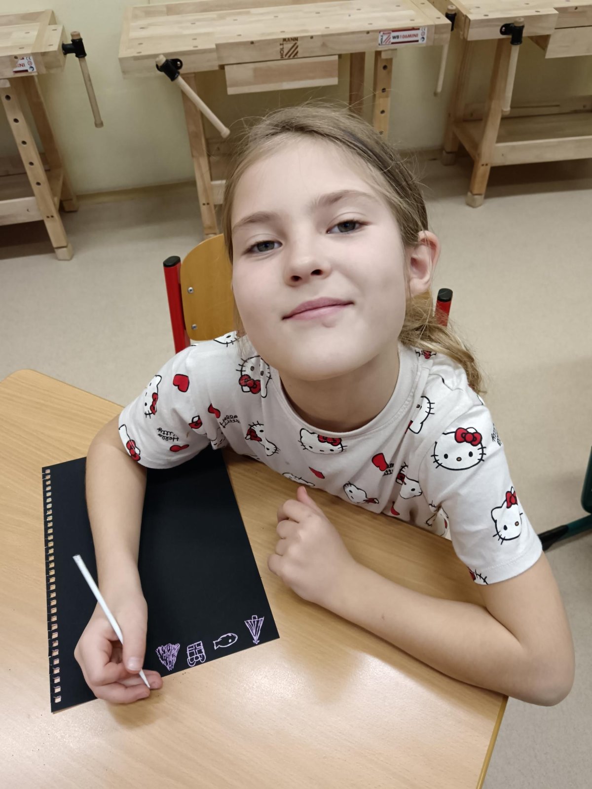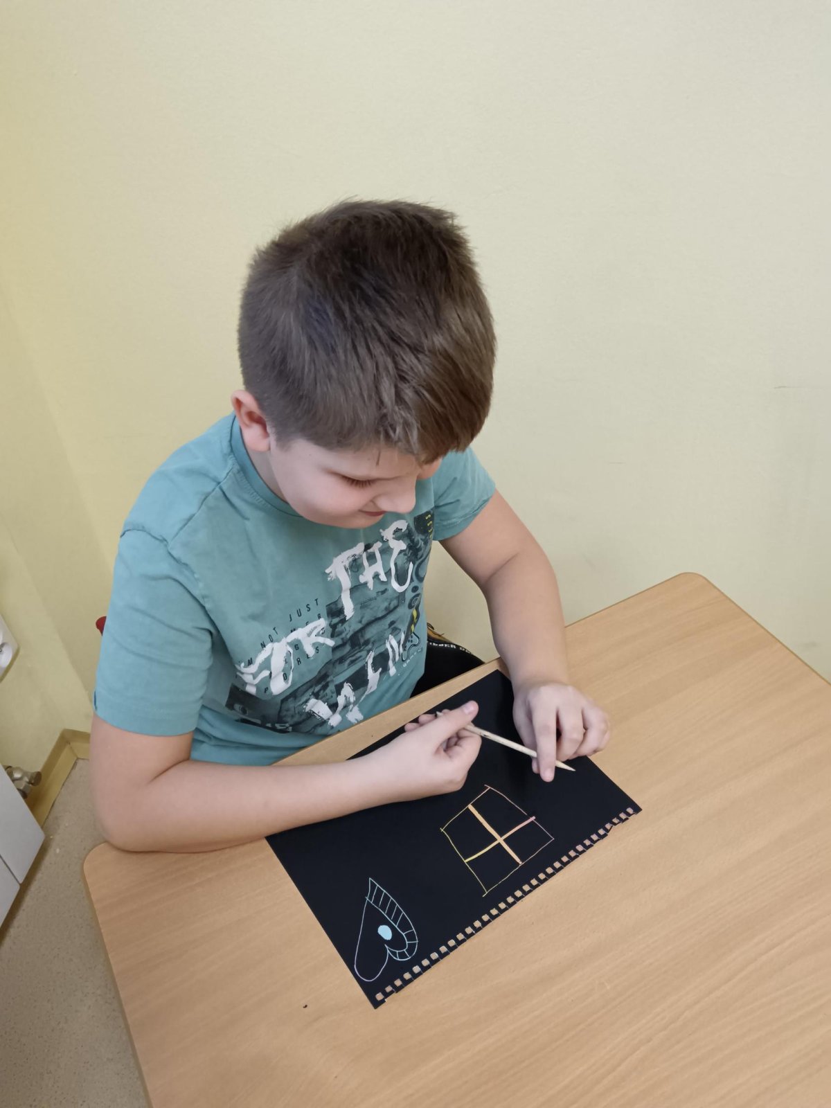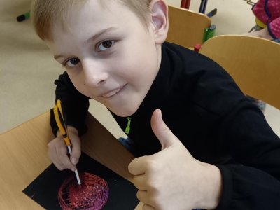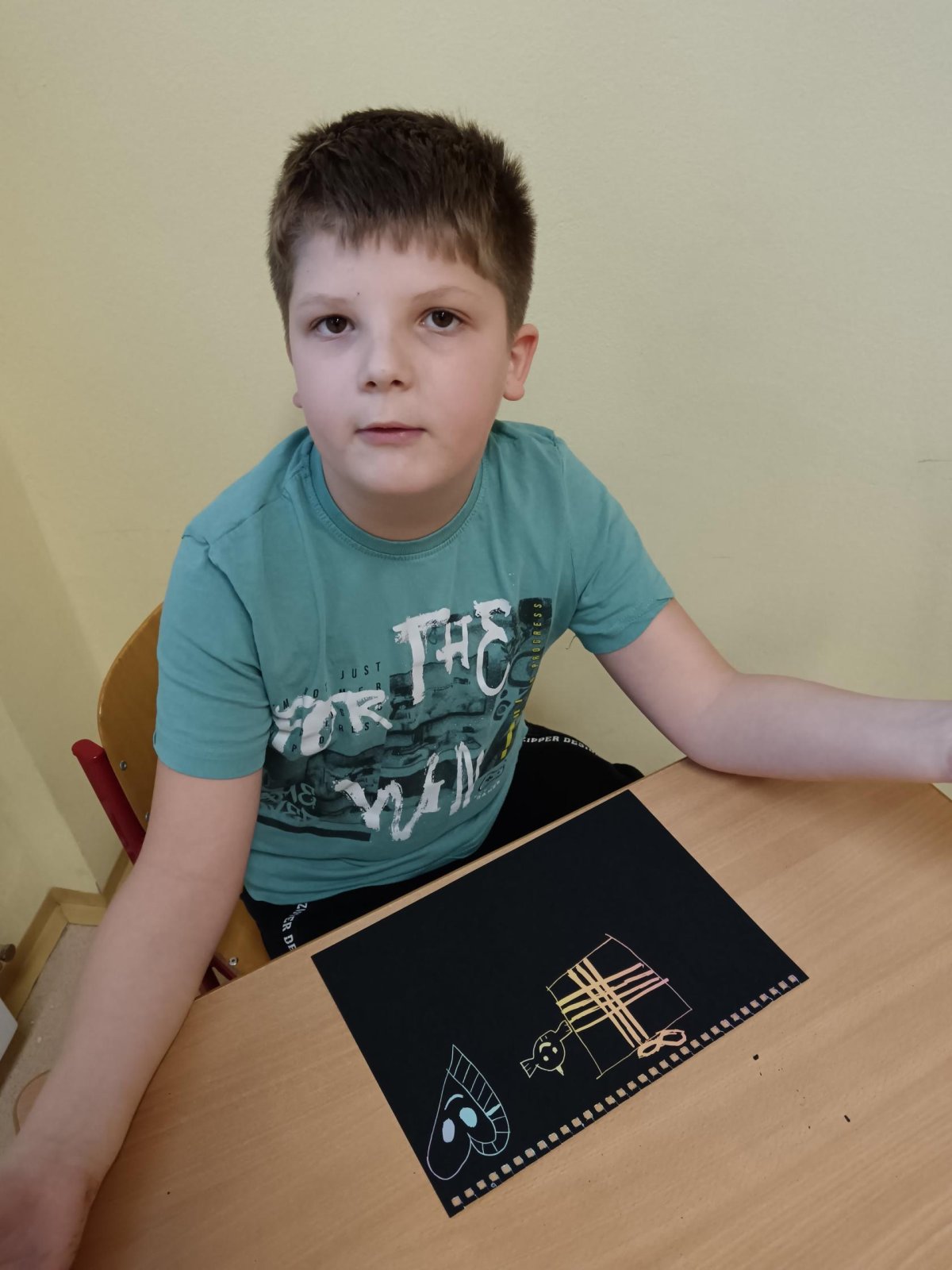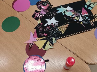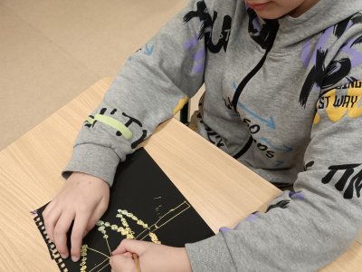 Děti vyráběly vánoční ozdoby na stromeček pomocí vyškrabávacích obrázků. Vytvořily se tak barevné a originální motivy. S radostí objevovaly skryté barvy pod černou vrstvou a každá ozdoba tak získala jedinečný vzhled.