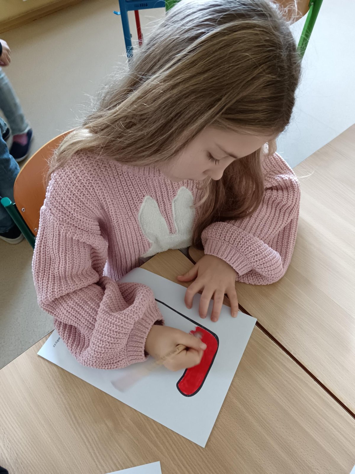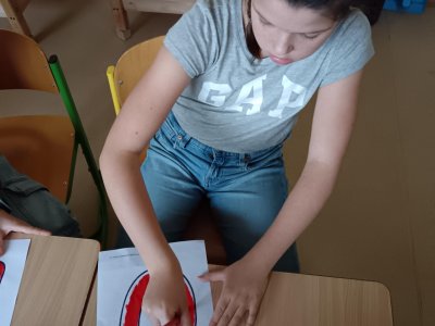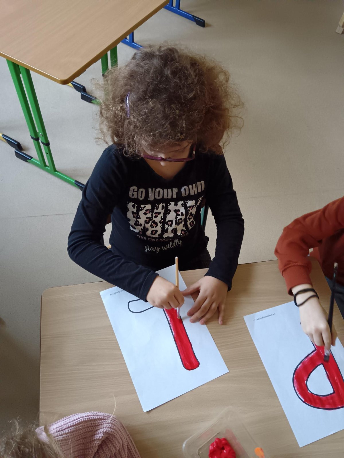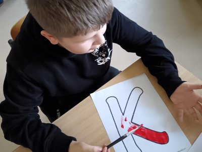 Děti se podílely na výrobě velkého nápisu PEKLO, který bude zdobit čertovskou scénu. S nadšením vybarvovaly písmenka, aby vznikl působivý a strašidelný nápis. Celá výroba probíhala v příjemné atmosféře.