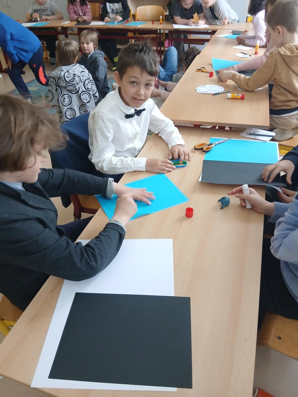 Při práci děti využily více druhů materiálů – barevné papíry, krepový papír, flis, vatu, fixy i další pomůcky. Rozvíjely tak svou fantazii, jemnou motoriku i smysl pro detail.