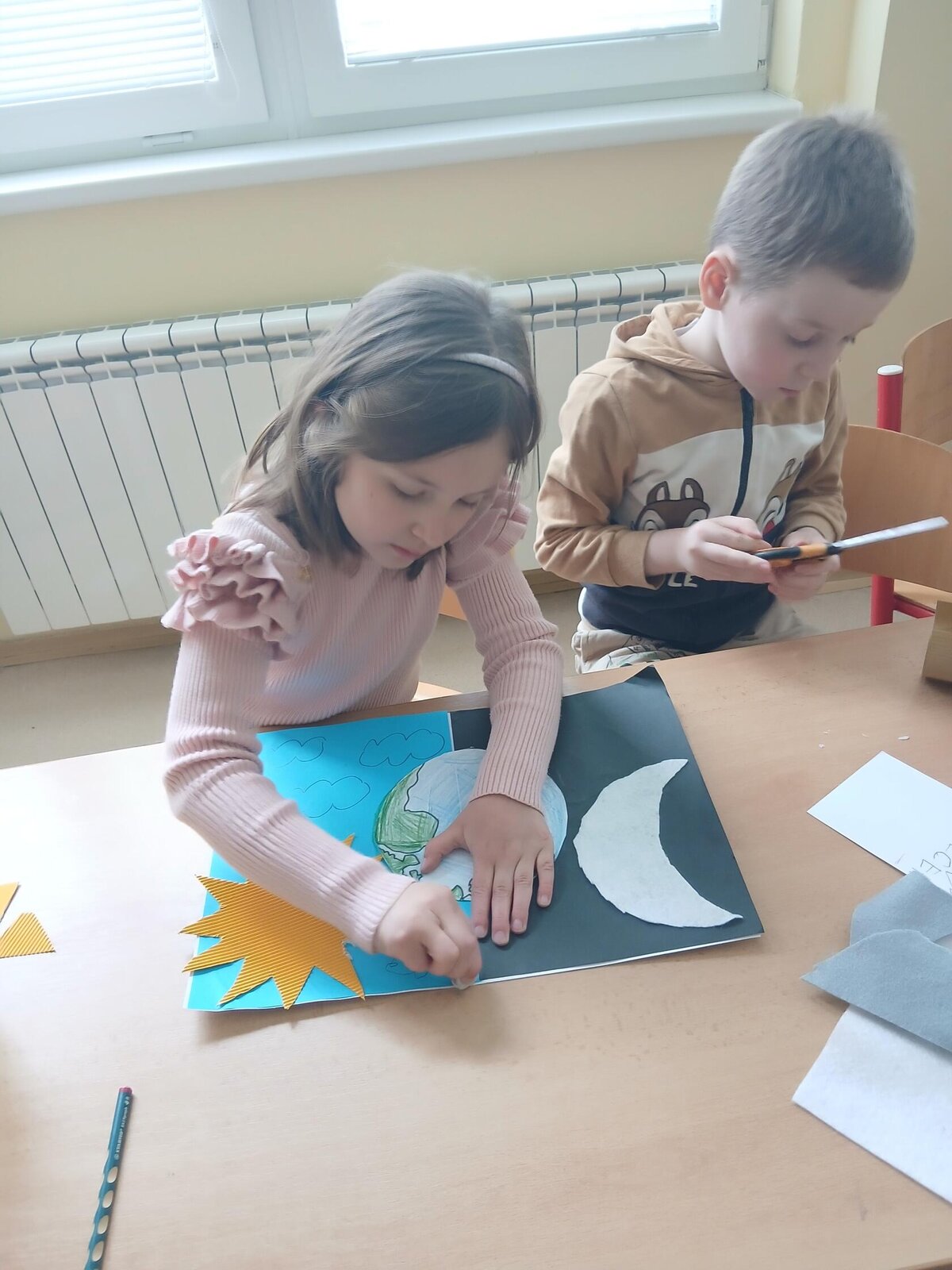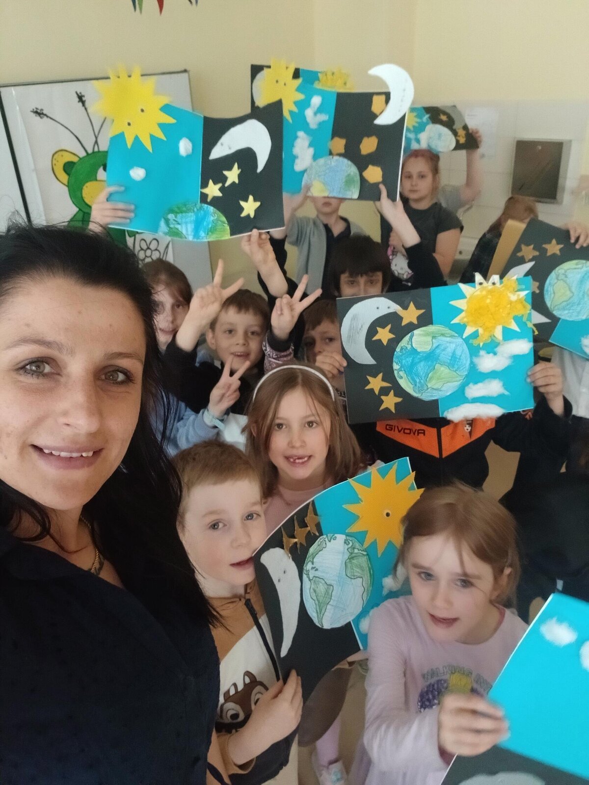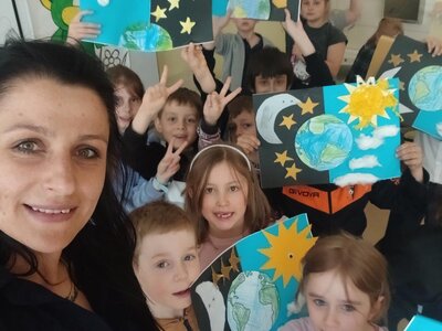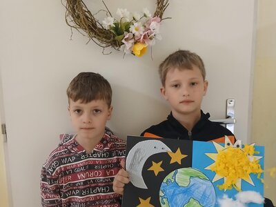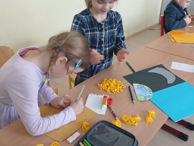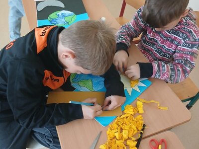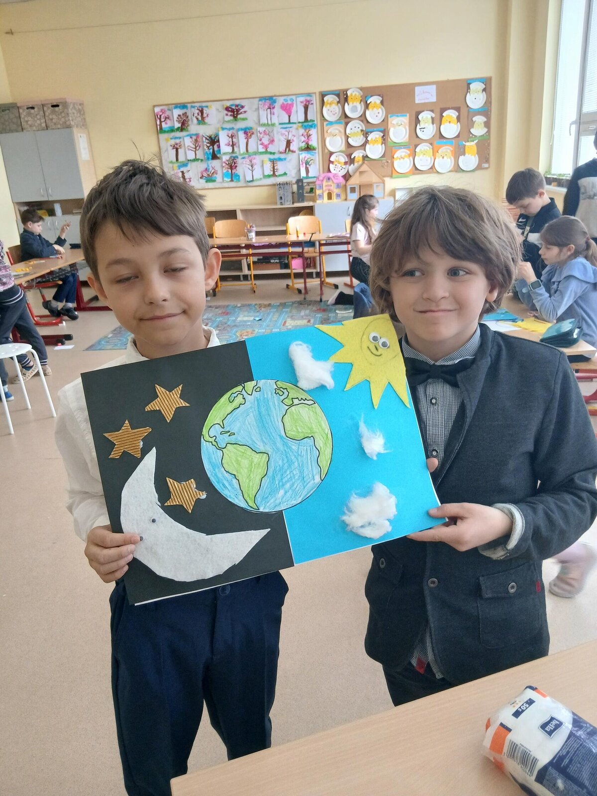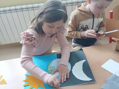 Děti se pustily do tvoření originálního obrázku, který znázorňuje naši planetu Zemi rozdělenou na den a noc. Na jedné straně nechybí měsíc a hvězdy, na druhé září sluníčko a obláčky.