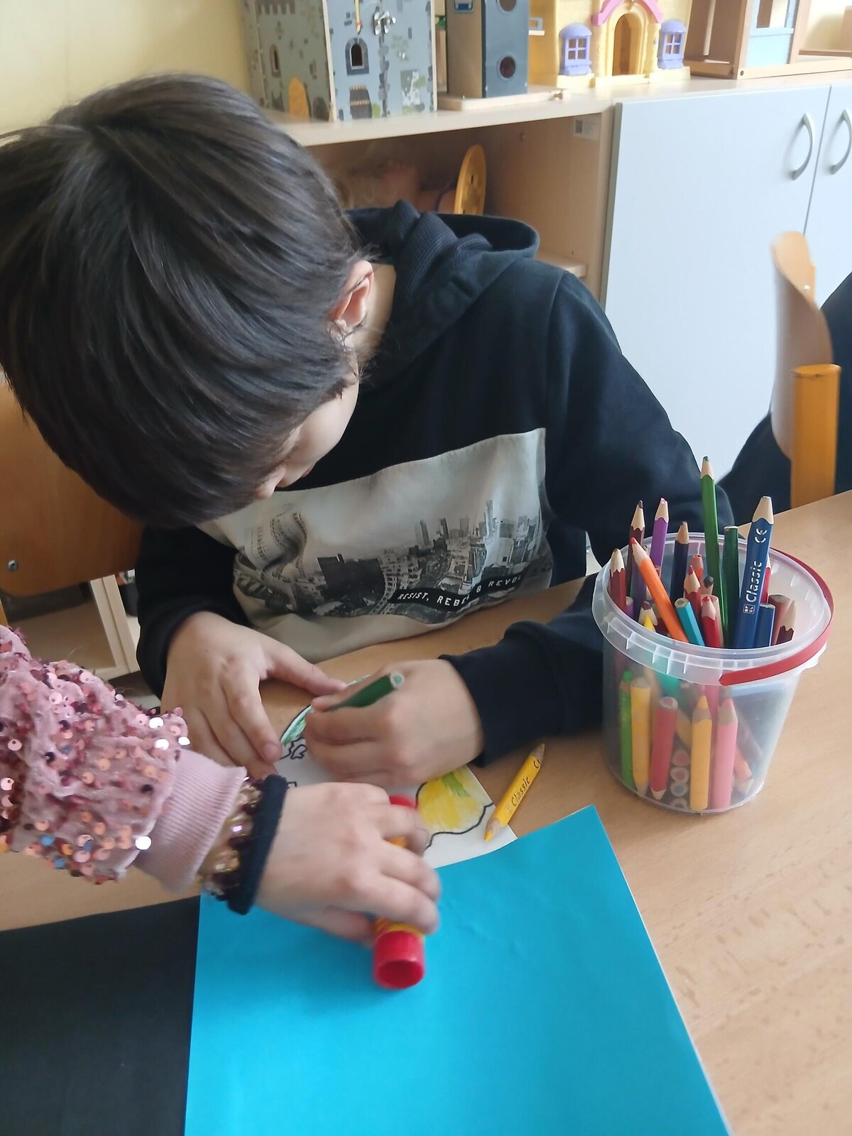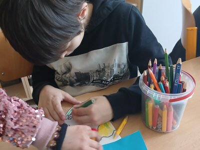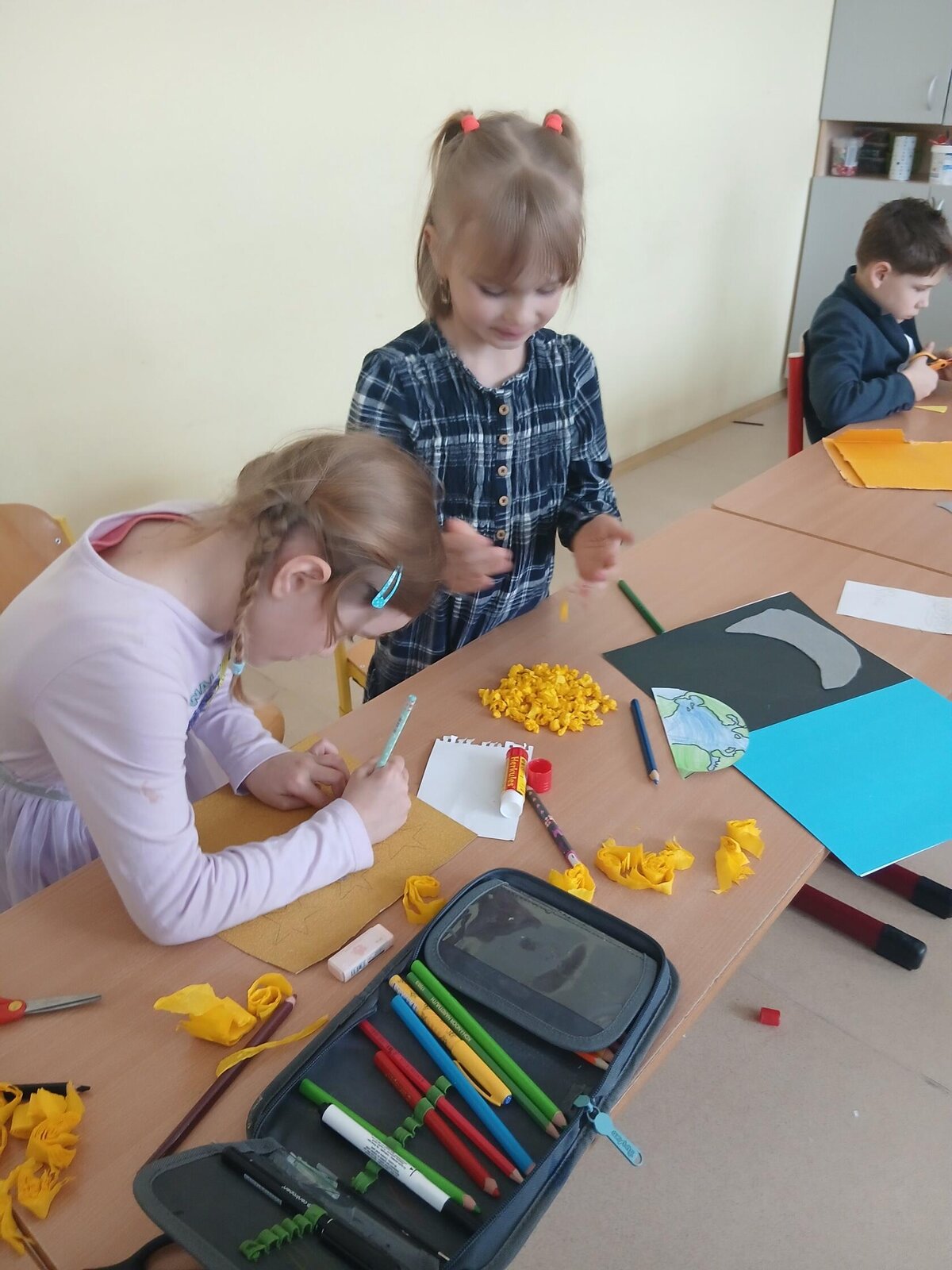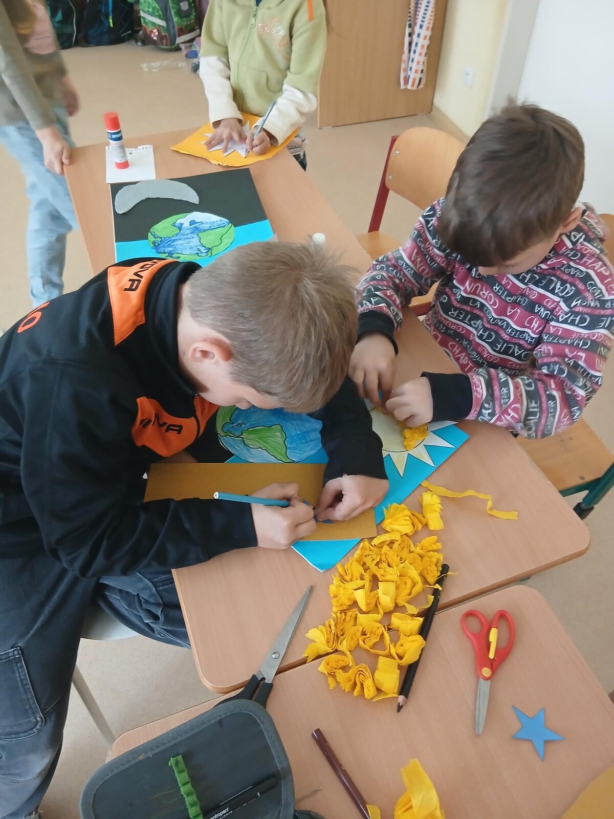 Děti se pustily do tvoření originálního obrázku, který znázorňuje naši planetu Zemi rozdělenou na den a noc. Na jedné straně nechybí měsíc a hvězdy, na druhé září sluníčko a obláčky.