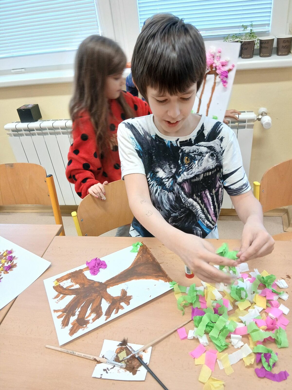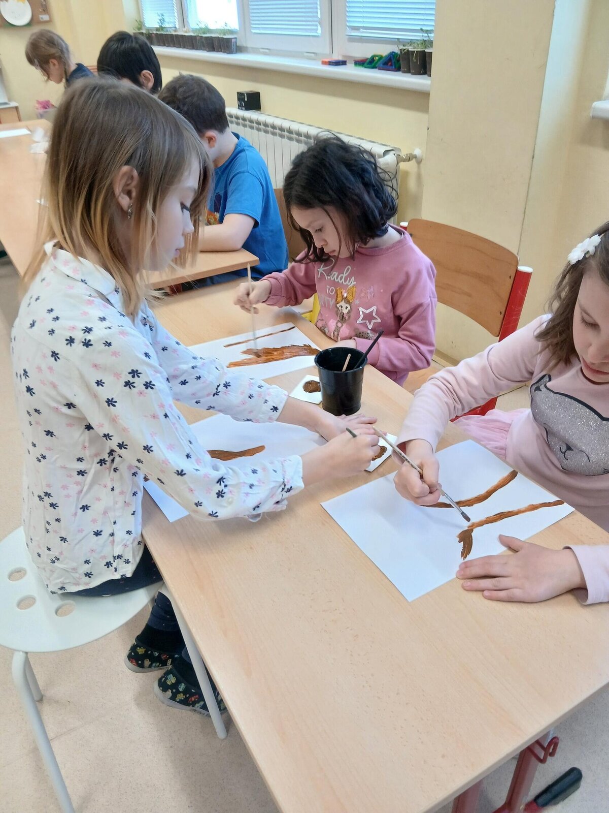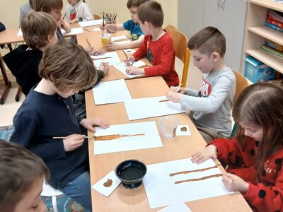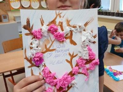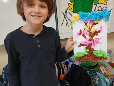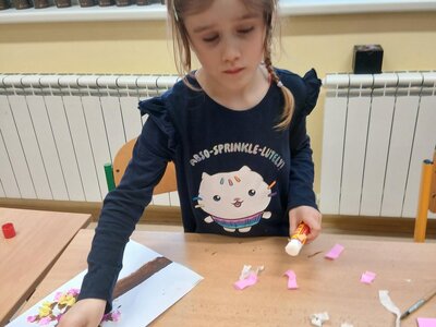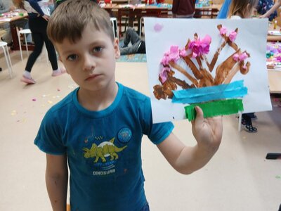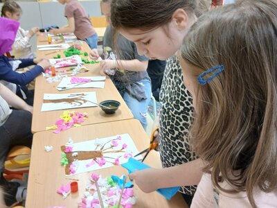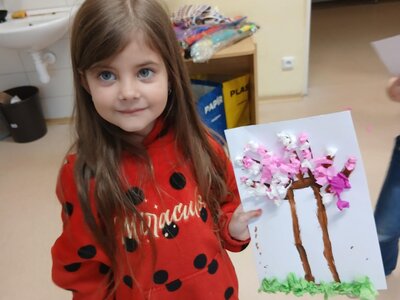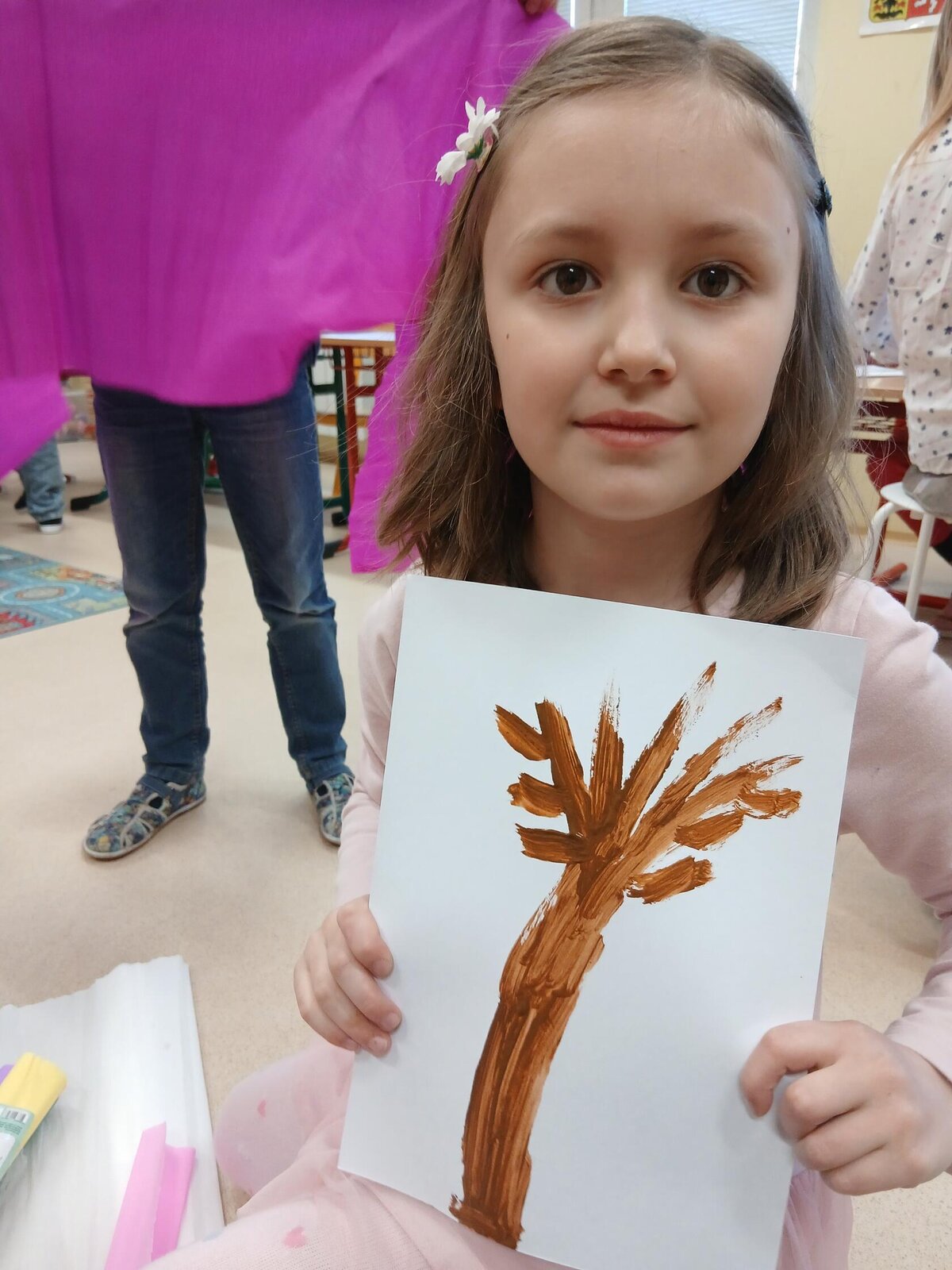Ve školní družině jsme se věnovali jarnímu tvoření a výsledkem jsou krásné obrázky rozkvetlých stromů. Děti si nejprve namalovaly kmen a větve stromu, které následně ozdobily květy z mačkaného papíru. Kombinací růžové a bílé barvy vznikly něžné jarní květy, které dodaly obrázkům veselý a svěží vzhled.