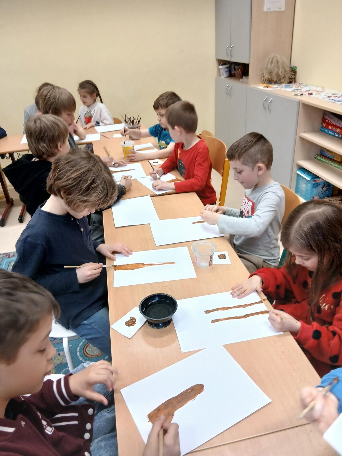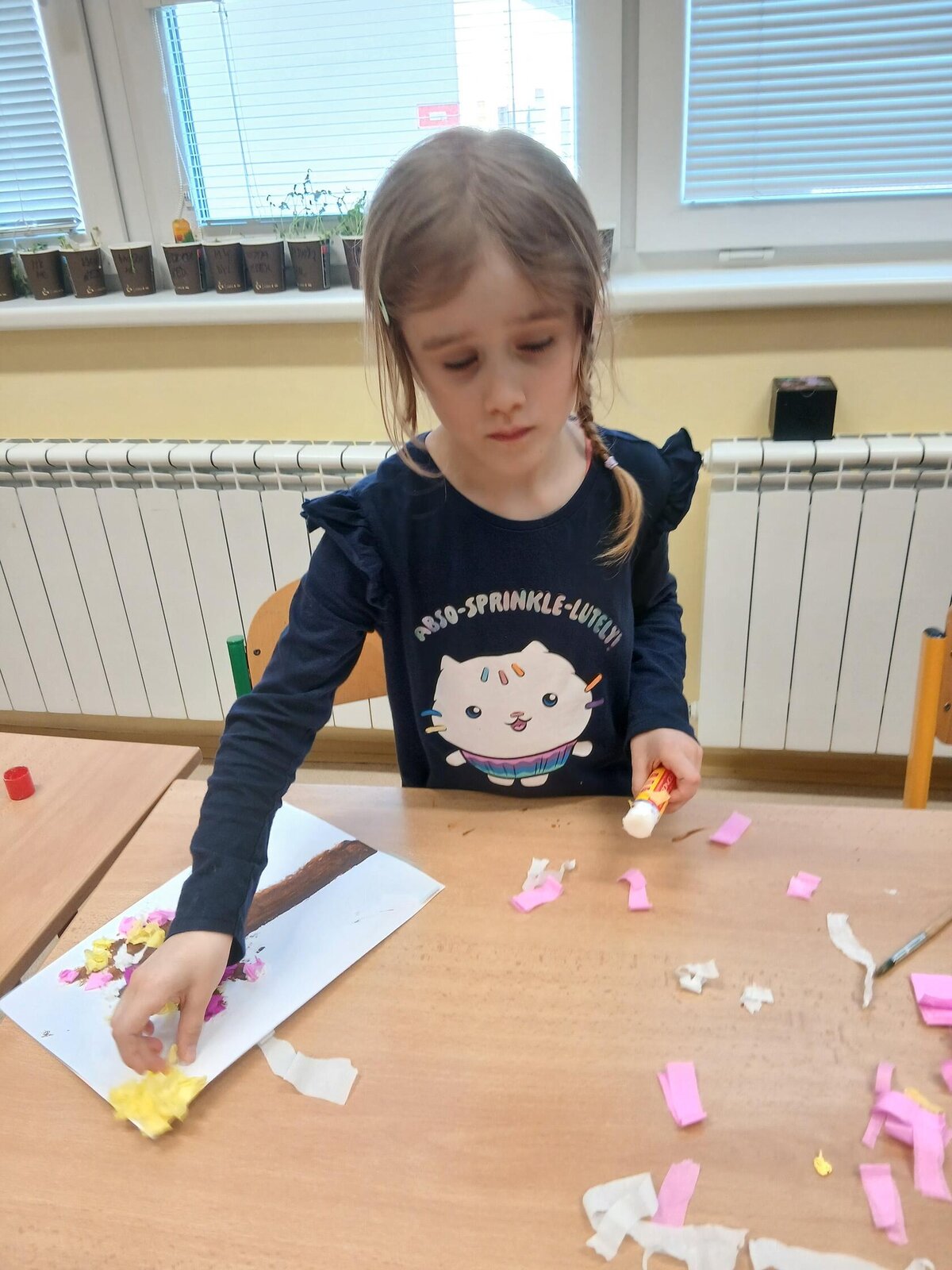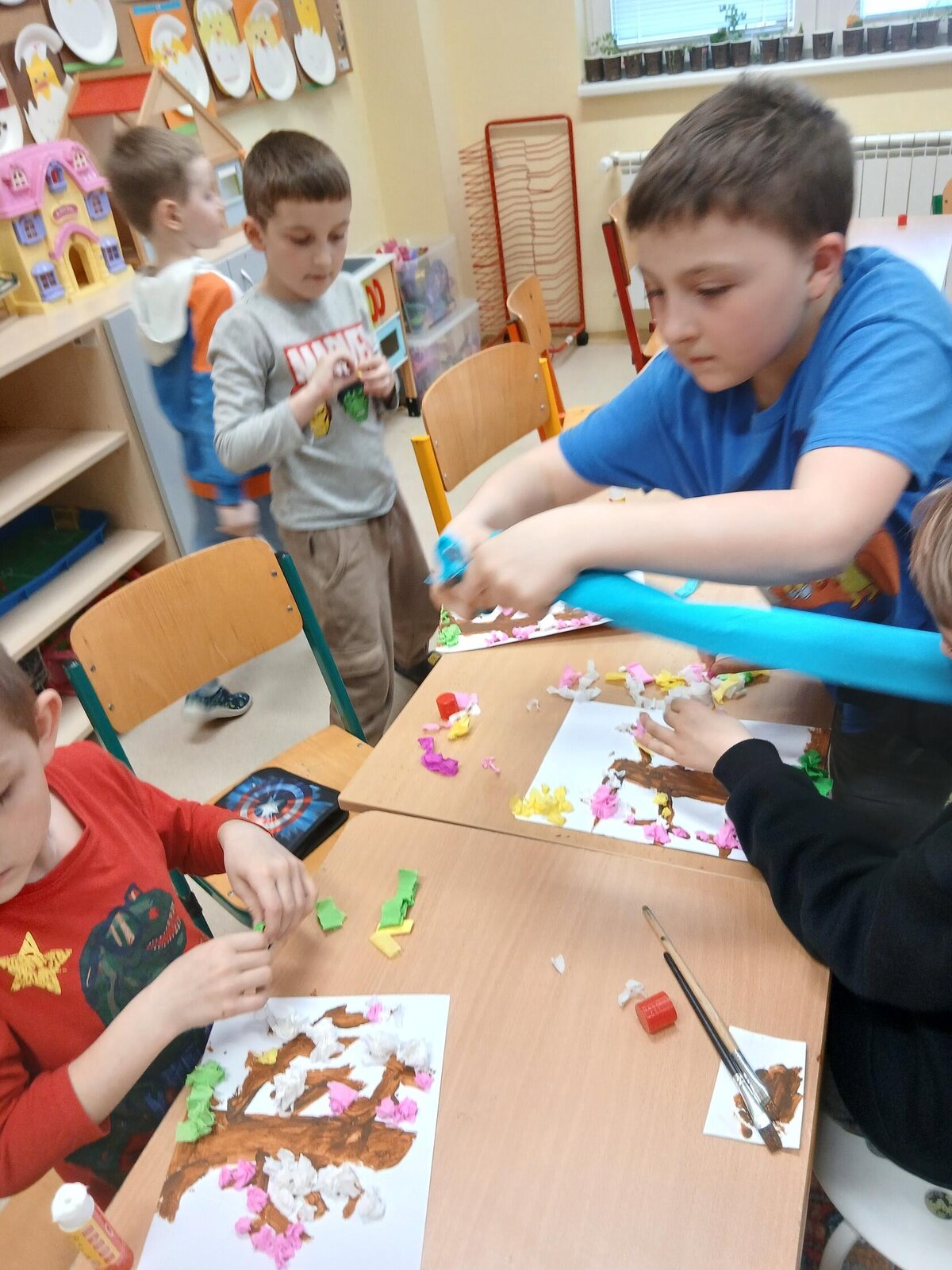 Ve školní družině jsme se věnovali jarnímu tvoření a výsledkem jsou krásné obrázky rozkvetlých stromů. Děti si nejprve namalovaly kmen a větve stromu, které následně ozdobily květy z mačkaného papíru. Kombinací růžové a bílé barvy vznikly něžné jarní květy, které dodaly obrázkům veselý a svěží vzhled.