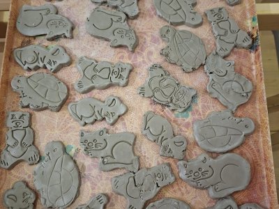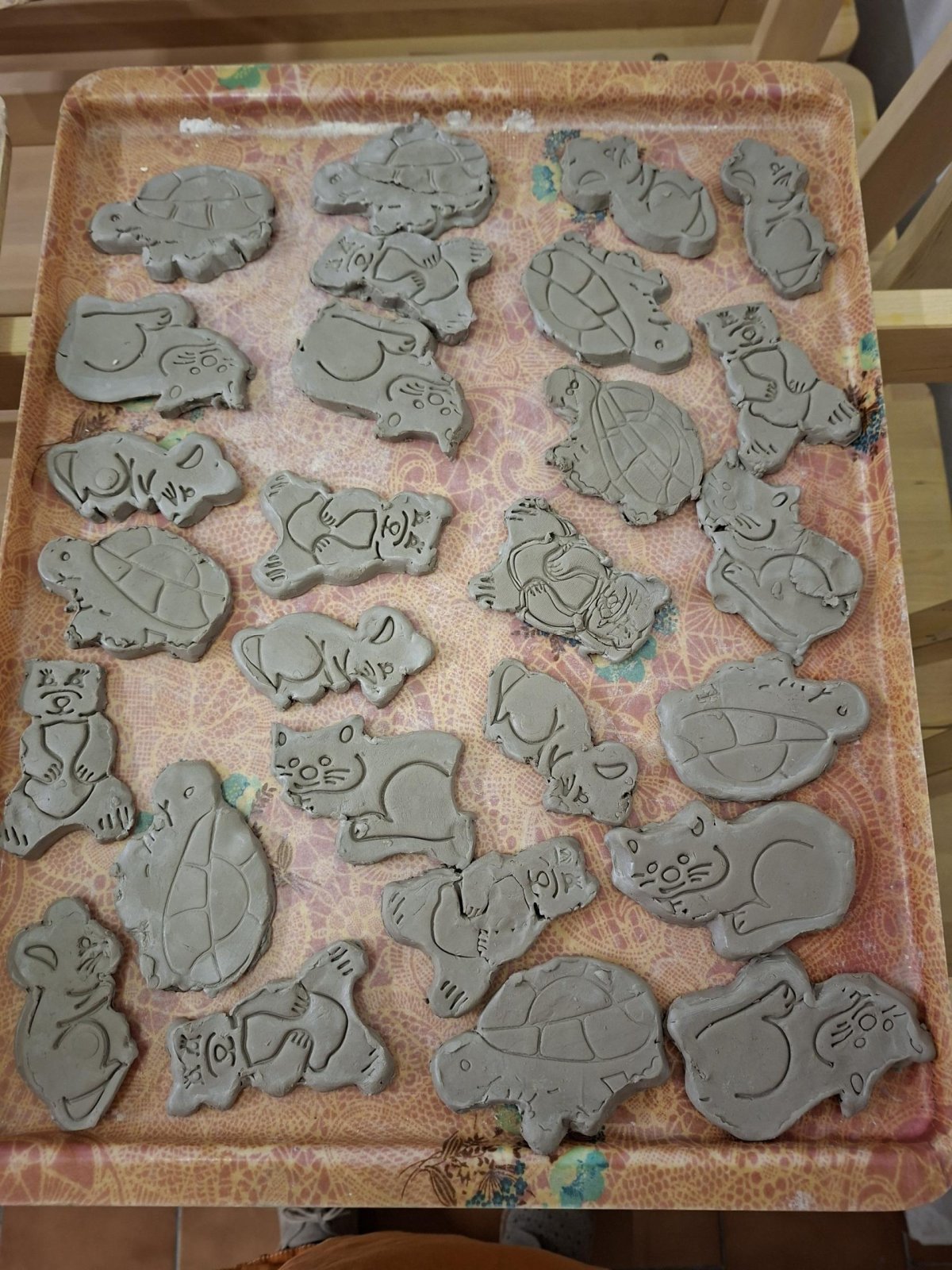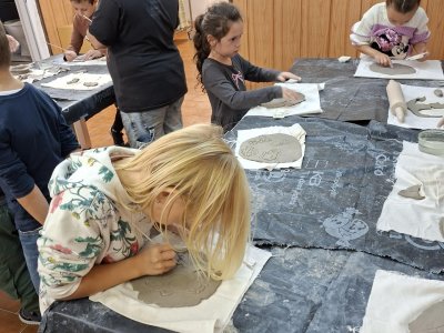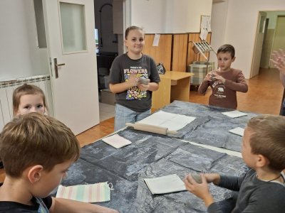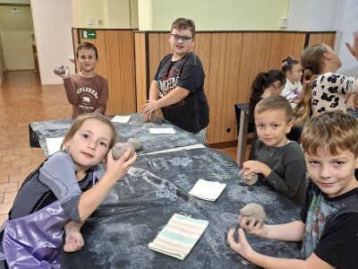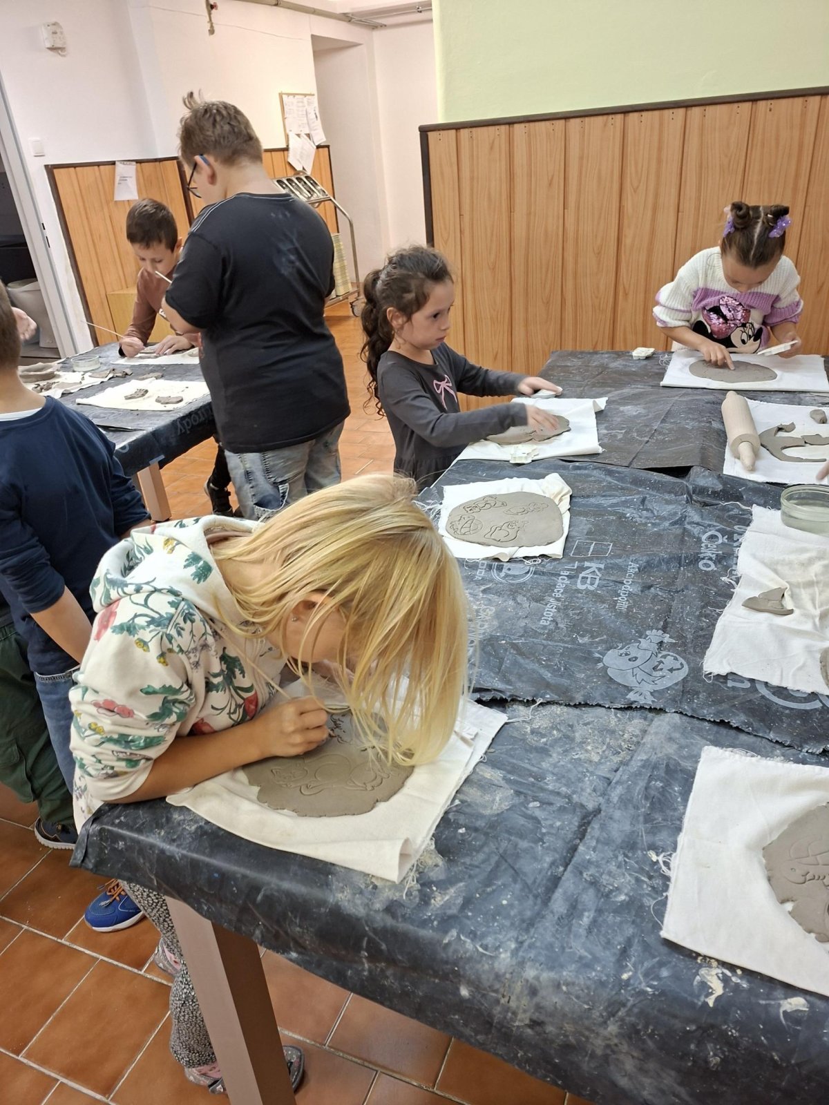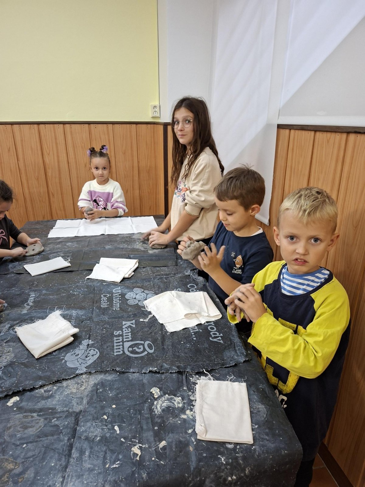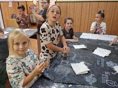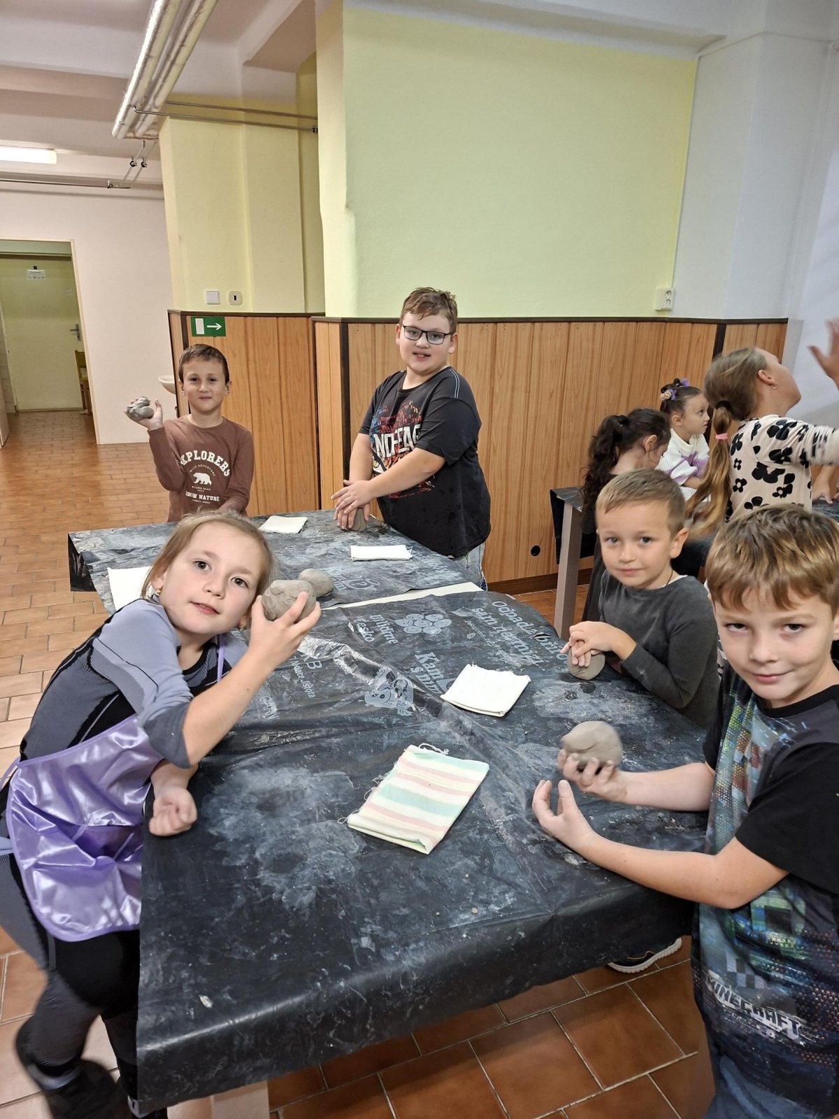 Tak už jsme začali! Ruce i oblečení máme umazané od hlíny, ale baví nás to! Rozjíždíme se opatrně, učíme se připravit si pracoviště, zpracovat si hlínu, osaháváme si nástroje, se kterými budeme pracovat. Doufáme, že se naše příští výrobky budou líbit!