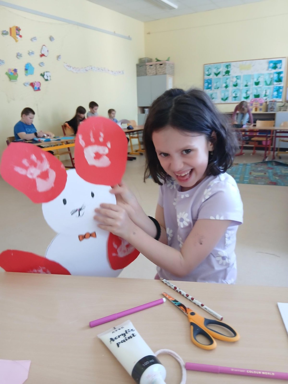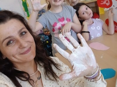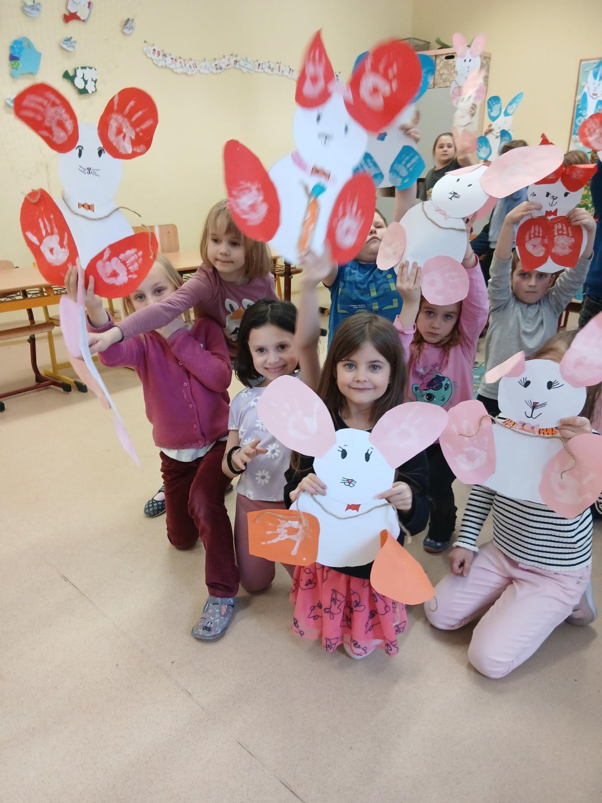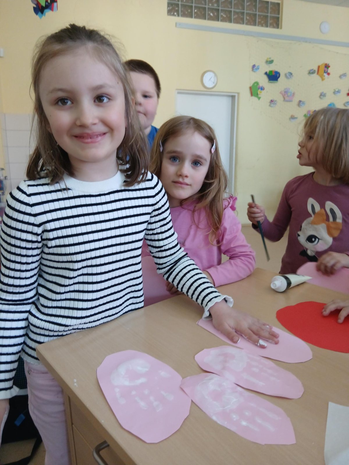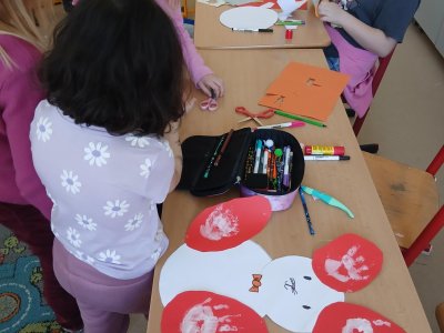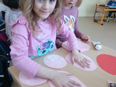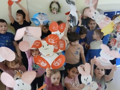 Nejprve si děti připravily základ z papíru, poté pomocí barev vytvořily otisky svých dlaní, které se proměnily v roztomilé detaily zajíčka. Při práci jsme si povídali o velikonočních tradicích a symbolech jara.