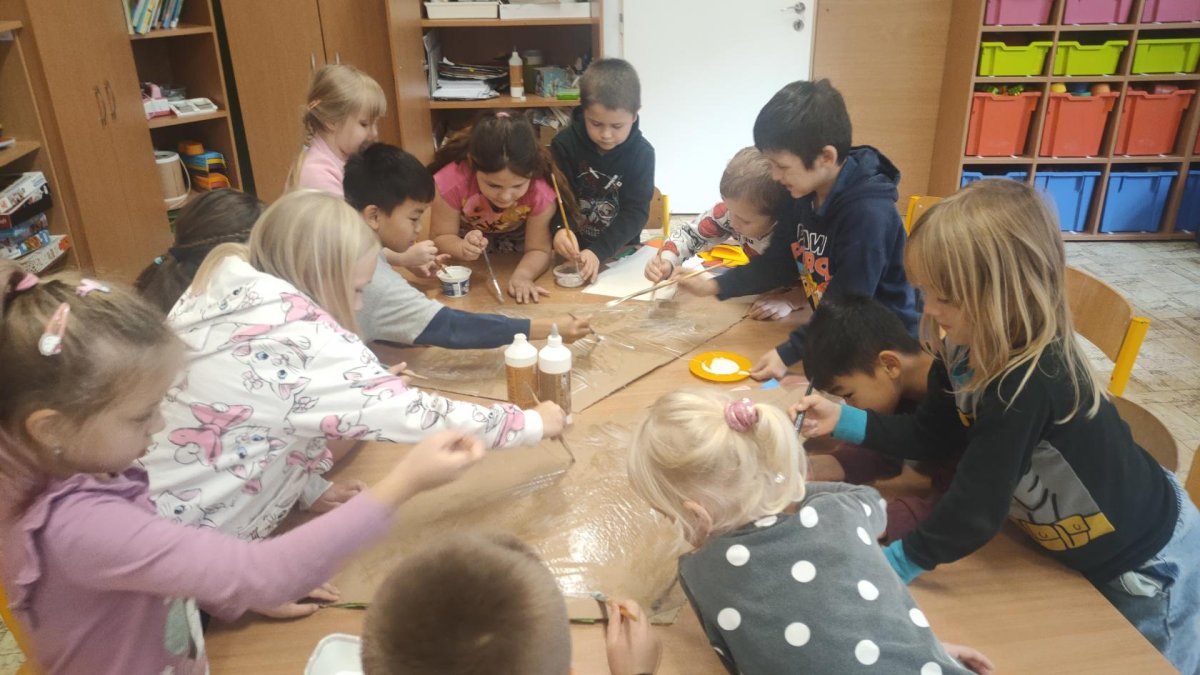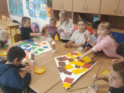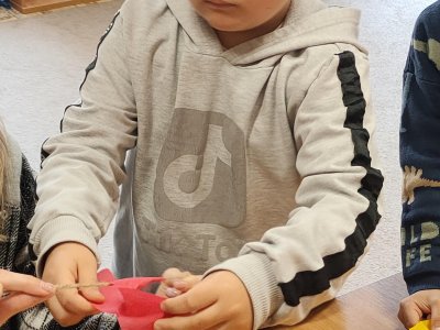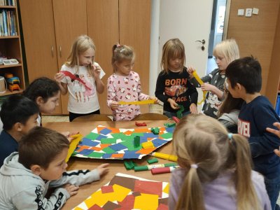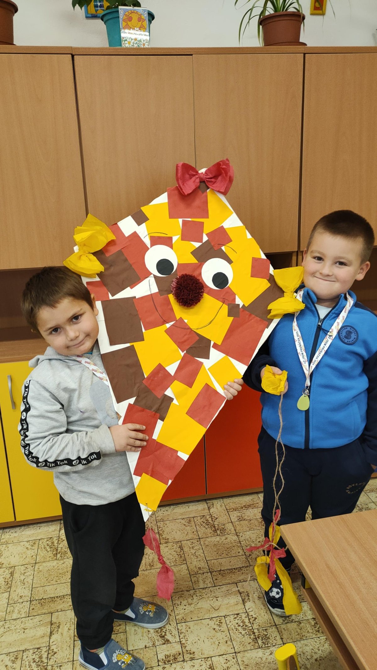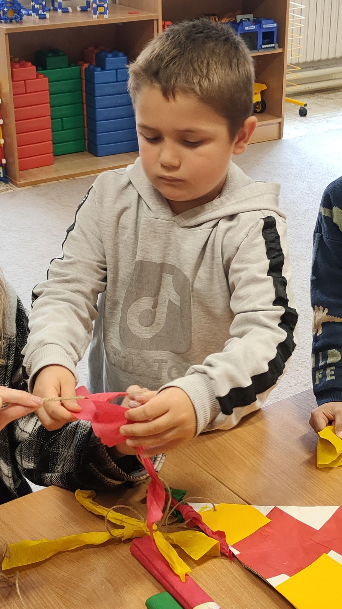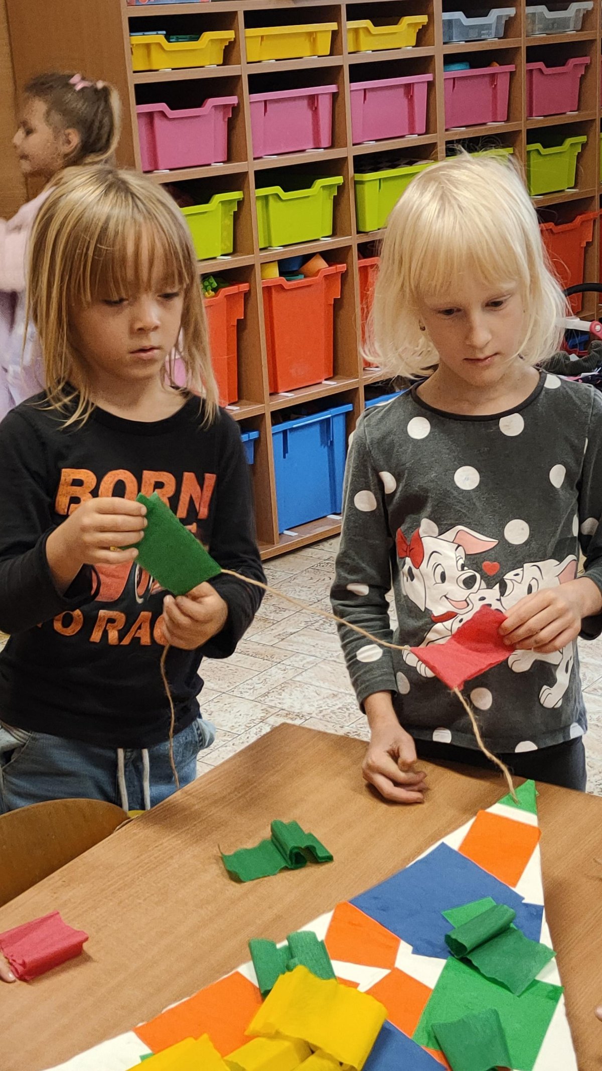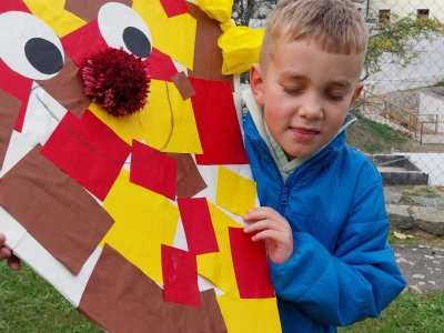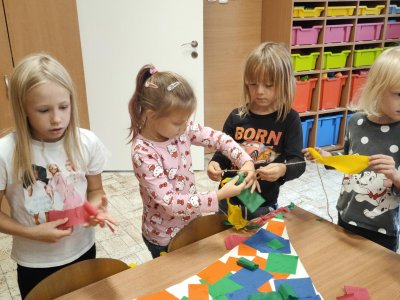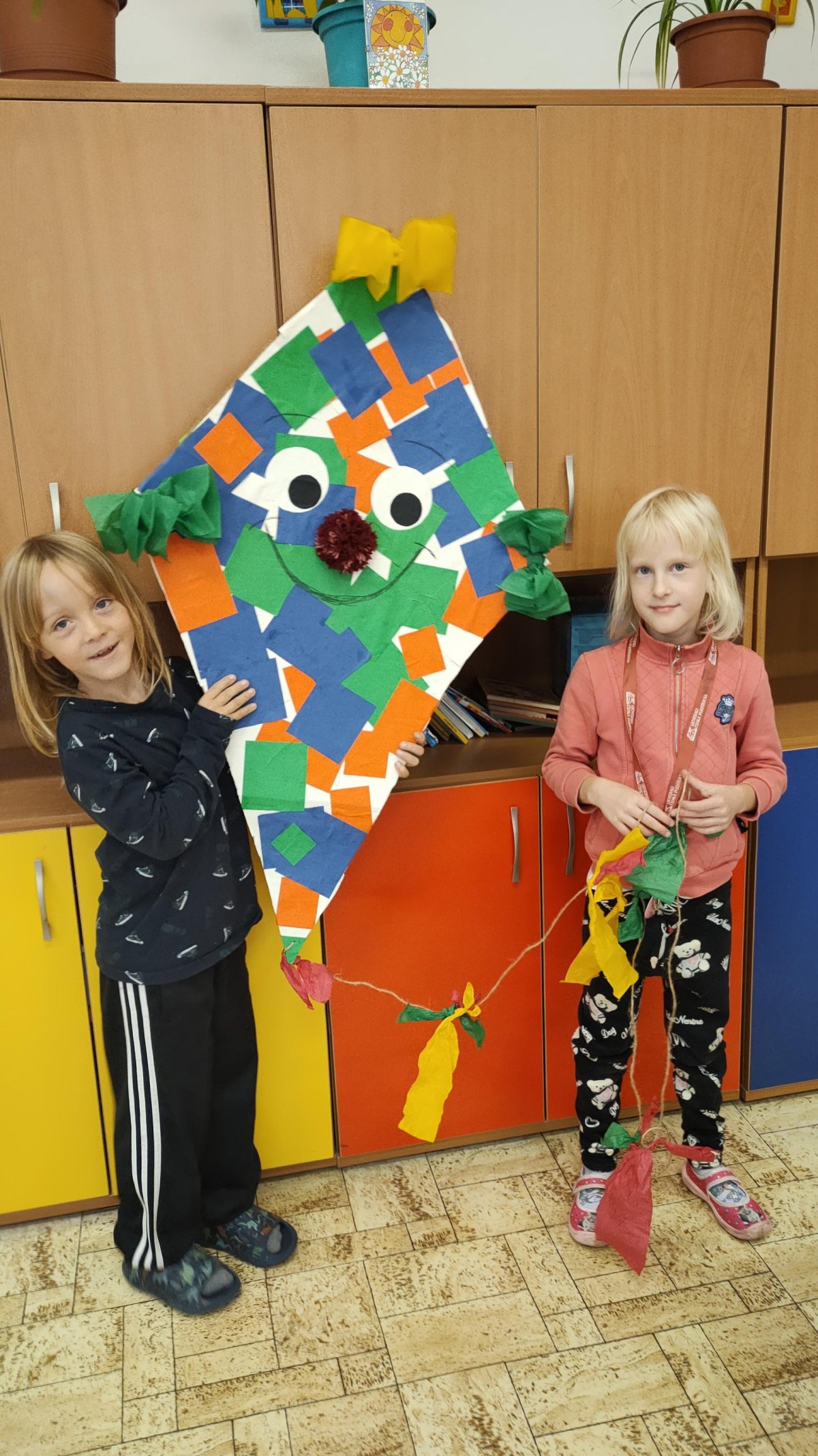 Začali jsme tím, že jsme draky vyřezali z pevného kartonu a polepili světlým papírem. Potom přišlo to nejdůležitější - sladit správně barvy papíru, který bude draky zdobit. Mašle na dračích ocasech nás sice trošku potrápily, ale my jsme si alespoň procvičili vázání uzlíků a mašliček. Teď už se nám budou lépe dařit i ty mašličky na botech.