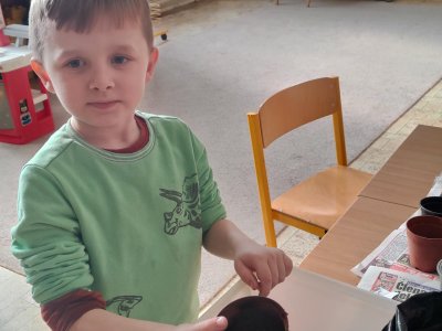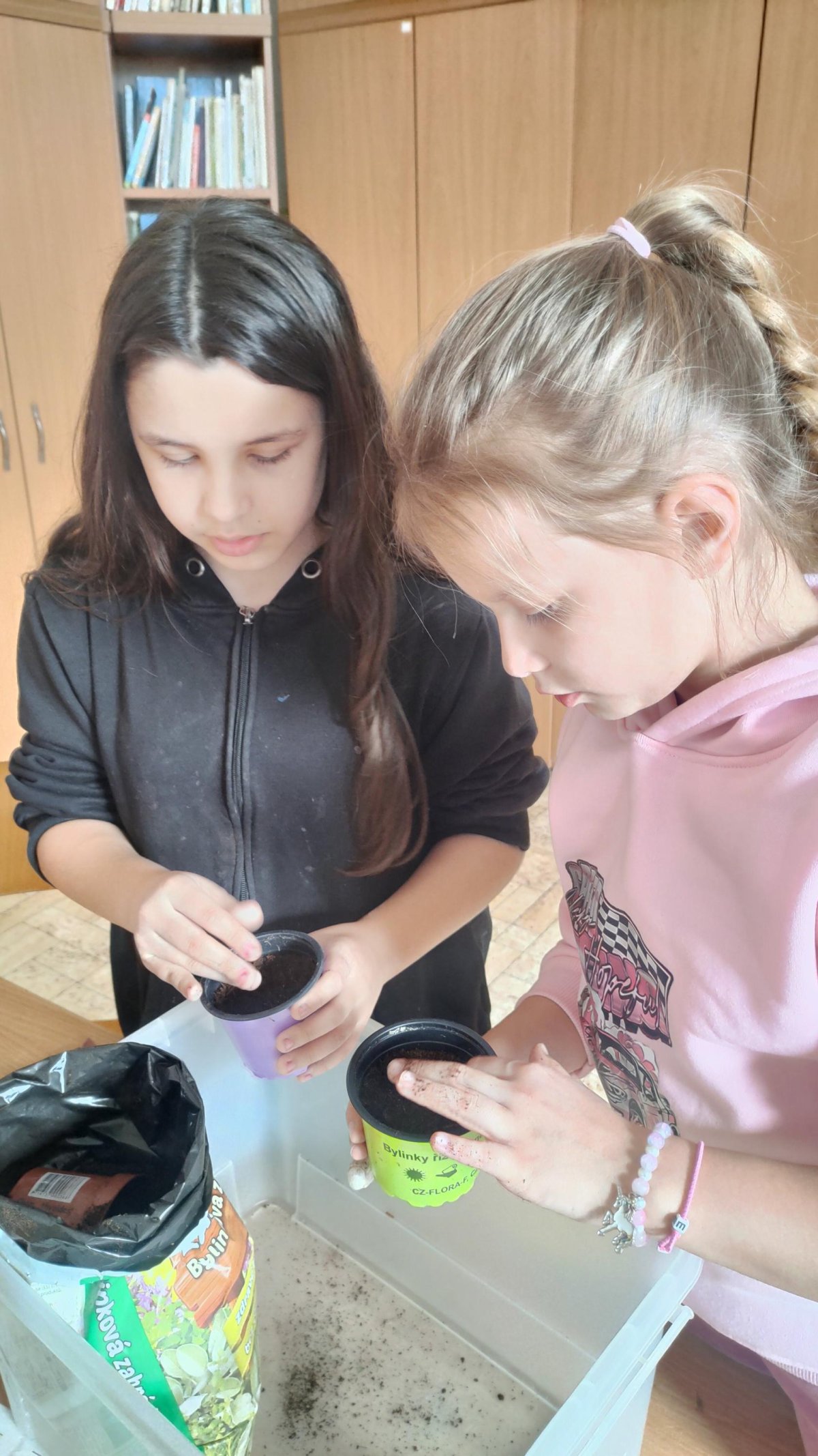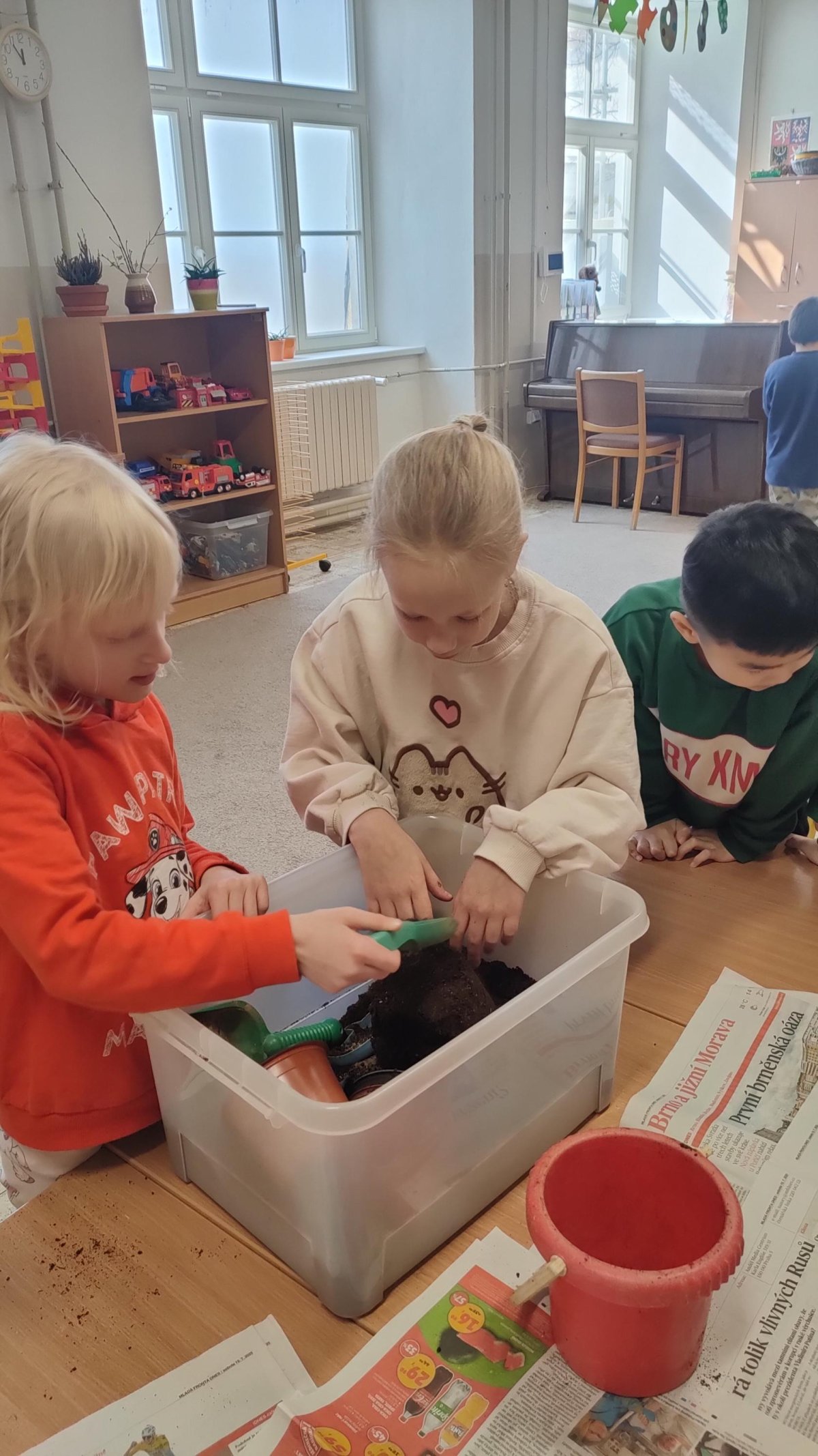 Připravené květináčky děti plnily zeminou, vysévaly semínka bylinek a následně zalévaly vodou z konvičky. Práce s hlínou děti zlákala, takže po chvíli odkládaly lopatky a hlínu promíchávaly a nabíraly holýma rukama. Měli jsme všichni špinavé (nejen) ruce, ale to k pořádné práci patří.