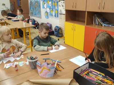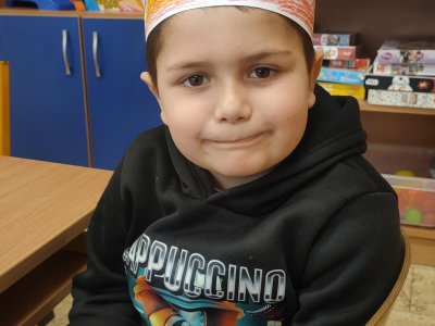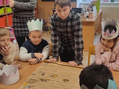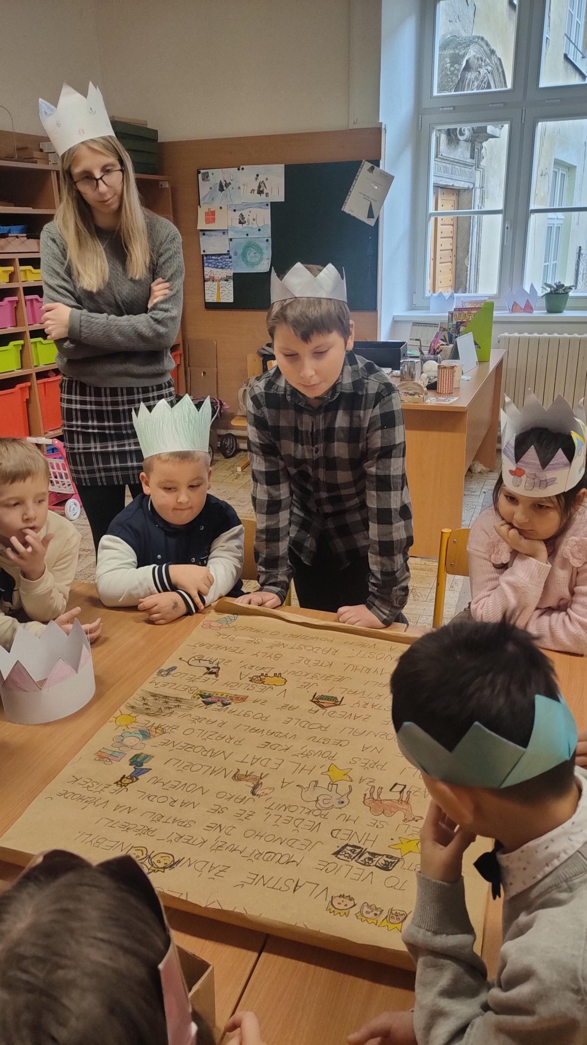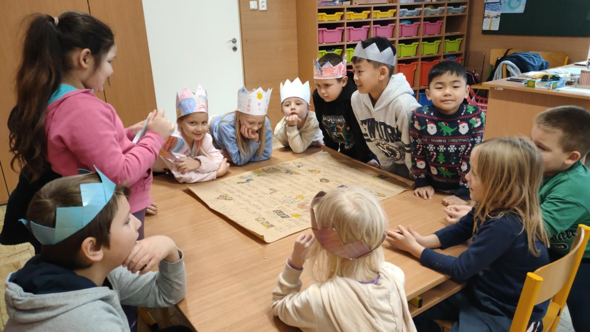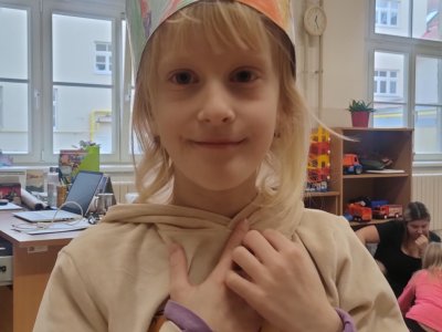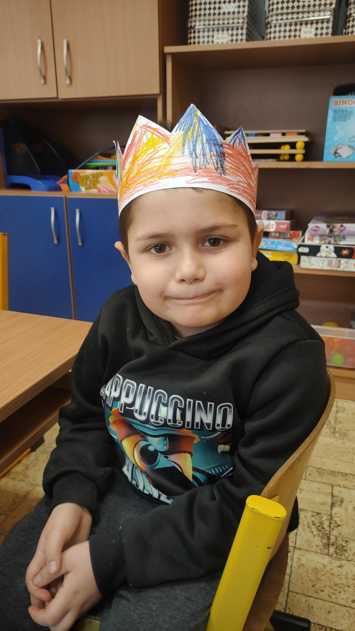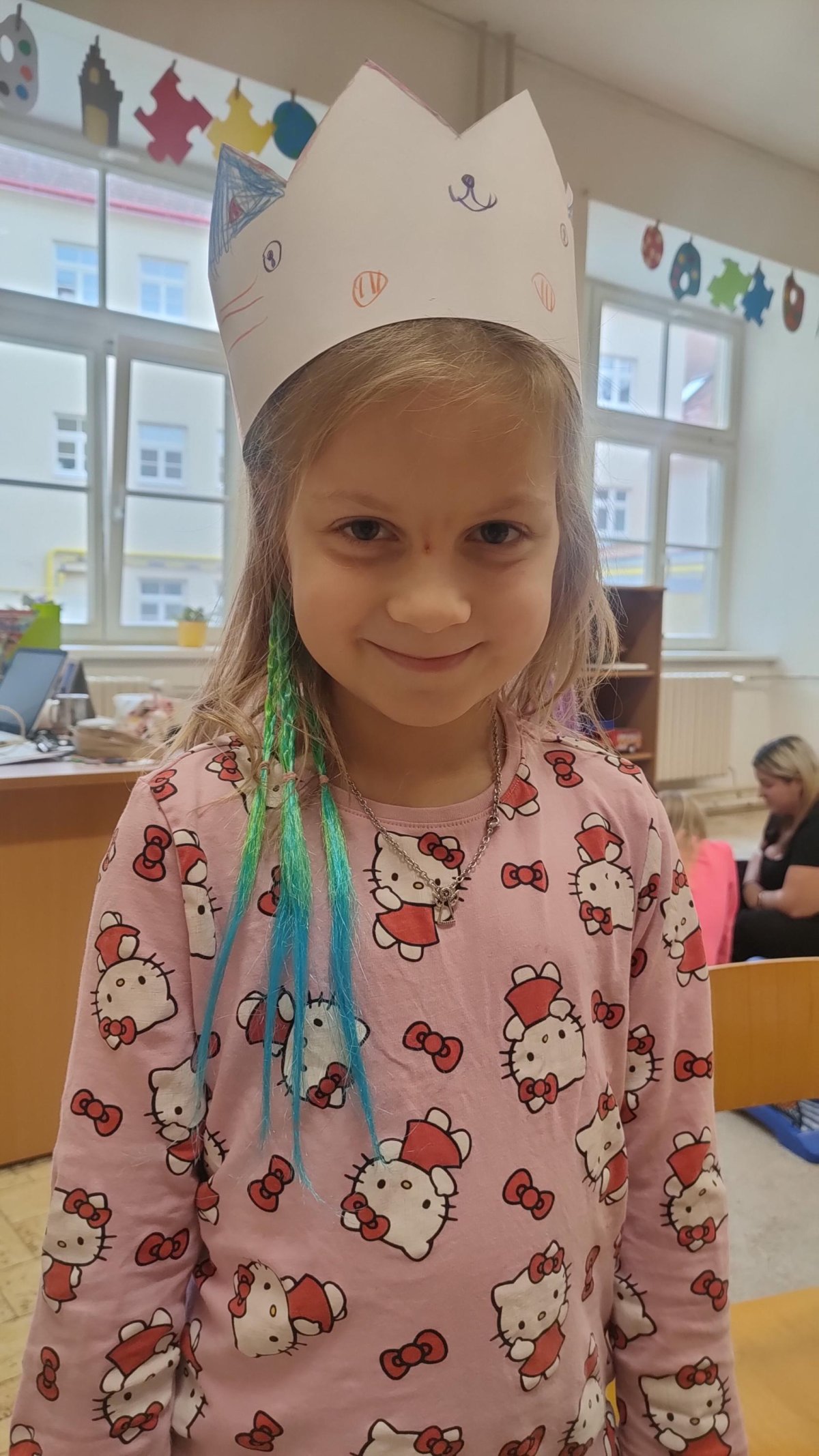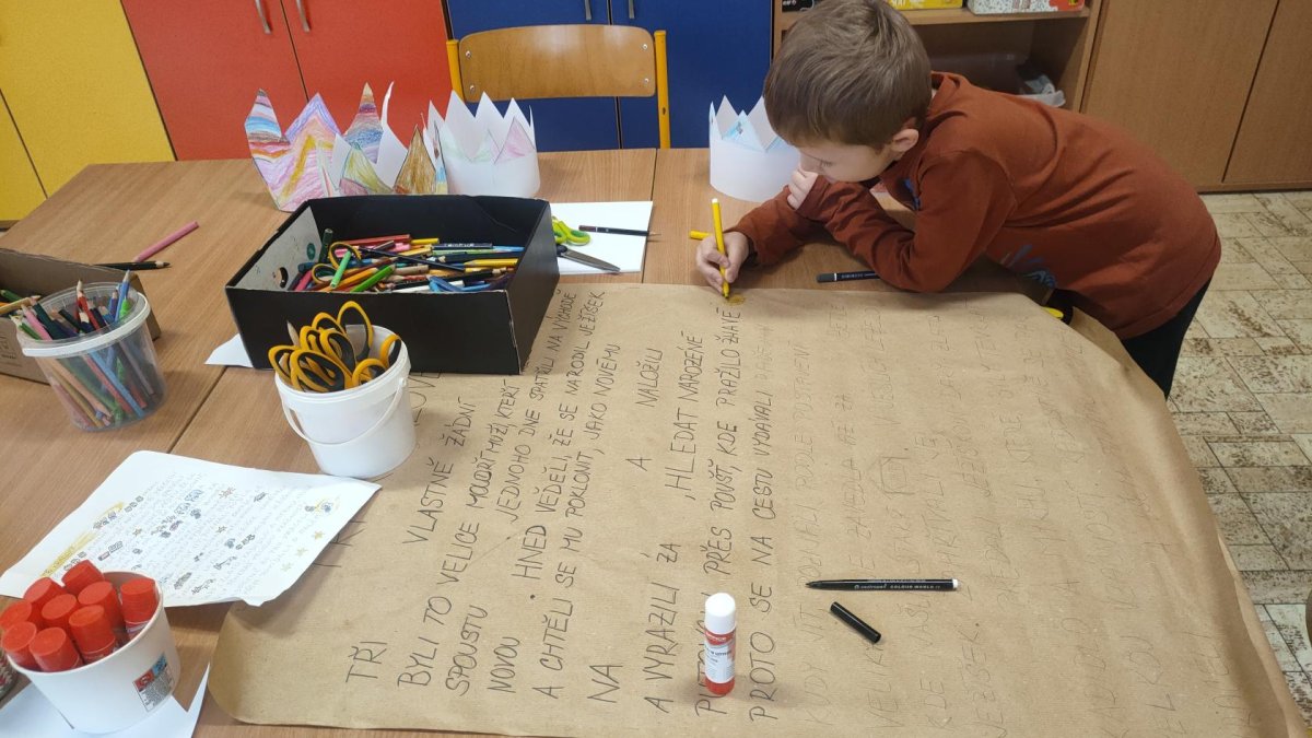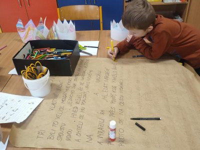 Protože jsme si královskou korunu vyrobili skoro všichni, byla králů plná družina. Tentokrát nám stačil na výrobu tvrdý bílý papír, pastelky a nůžky.