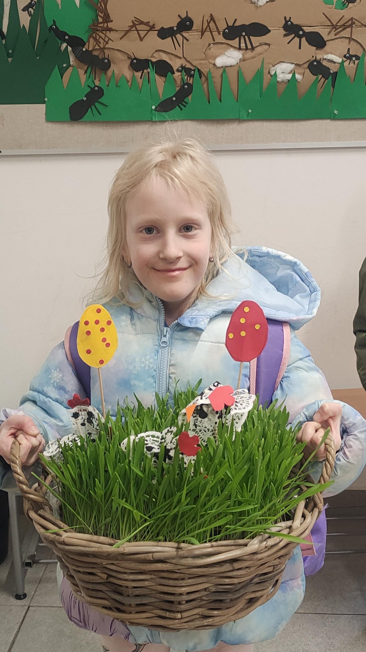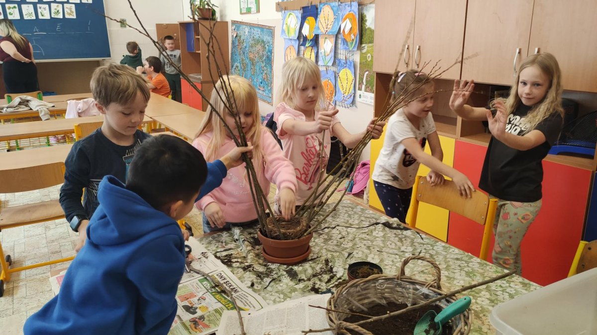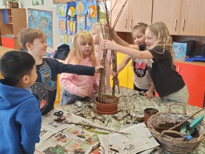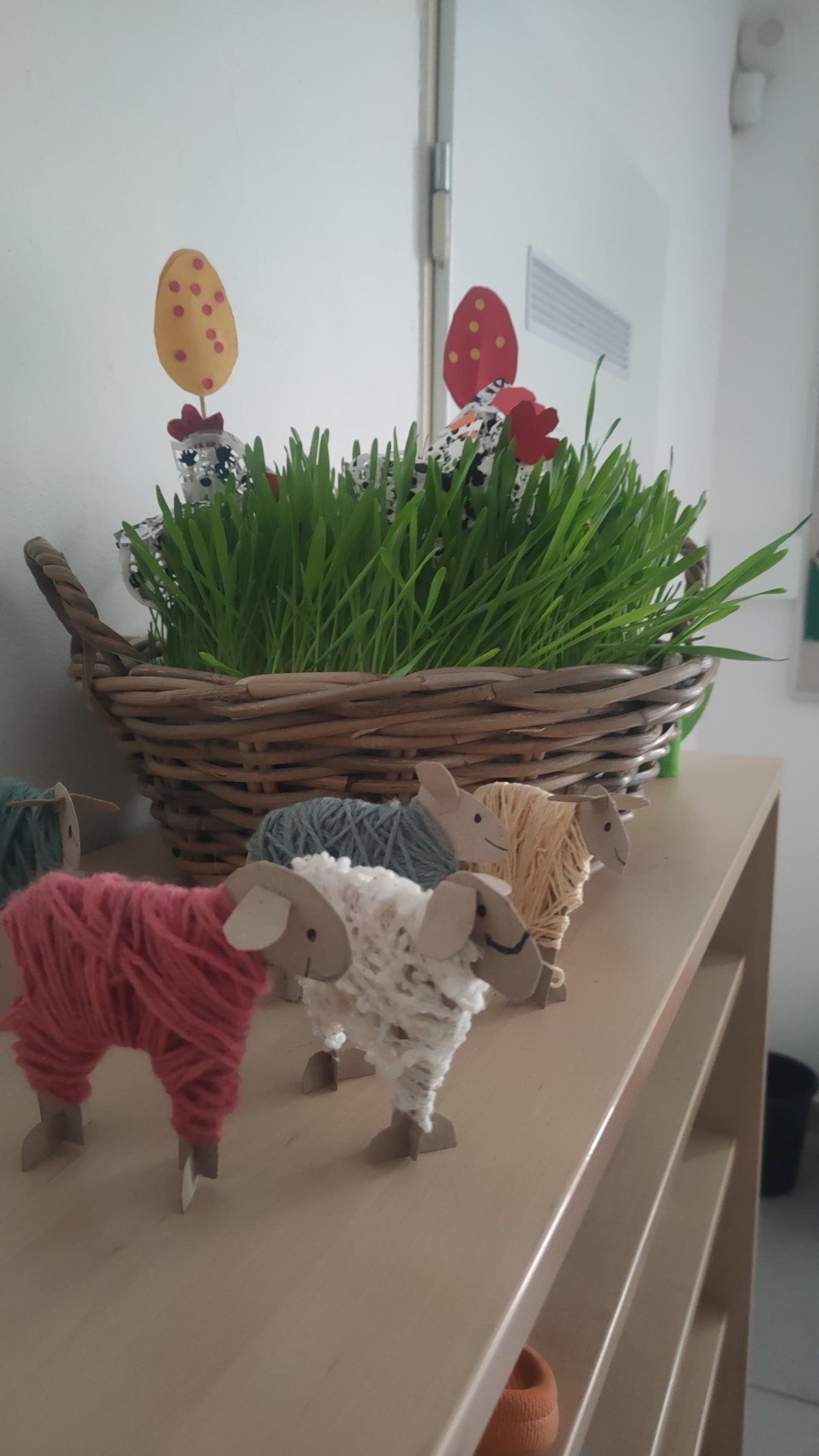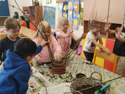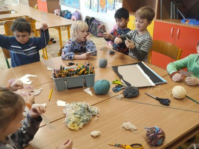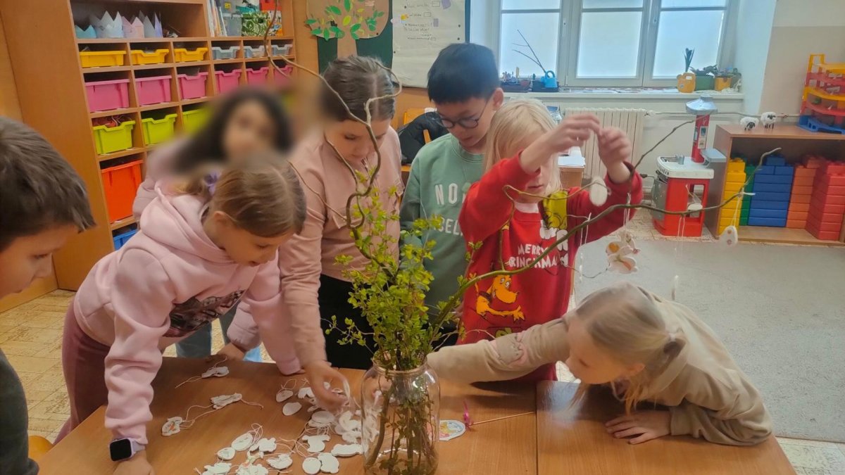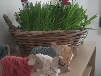 Podívejte, jak jsme si letos pohráli s velikonoční výzdobou. Ve vypěstovaném zeleném osení se schovávaji slepičky, jarní větvičky zdobí vajíčka a zajíčci a stádo oveček jsme oblékli do vlněných kabátků . Přinesli jsme si jaro až do školy a každý den nám dělá radost a dobrou náladu.