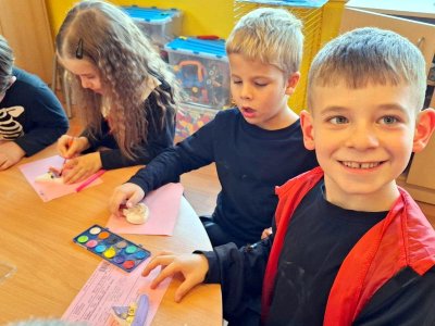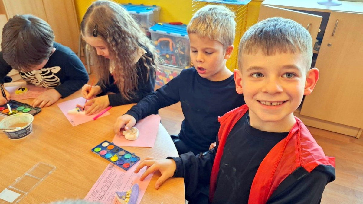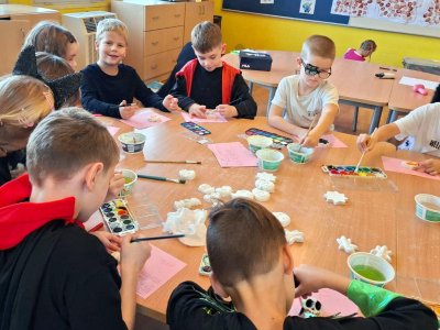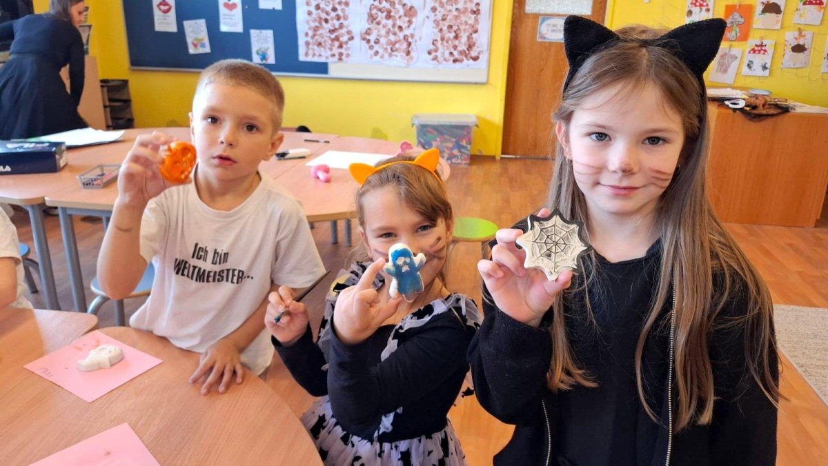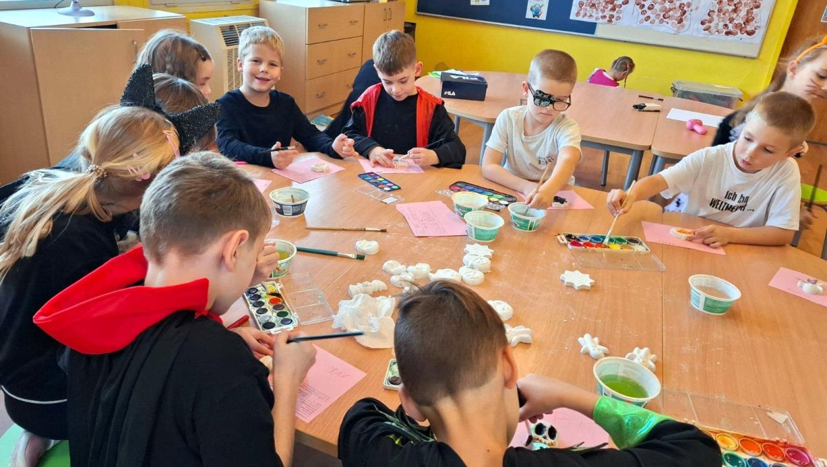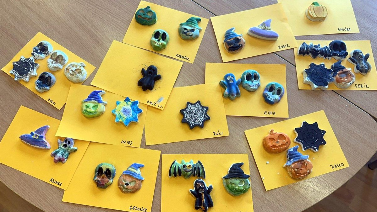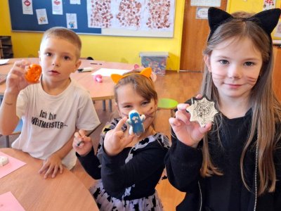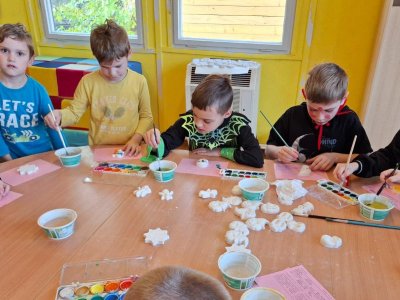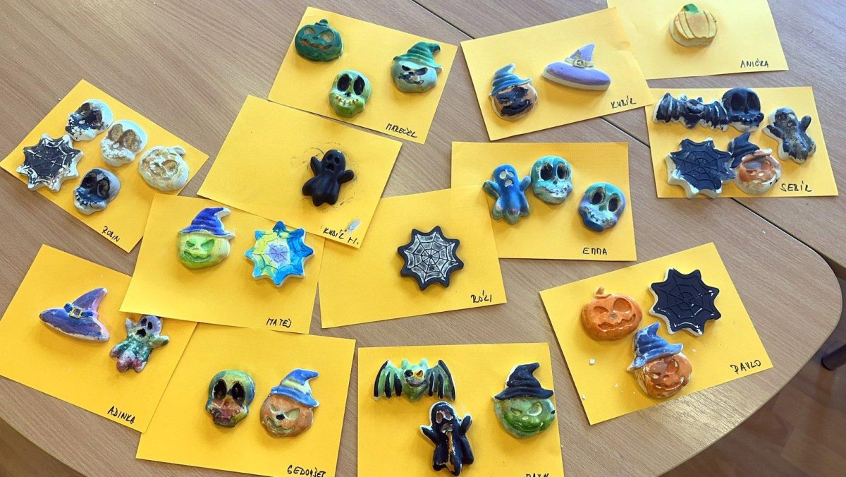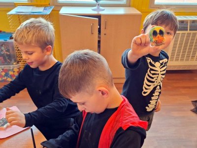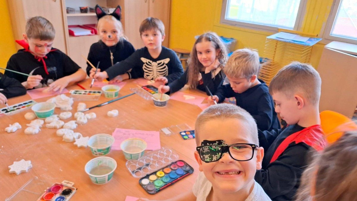 Společně jsme si přečetli pohádku, která nás všechny vtáhla do tajemného světa Halloweenu, potom jsme splnili různé úkoly a nakonec nás čekala kreativní výtvarná činnost . Pomocí vodových barev jsme si vybarvili krásné sádrové odlitky - čarodějnický klobouk, dýni, ducha, netopýra nebo pavučinu. Práce nás moc bavila a krásné výtvory jsme si s radostí odnesli domů. Za přípravu nádherných sádrových odlitků moc děkujeme paní asistentce Konvalinové!