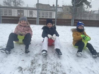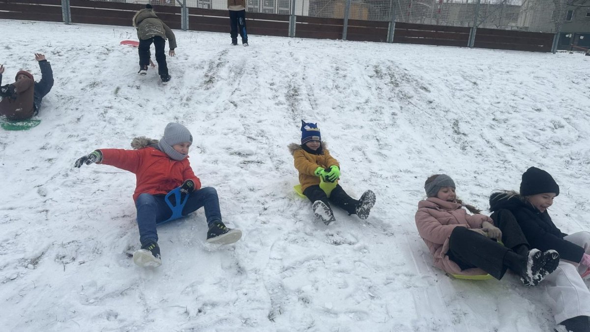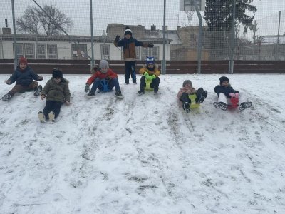 Začátkem února nás potěšila trocha sněhu, a tak jsme neváhali a vyrazili ven. Sice v družině nemáme saně, ale skvěle nám posloužily i lopaty, se kterými jsme se prima vyřádili. Abychom zůstali zdraví a neprochladli, užili jsme si běhání a hry v bílé peřině jen krátce a pak se hned vrátili do tepla. I tak to byla skvělá zimní zábava!