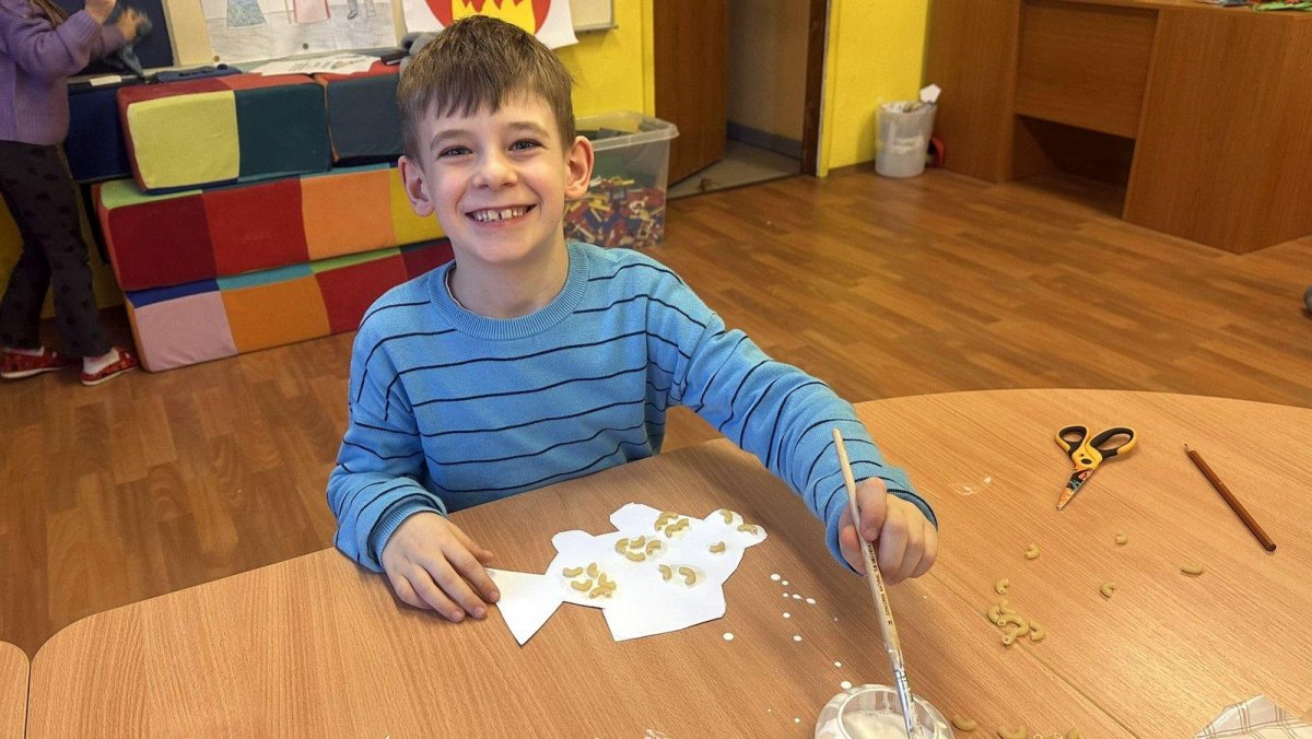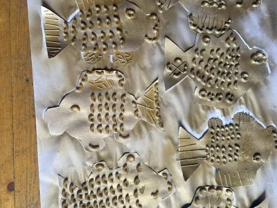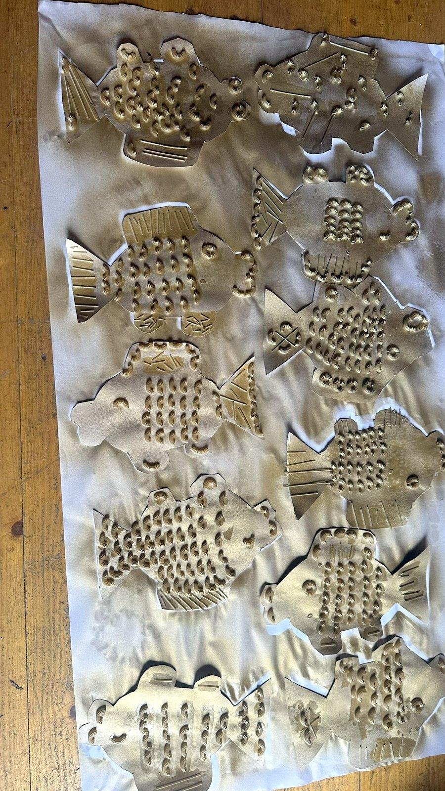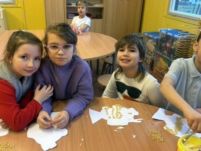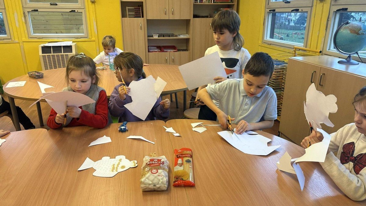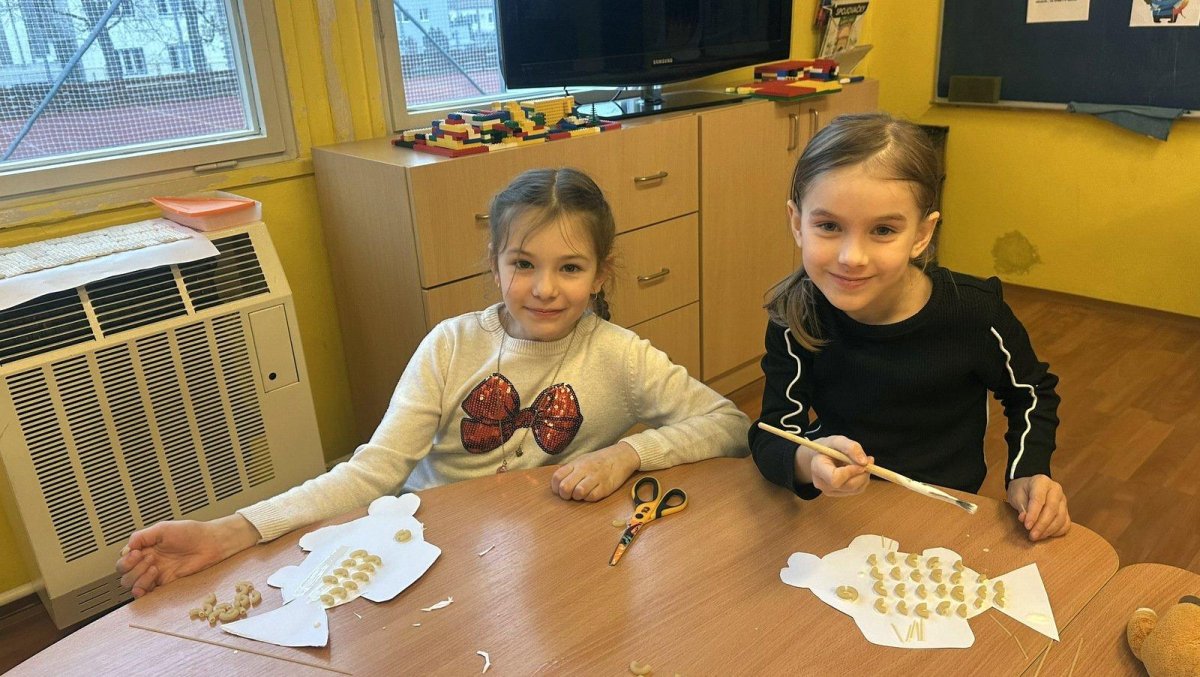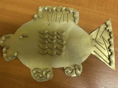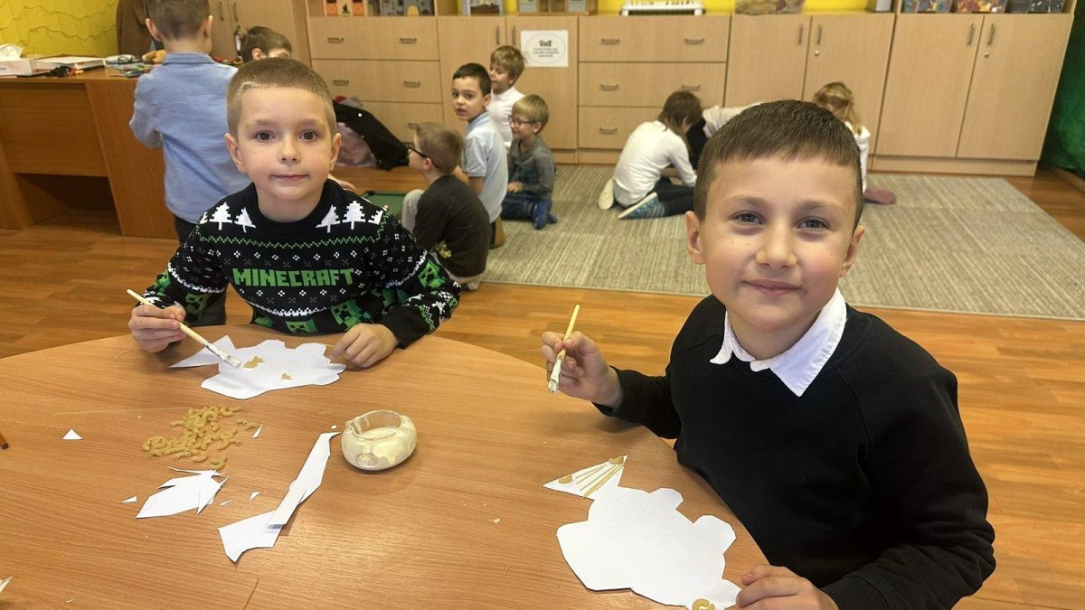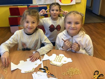 Děti pečlivě lepily těstoviny na tvar kapra a vytvářely šupinaté tělo. Zlatý sprej pak proměnil obyčejné těstoviny v nádherného třpytivého kapra.