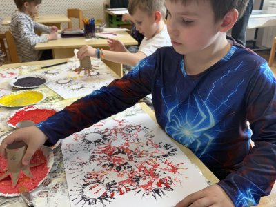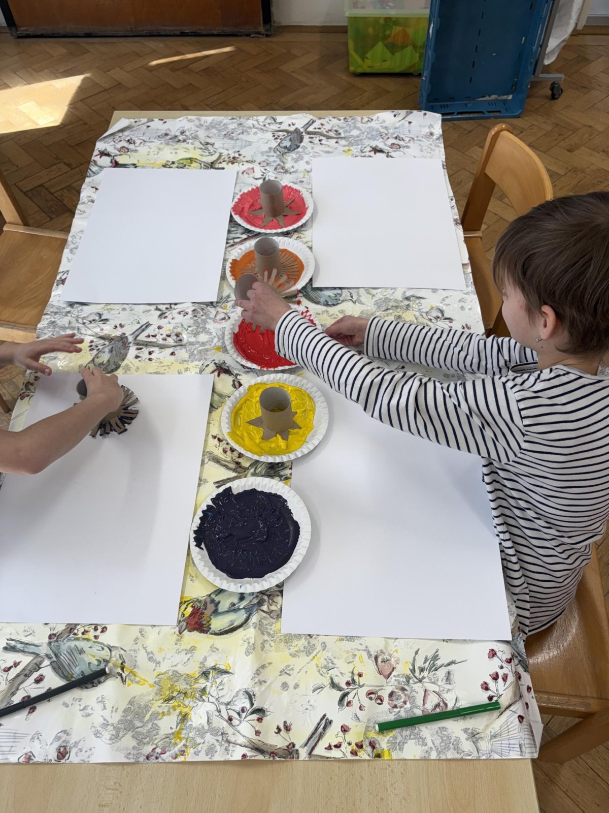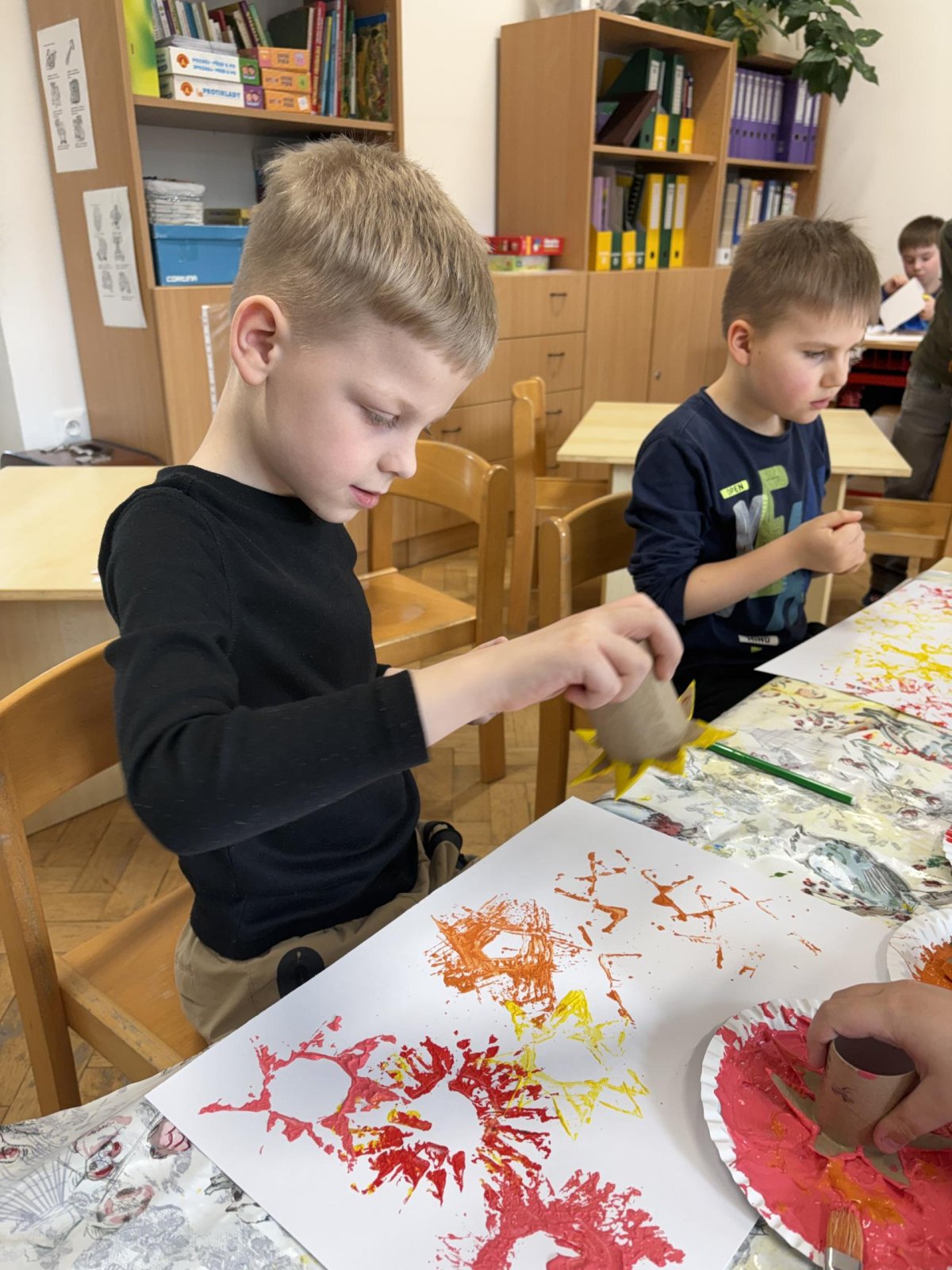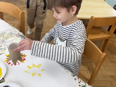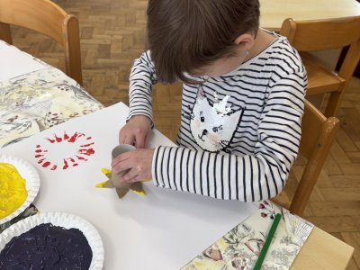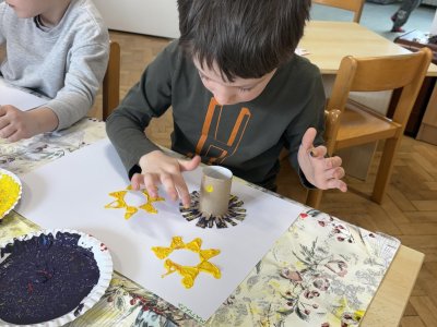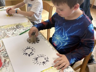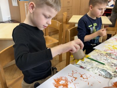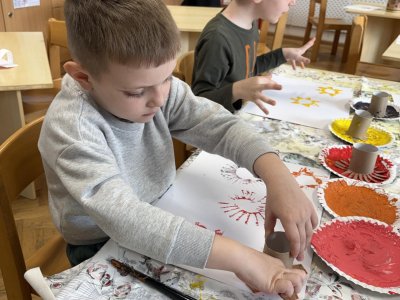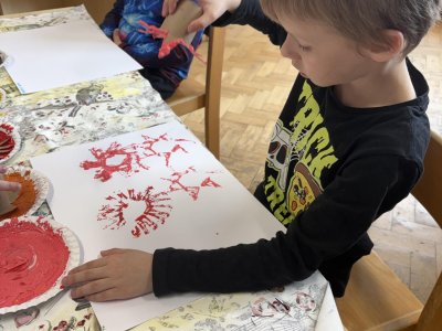 Během výtvarné činnosti děti tvořily květiny pomocí otisků, které vznikaly z papírových ruliček.