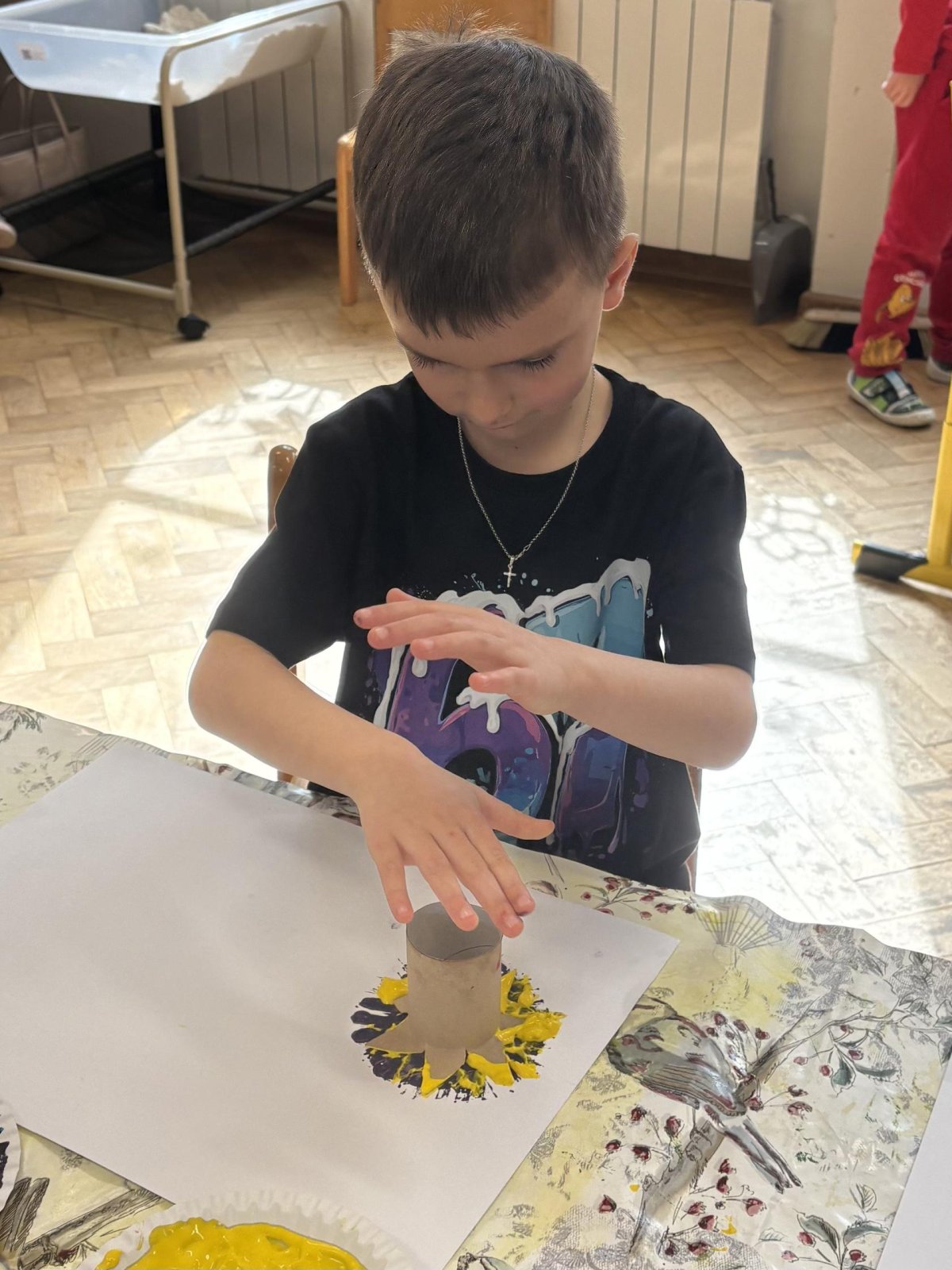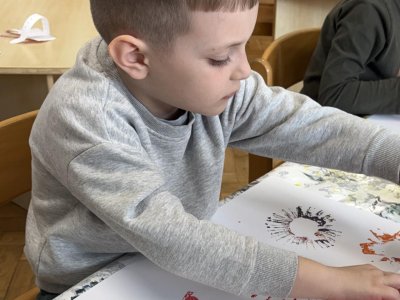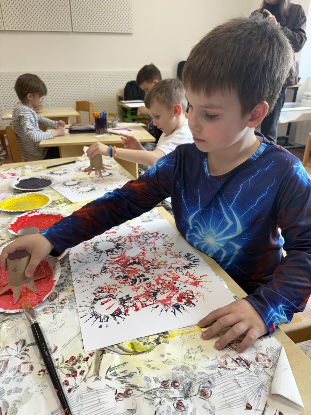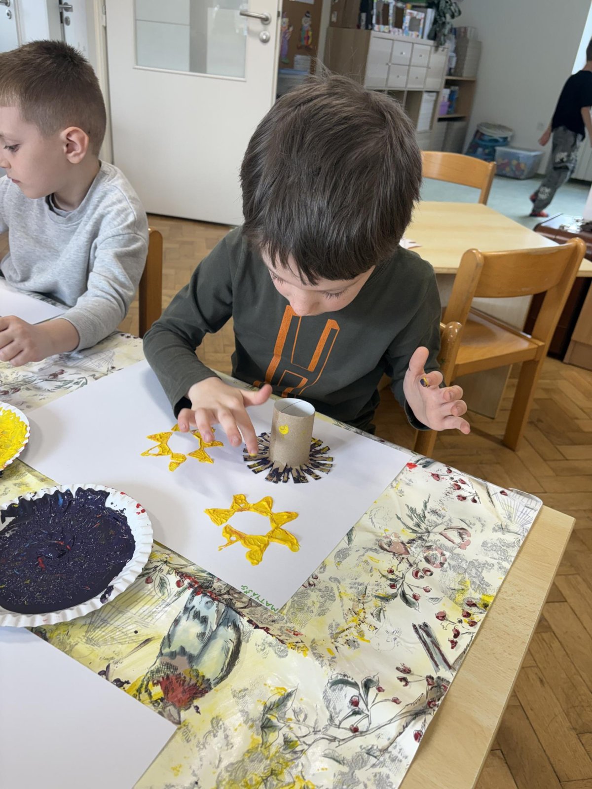Během výtvarné činnosti děti tvořily květiny pomocí otisků, které vznikaly z papírových ruliček.