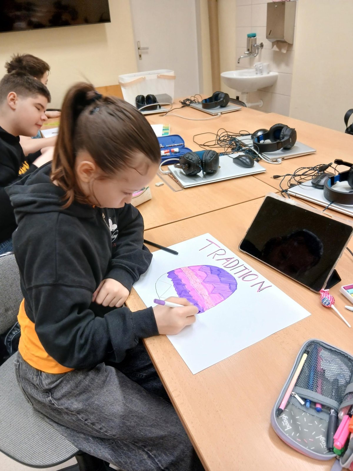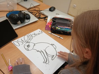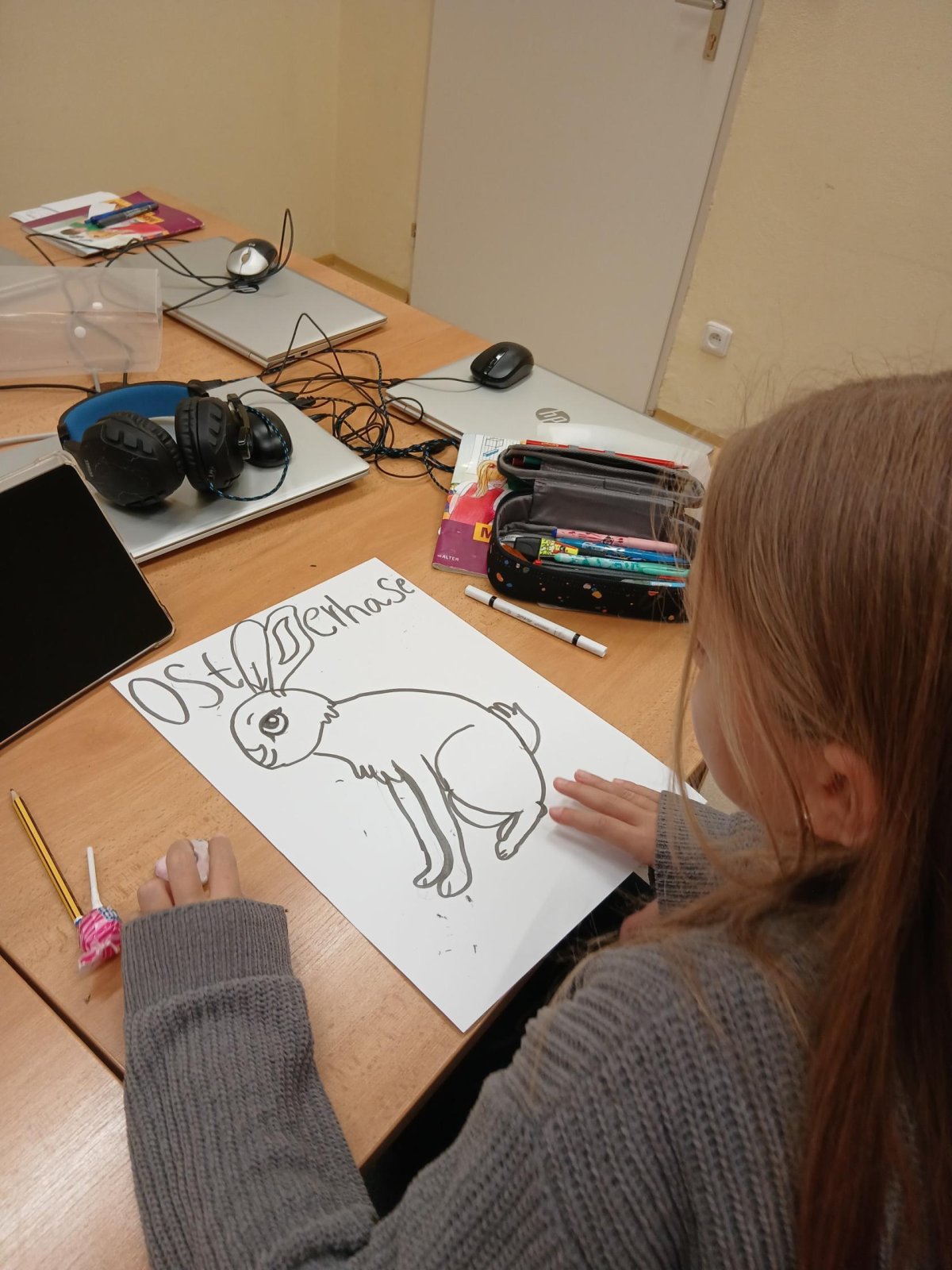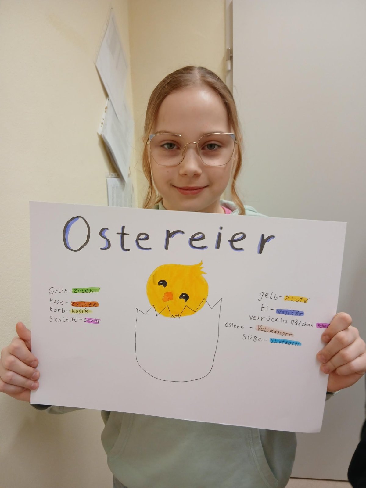 Každý si vybral motiv spojený s Velikonocemi – objevila se například vajíčka (Ostereier), velikonoční zajíček (Osterhase) nebo tradiční pomlázka. Díky propojení učení a tvoření si děti nová slovíčka lépe zapamatovaly a zároveň si rozvíjely svou kreativitu.