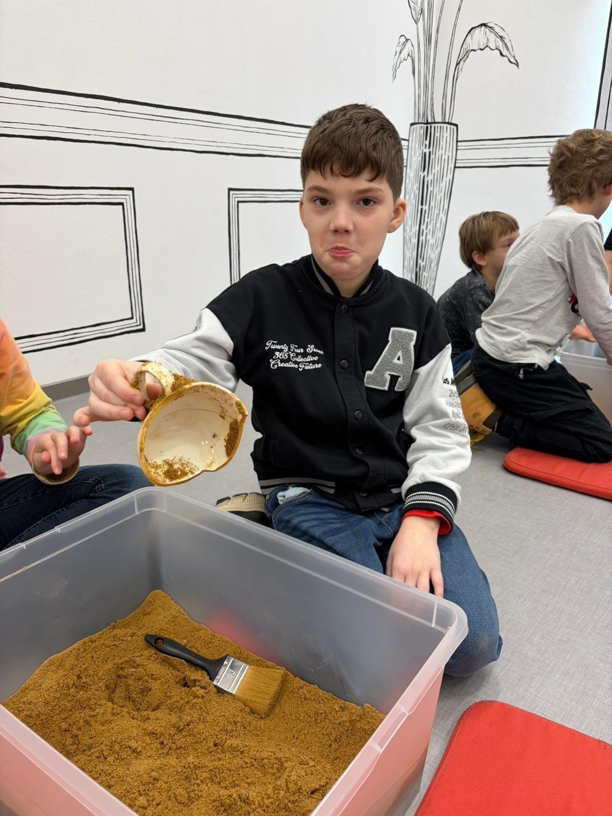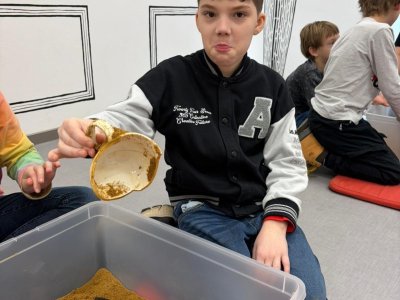 Zkusili jsme si práci archeologa a hle, objevili jsme předměty z doby plastové. Dozvěděli jsme se co je to depot.  Se slepou mapou v ruce jsme se vydali do výstavní místnosti. Wau!!! Pořádně prohlédnout všechny vystavené exponáty a honem najít místo označené na slepé mapě. Na pískovišti jsme si vyzkoušeli, jak se vytvářely meandry řeky Dyje a na závěr si z keramické hlíny vyrobili knoflík.