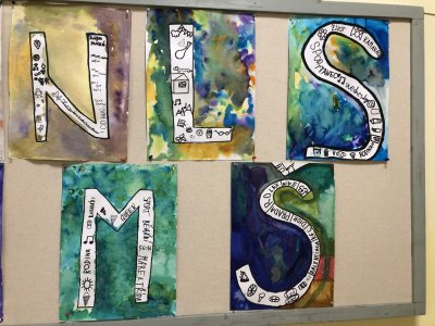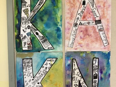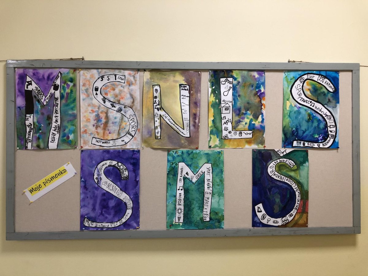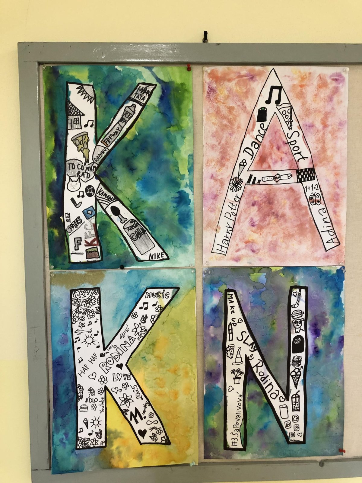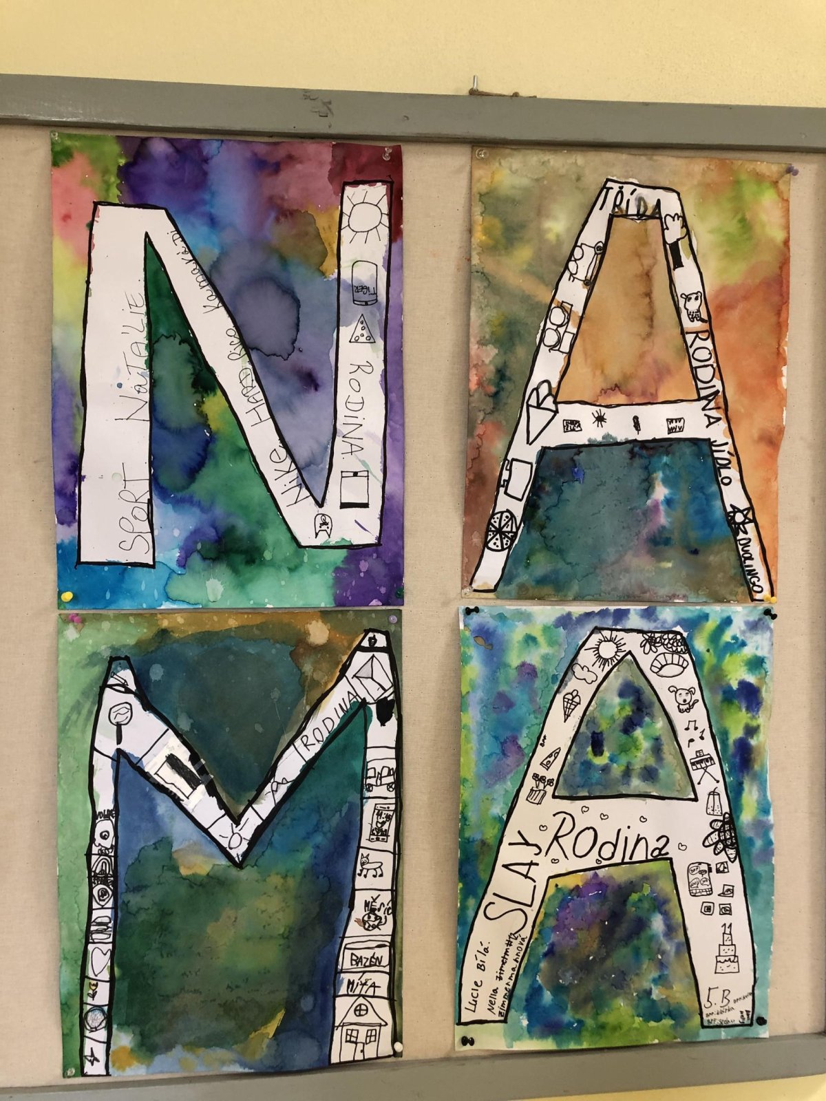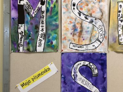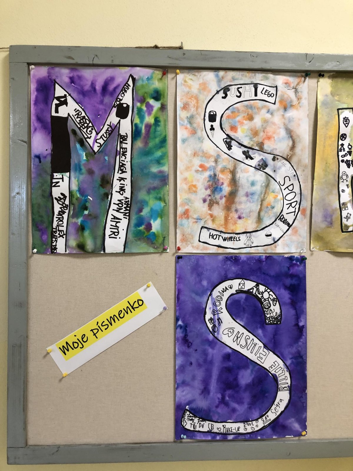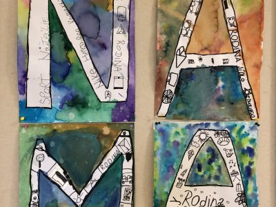 Ve výtvarné výchově se kreslilo a malovalo. Napsali jsme první písmeno z našeho křestního jména, to jsme vyplnili/vykreslili našimi koníčky a oblíbenými aktivitami a v závěru vše domalovali anilinovými barvami. A povedený výkres byl na světě...