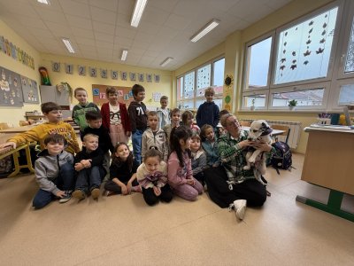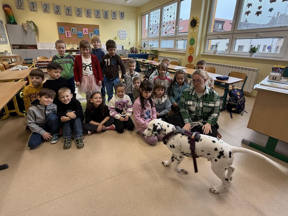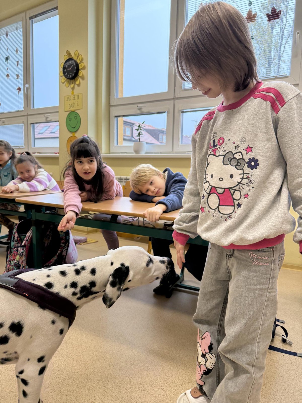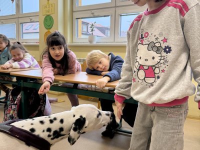 Eda je boží štěňátko milující děti a je pro každou legraci. Ve třídě se okamžitě zabydlel. Děti si ho mohly pohladit, nakrmit a taky se zeptat na všechno, co je o psím životě zajímalo. Takže už například víme, že Eda má rád meloun a na tajňačku upíjí kafe s mlíkem :-) Tatínka má z Norska a bráška bydlí na Slovensku. Kdo ví, kam vezme na prázdniny Eda paní učitelku?!