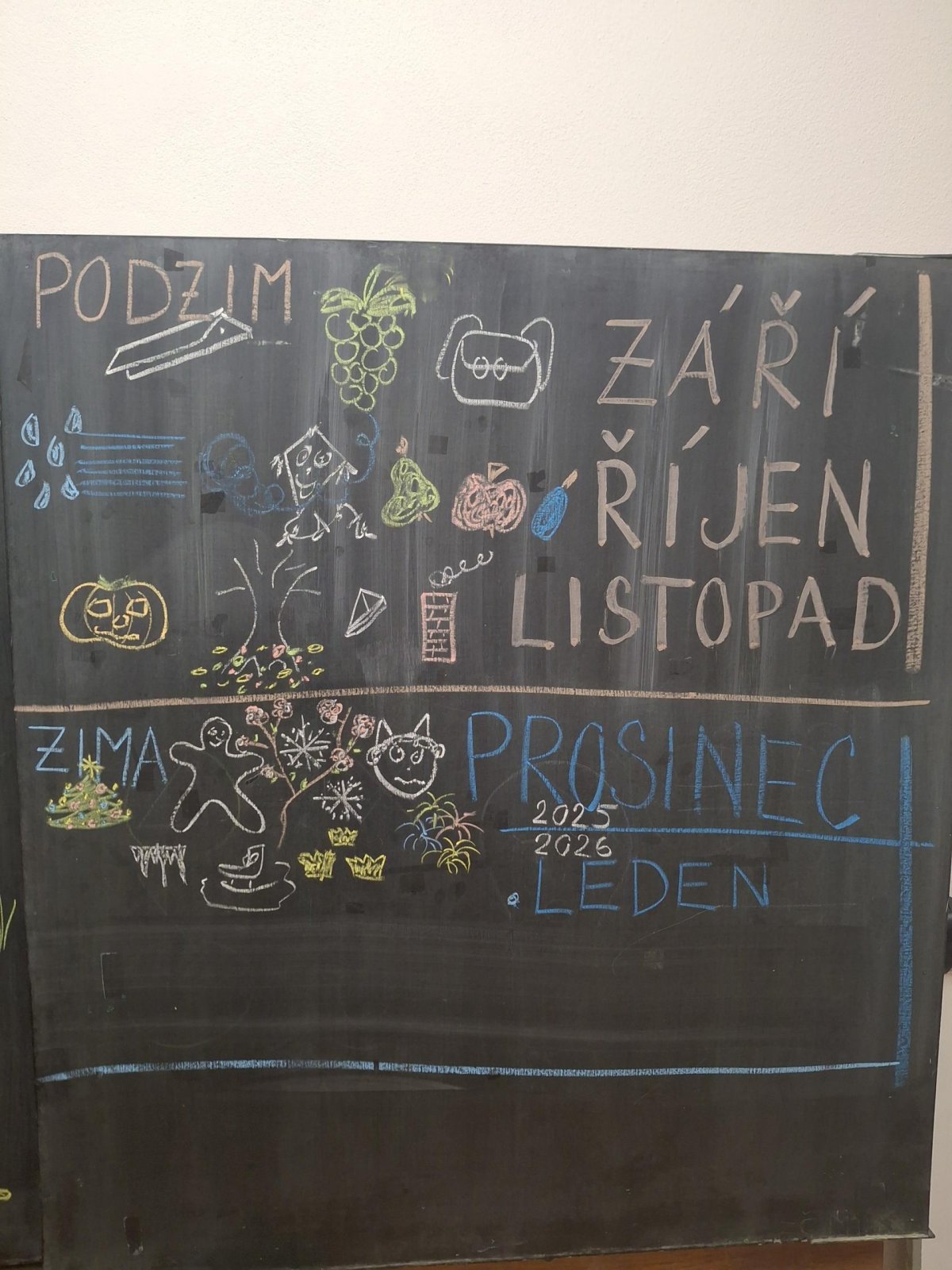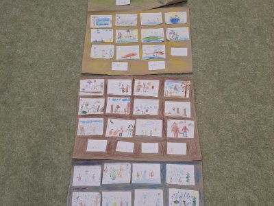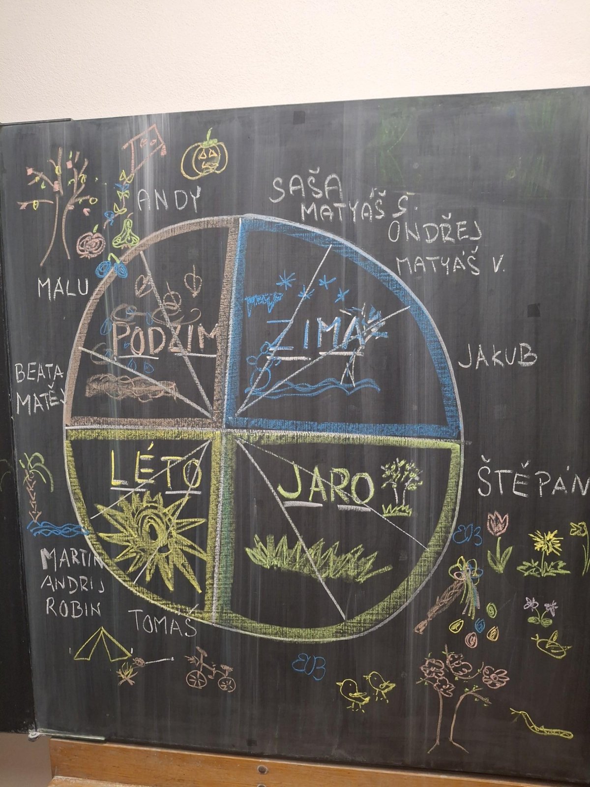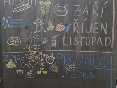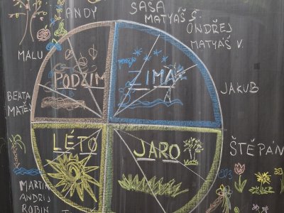 Text známé dětské písně - i my jsme se učili poznávat nejen dny v týdnu, ale i roční období. Seznamovali jsme se s charakteristickými znaky každého období - oblečení, počasí, typické sporty a činnosti, svátky a zvyky, změny v přírodě, přizpůsobení zvířat a rostlin. Snažili jsme se i zapamatovat si datum svého narození a zařadit ho do našeho kruhu ročních období. Výsledkem bylo vytvoření "mapy" ročních období nejen na tabuli, ale i pomocí charakteristických obrázků ročních období dětmi. Na nich jsme se učili popisovat věci a činnosti celou větou, nejlépe už rozvitou.