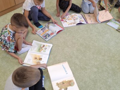 Sovík seznámil děti s různými druhy knih a co v nich všechno můžeme najít. Už víme, že knihu píše spisovatel a obrázky kreslí ilustrátor. Od Sovíka tu byly připravené i knihy na prohlédnutí a děti mu pak vyprávěly co se z knih dozvěděly nebo o čem kniha je.