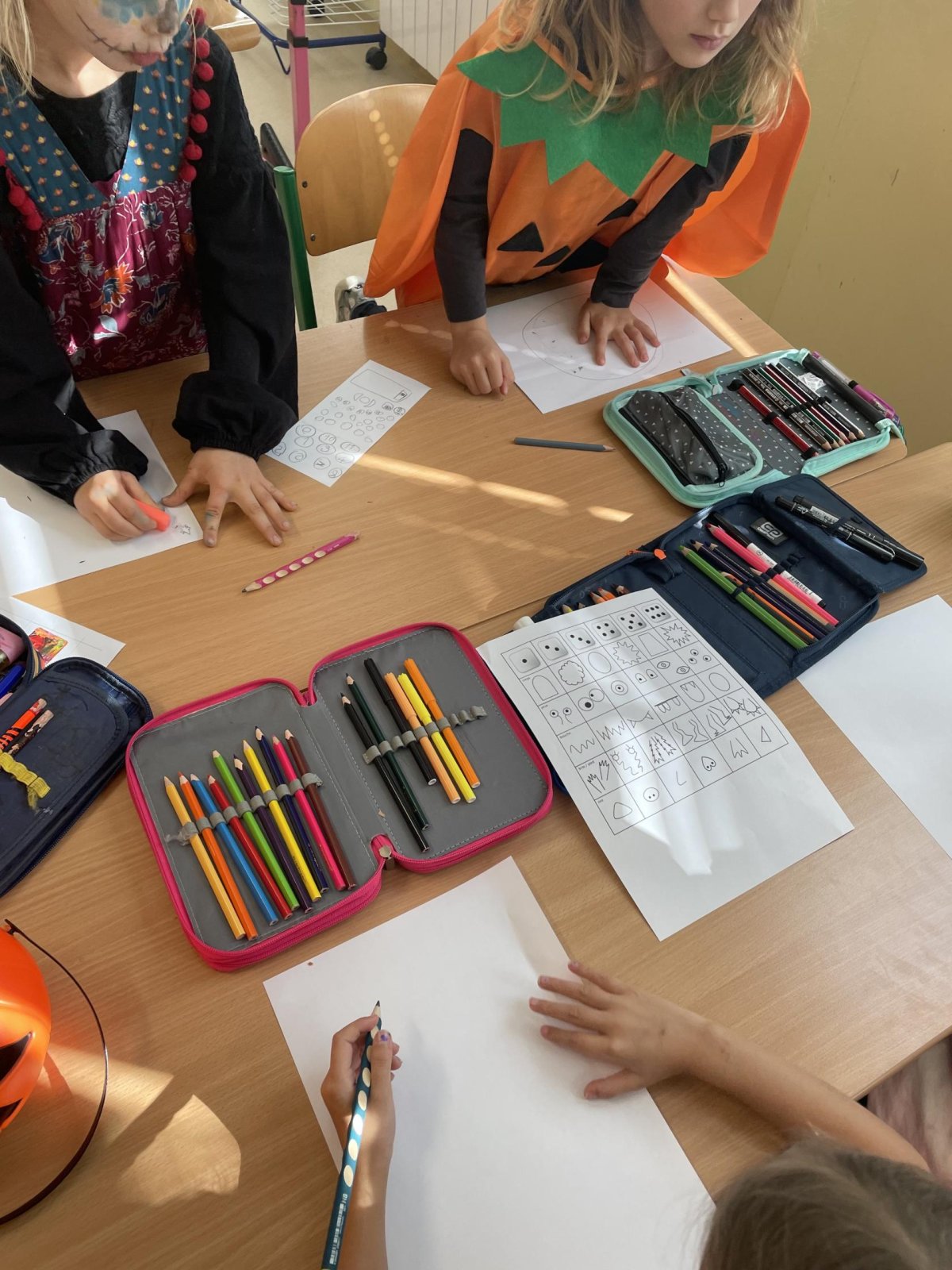 Vyzkoušeli jsme si také několik strašidelných aktivit – tvořili jsme čarodějný kotlík, skládali písmenka z kostí a kreslili příšerky podle šifry a hráli různé hry s halloweenskou tematikou. Nechybělo také připomenutí našich českých Dušiček nebo mexického svátku Dia de Muertos.