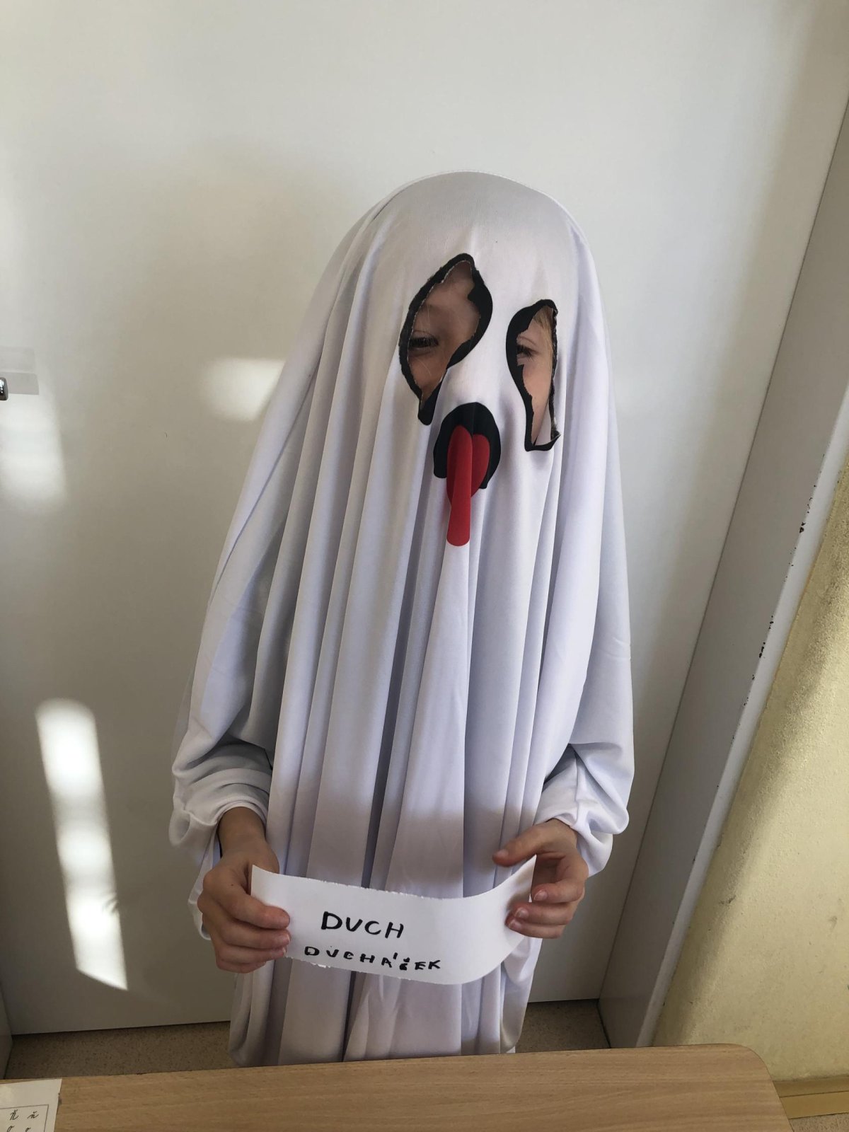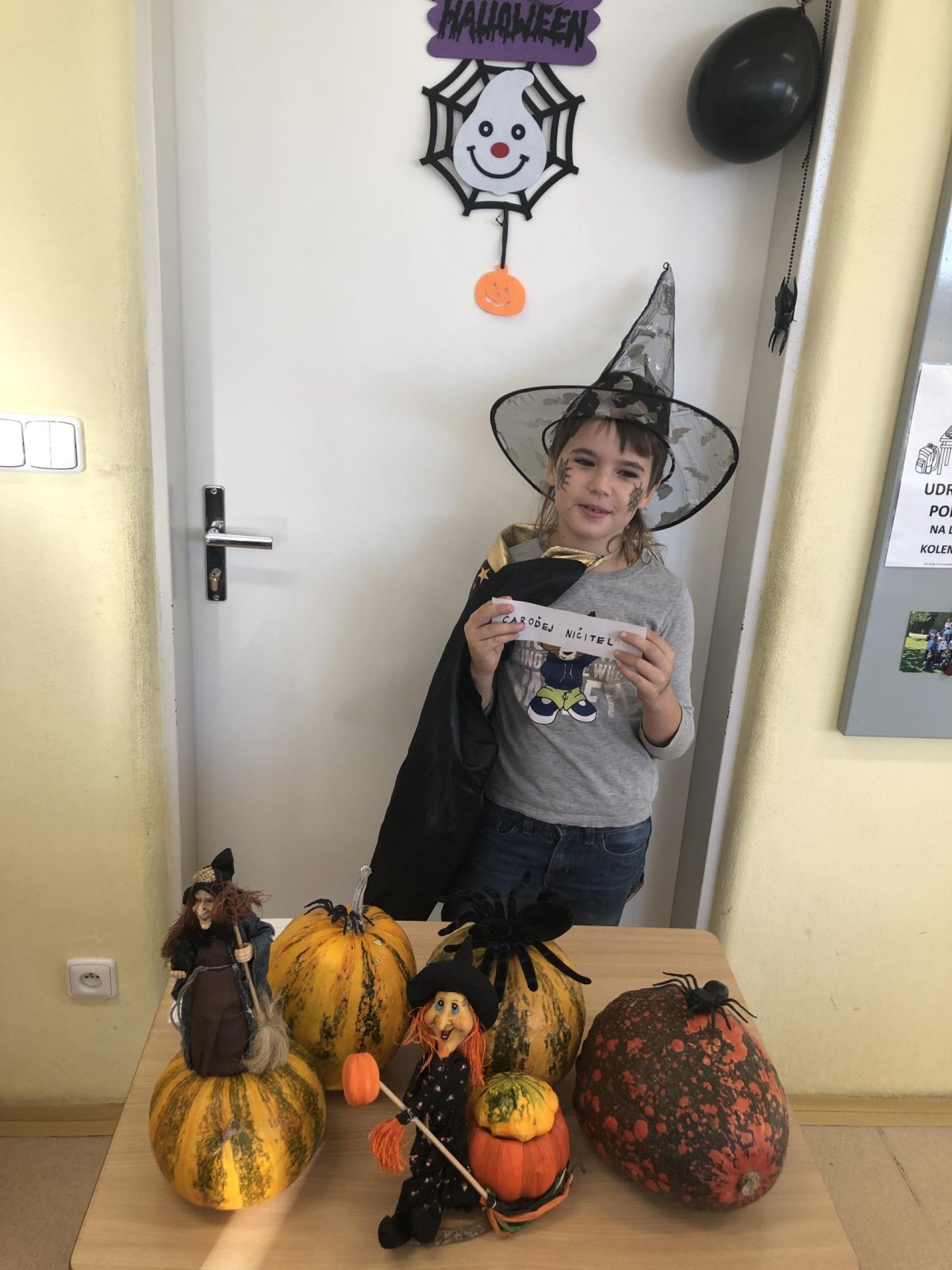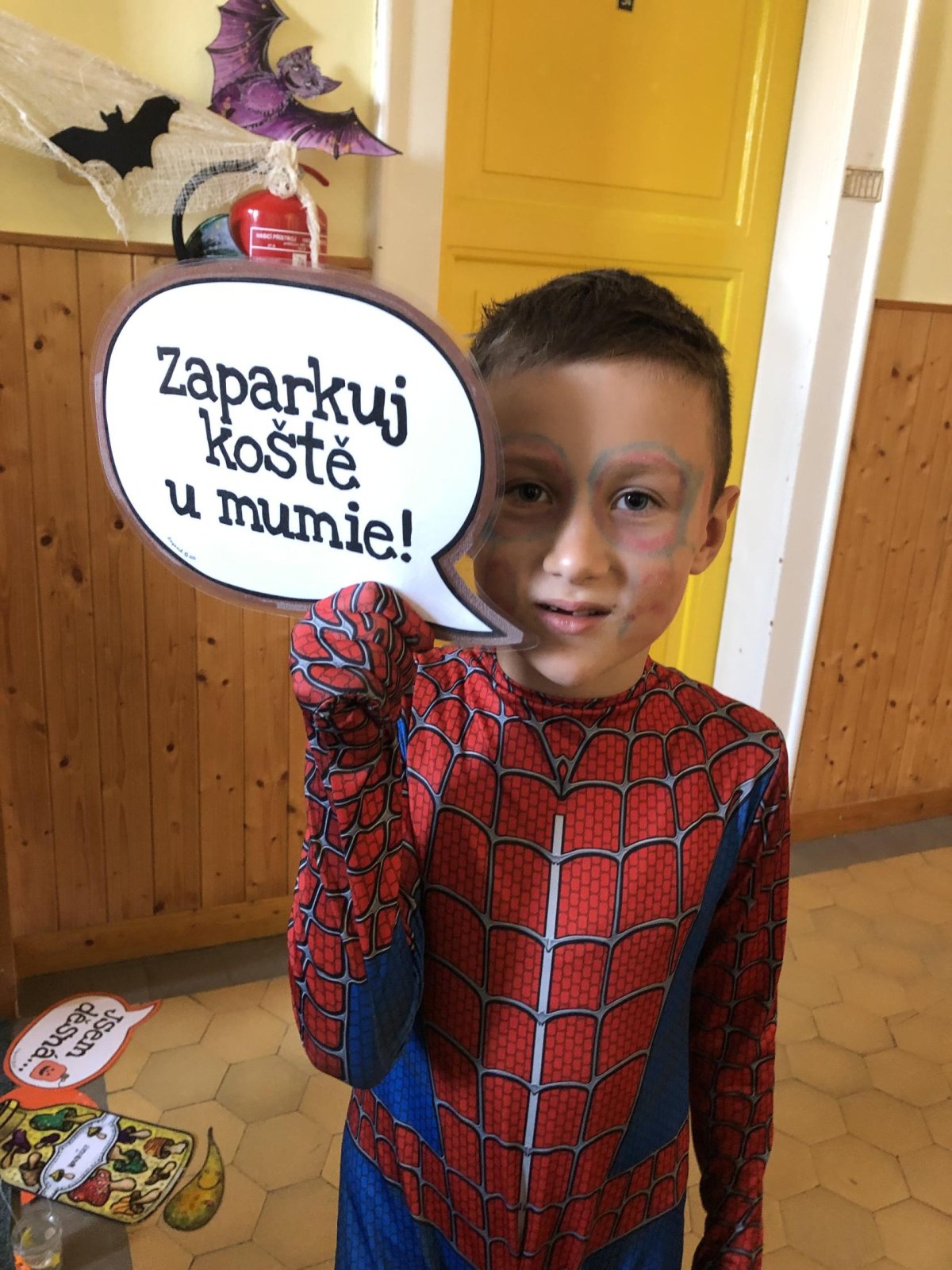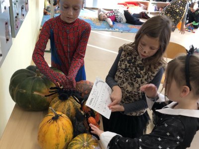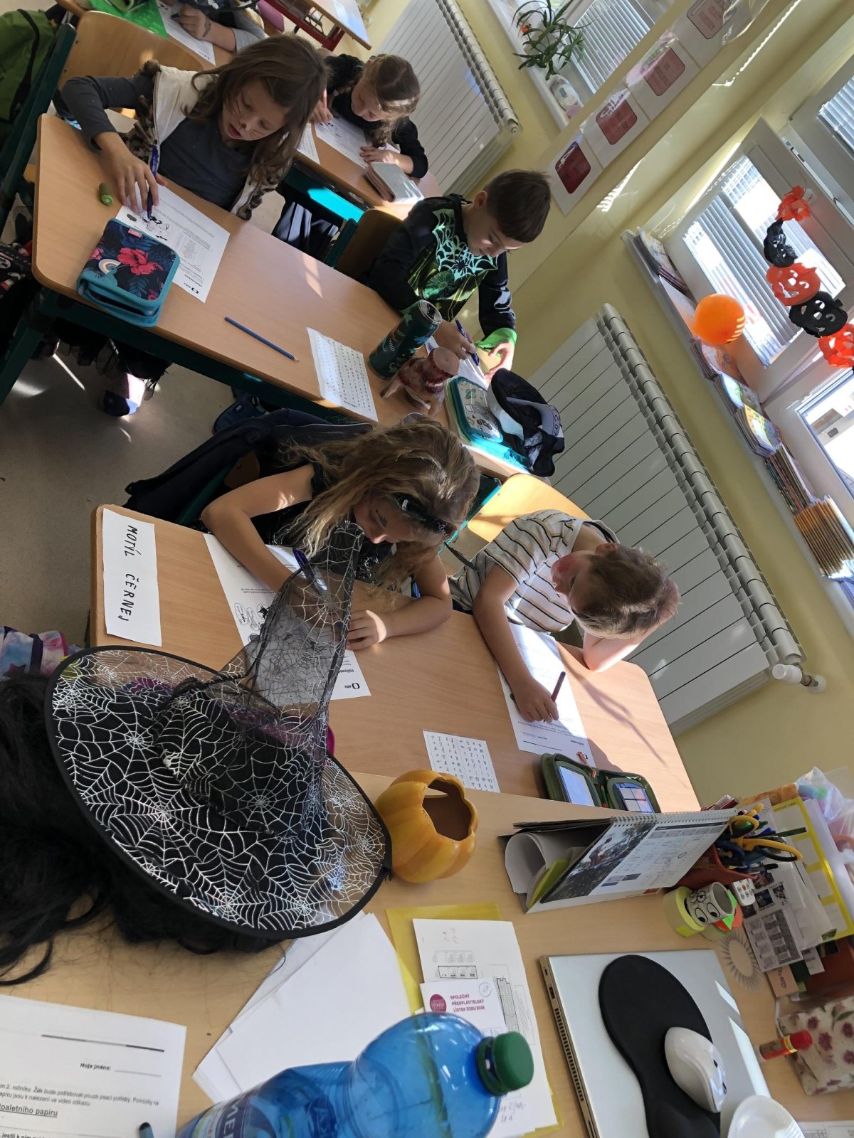 Dnešní den byl jiný. Všichni jsme měli kostýmy a představili jsme spolužákům své masky. Pak jsme plnili úkoly na dýňové stezce. Aby se Sárinka necítila osamocená v kostýmu ducha Ducháčka, tak jsme si vyrobili lízátkové duchy. Nezapomněli jsme na plnění halloweenských úkolů z matematiky a z českého jazyka. I piknik byl díky rodičům báječný - na stole šneci, prsty, muffiny a spousta dalších dobrot. A už také víme, čím se liší Halloween a české Dušičky.