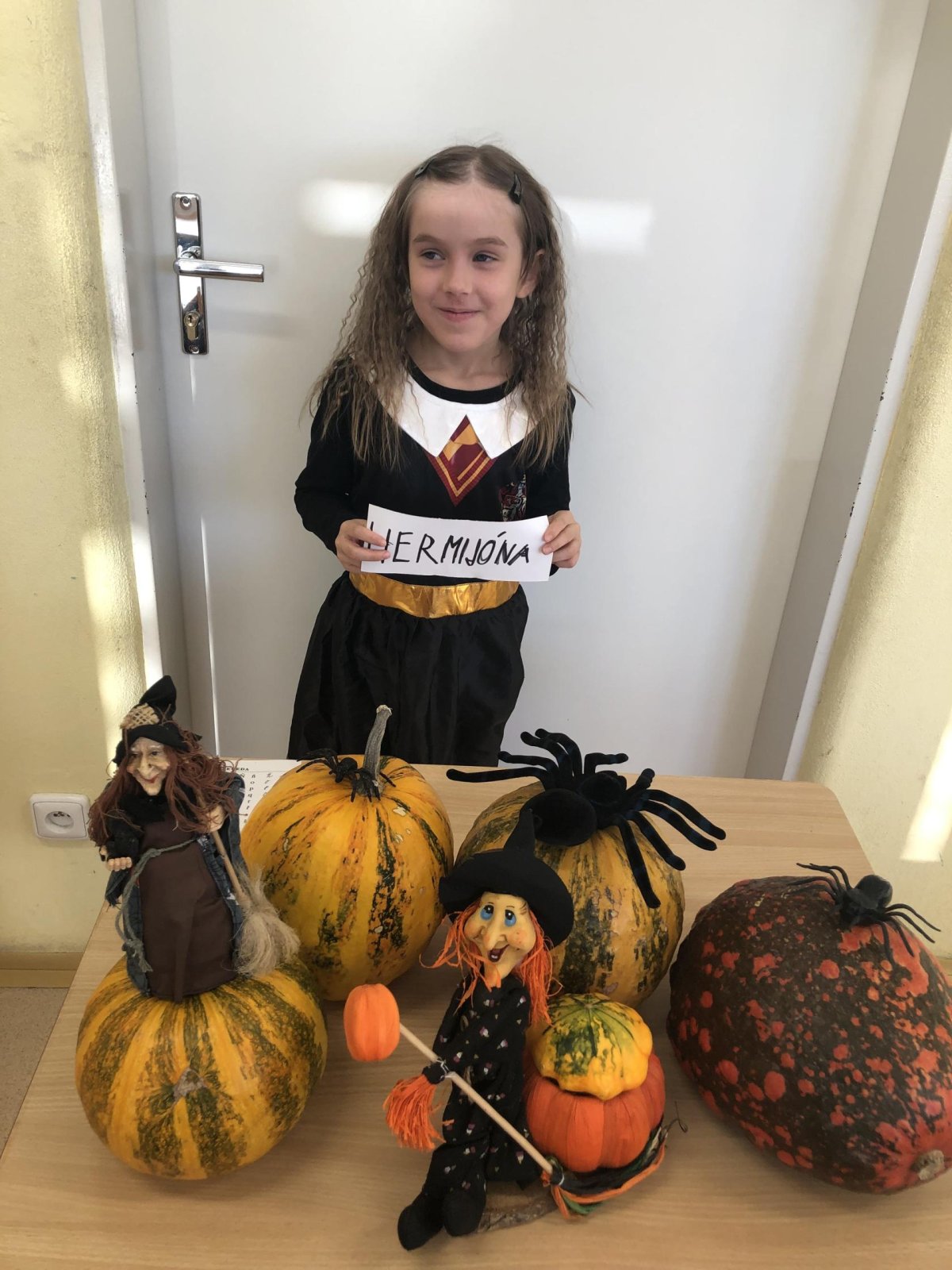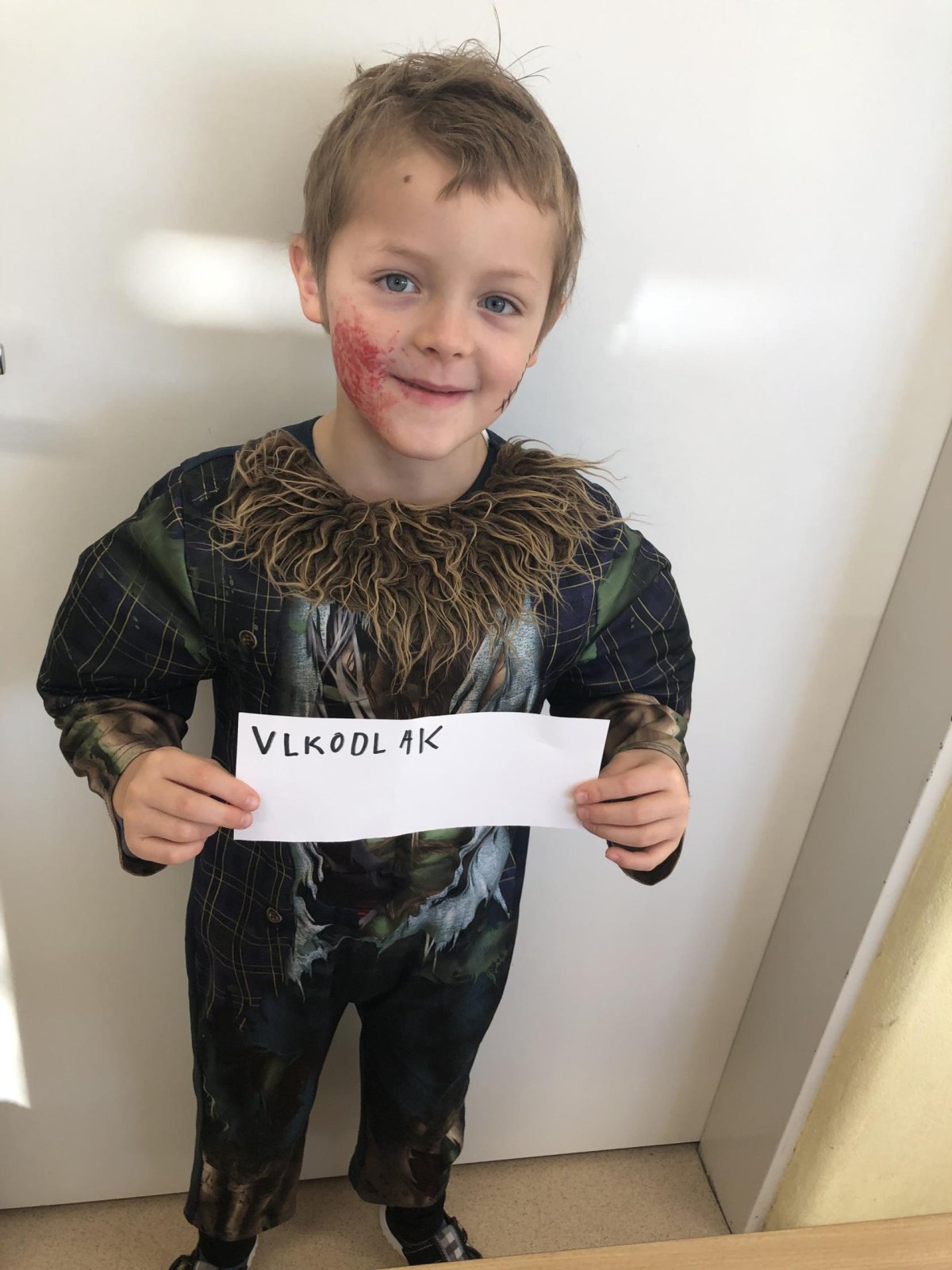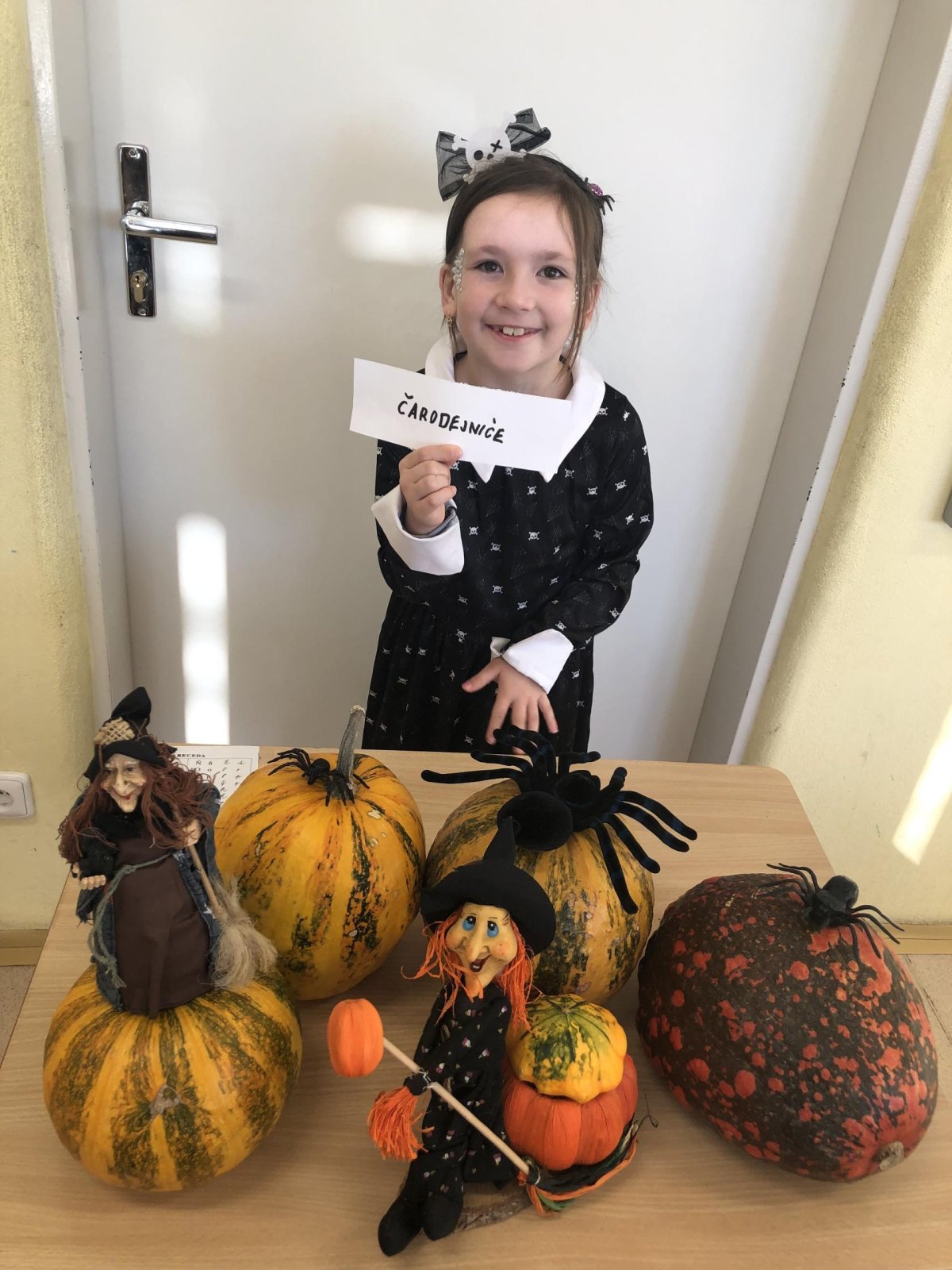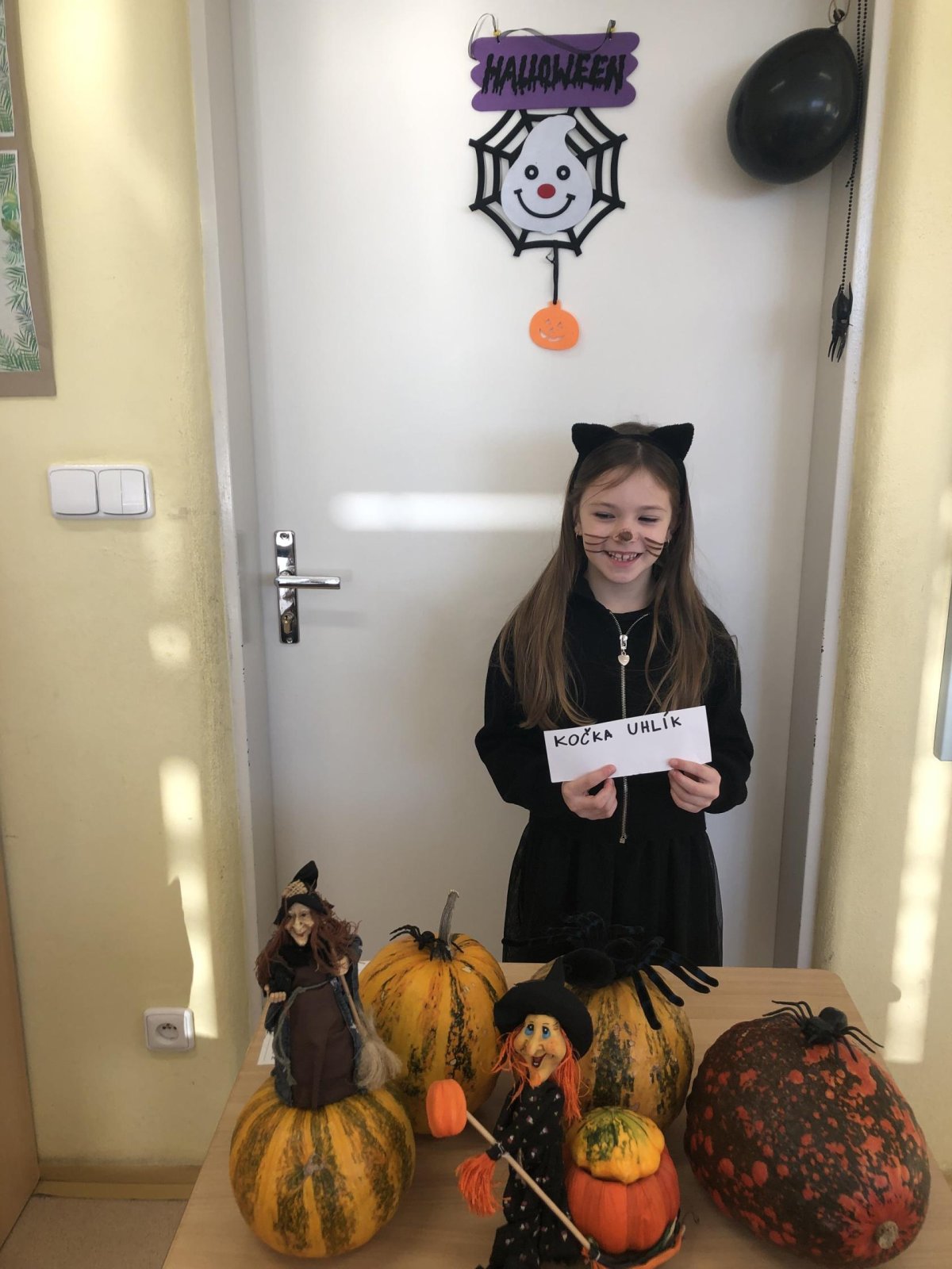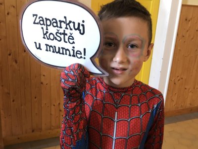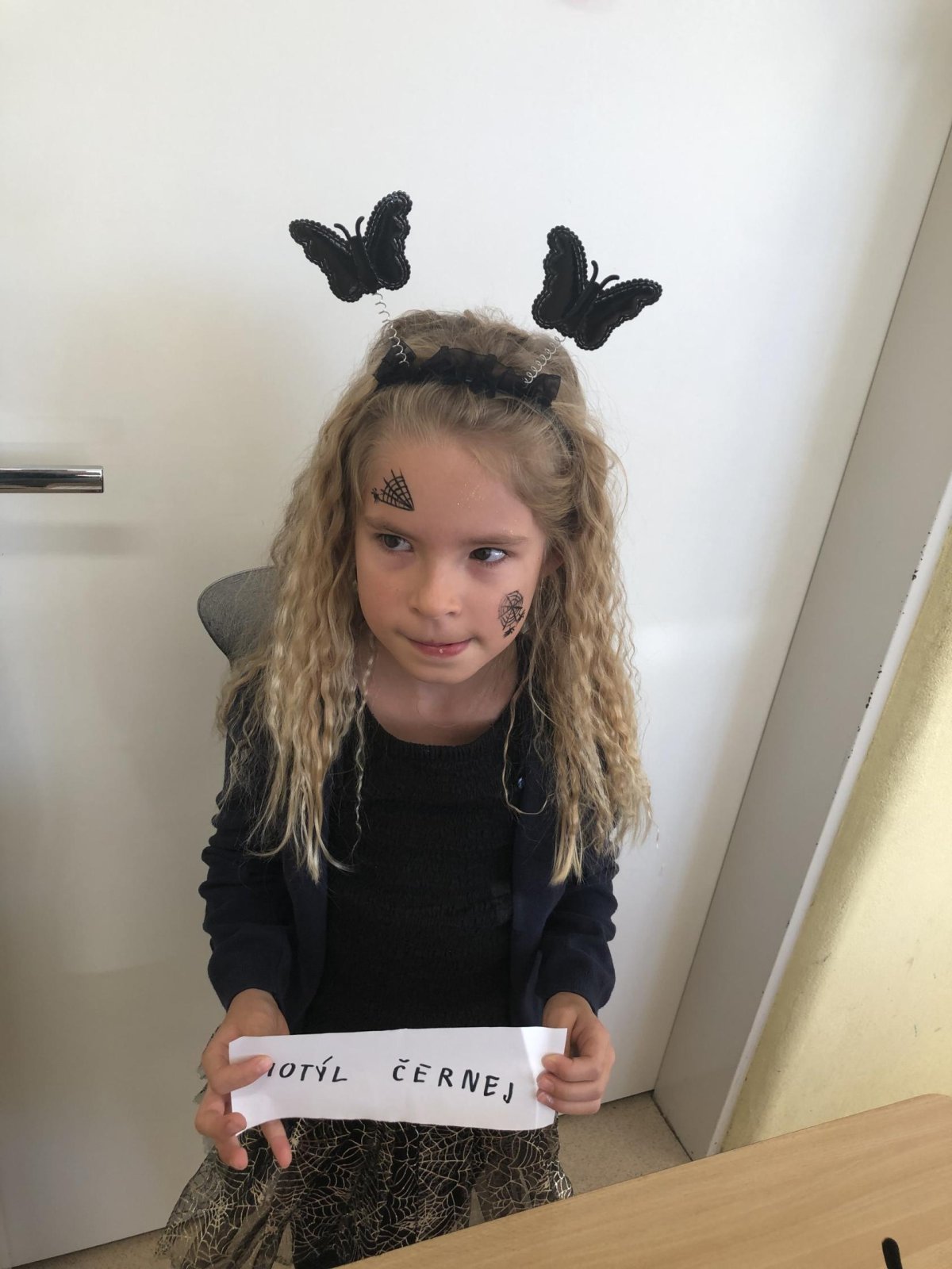 Dnešní den byl jiný. Všichni jsme měli kostýmy a představili jsme spolužákům své masky. Pak jsme plnili úkoly na dýňové stezce. Aby se Sárinka necítila osamocená v kostýmu ducha Ducháčka, tak jsme si vyrobili lízátkové duchy. Nezapomněli jsme na plnění halloweenských úkolů z matematiky a z českého jazyka. I piknik byl díky rodičům báječný - na stole šneci, prsty, muffiny a spousta dalších dobrot. A už také víme, čím se liší Halloween a české Dušičky.