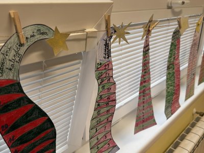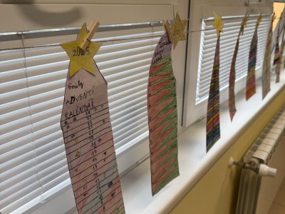 V pondělí si každý z nás vyrobil krásný adventní kalendář v podobě vánočního stromečku. Každý stromeček má 24 políček a my netrpělivě každý den jedno políčko odstříháváme a nemůžeme se dočkat Vánoc!