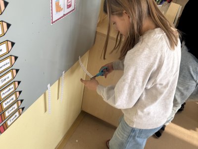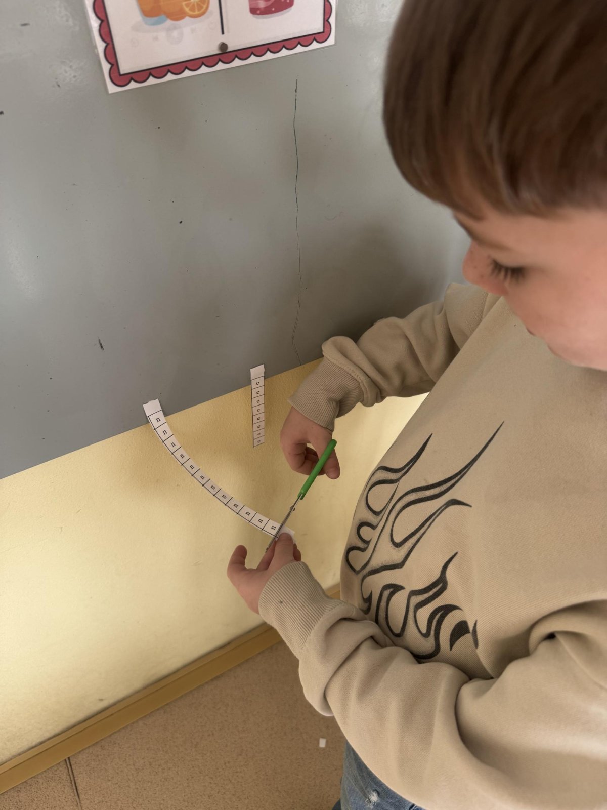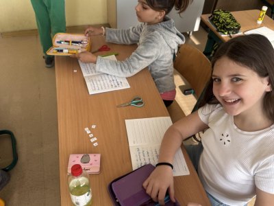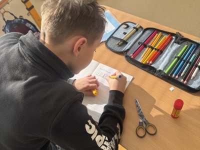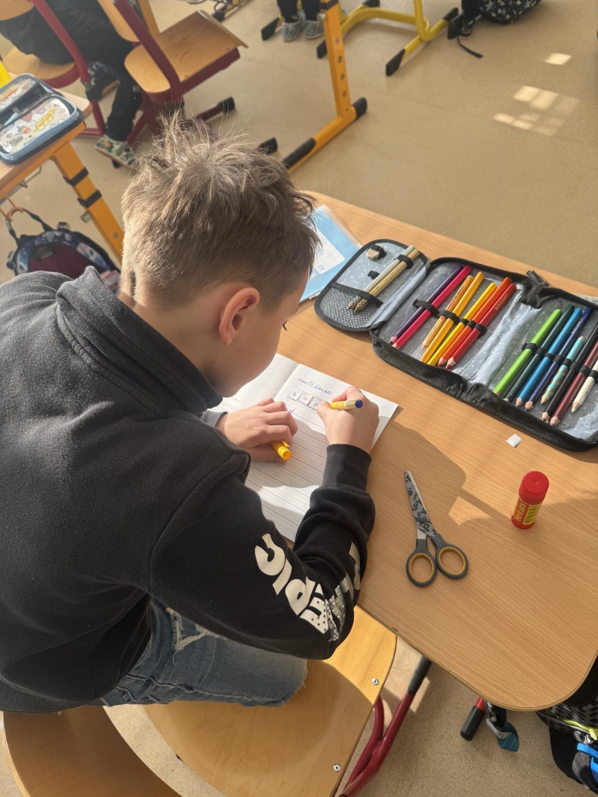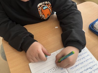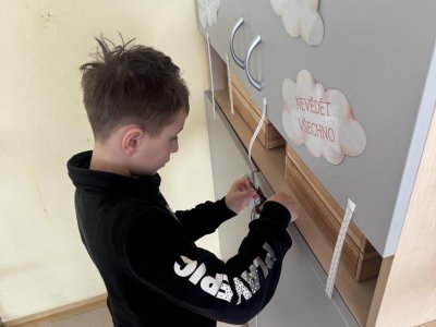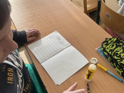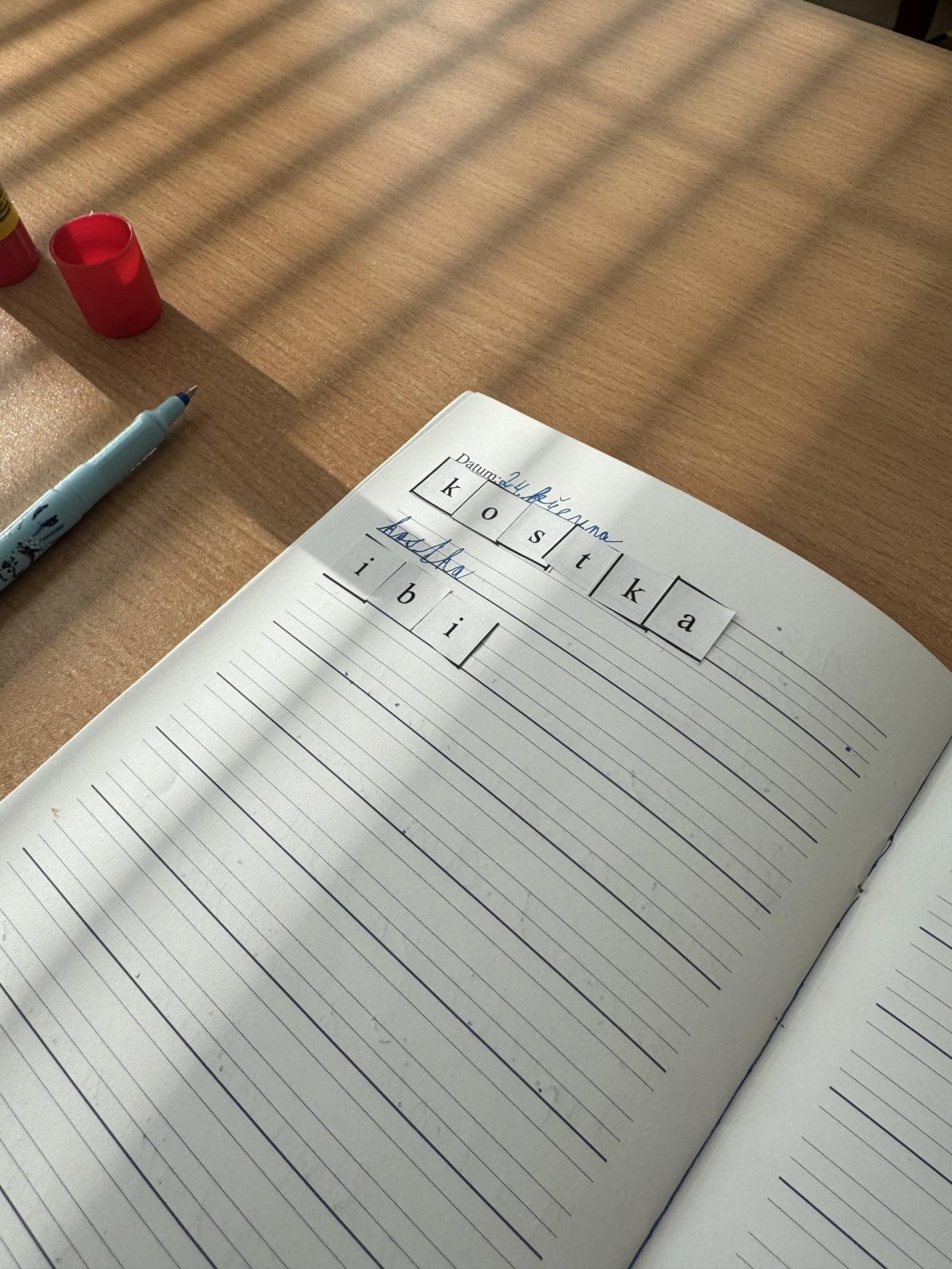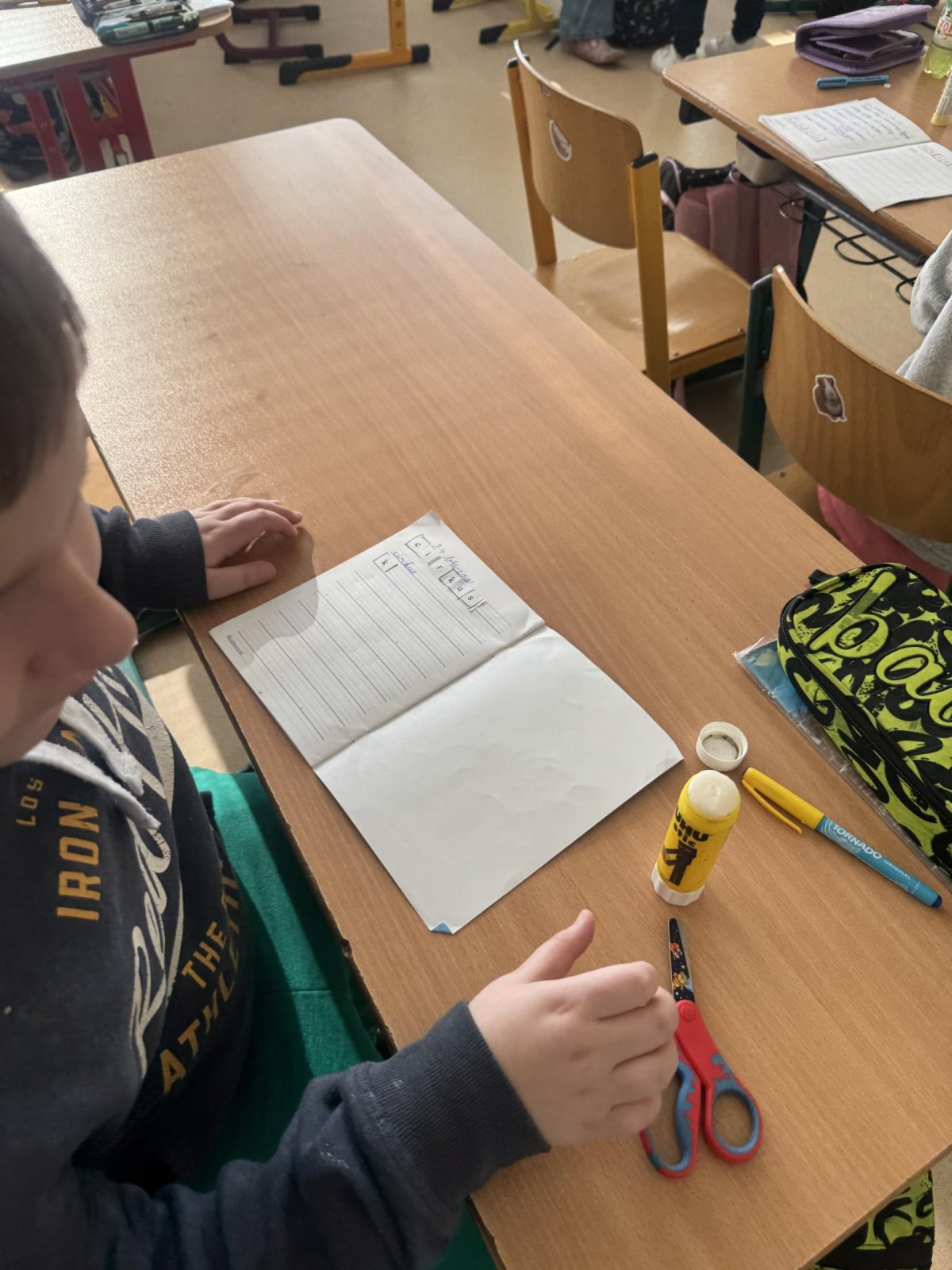 Dnešní den jsme začali pěkně svižně. Ve třídě na nás čekala písmenka, pěkně rozházená po celé třídě. Našim úkolem bylo písmenka najít, ustřihnout si je, poskládat slovo, nalepit a nakonec přepsat.