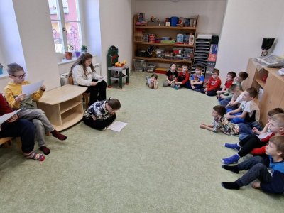 Ve čtení pohádek a krátkých pohádkových příběhů pokračují naši čtvrťáci v přípravné třídě i v březnu. Tráví tam téměř každou pondělní velkou přestávku a čtou malým posluchačům pohádkové příběhy, které oni napjatě poslouchají.