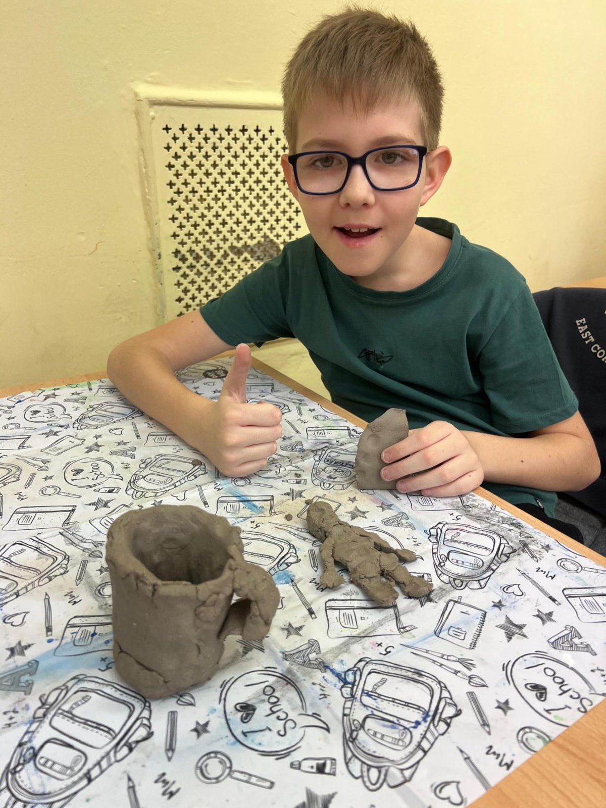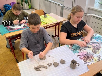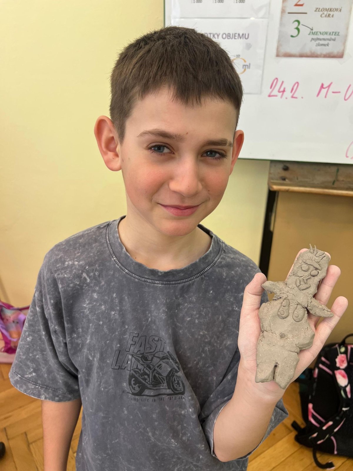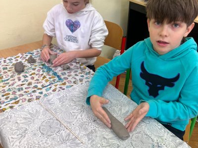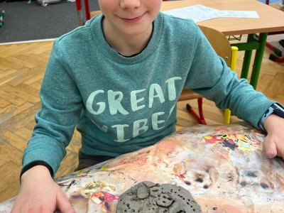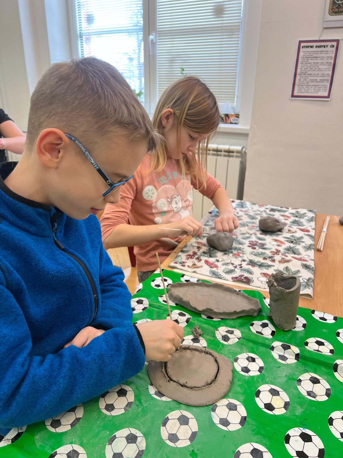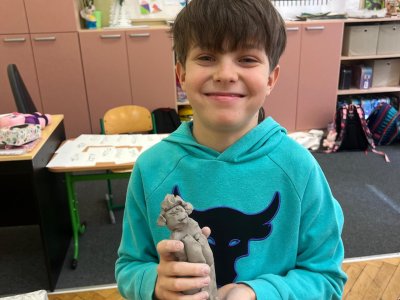 Ve vlastivědě pravěk, v muzeu výstava o tom, jak šel čas a v pracovních činnostech práce s keramickou hlínou... To byl jeden z našich školních dnů. Vůbec nebylo při práci s hlínou účelem, vytvořit umělecké dílo, to vypálit a vystavovat. Naopak - žáci si měli zkusit pracovat s "netradičním" materiálem a z této činnosti mít radost. Tento cíl byl naplněn na více než sto procent. Všichni si práci užili a zároveň vznikla krásná díla, která si na památku můžou odnést domů. Každý výrobek provázel krátký příběh o tom, jak vznikal a jak se každý u práce cítil, jak ji prožíval.