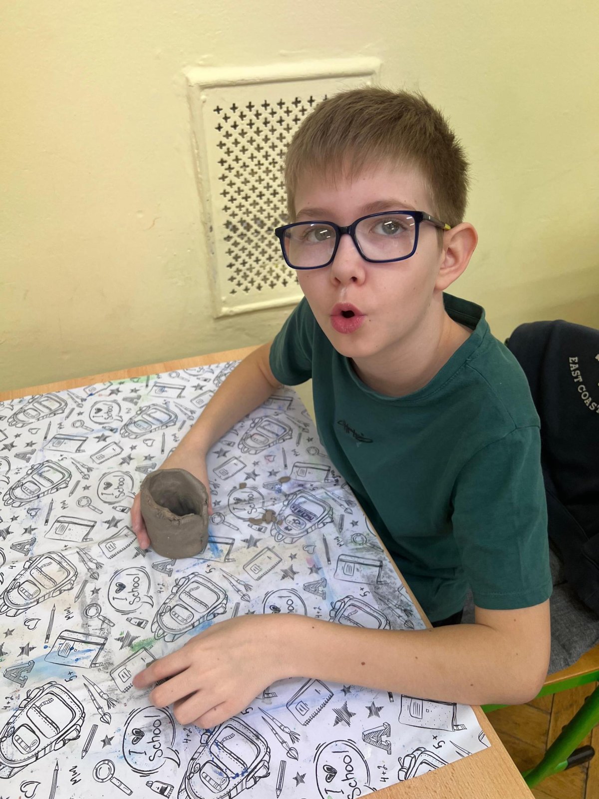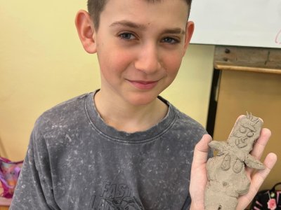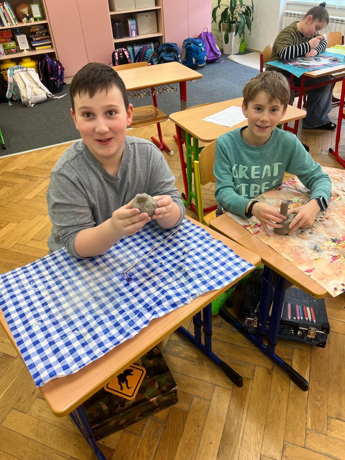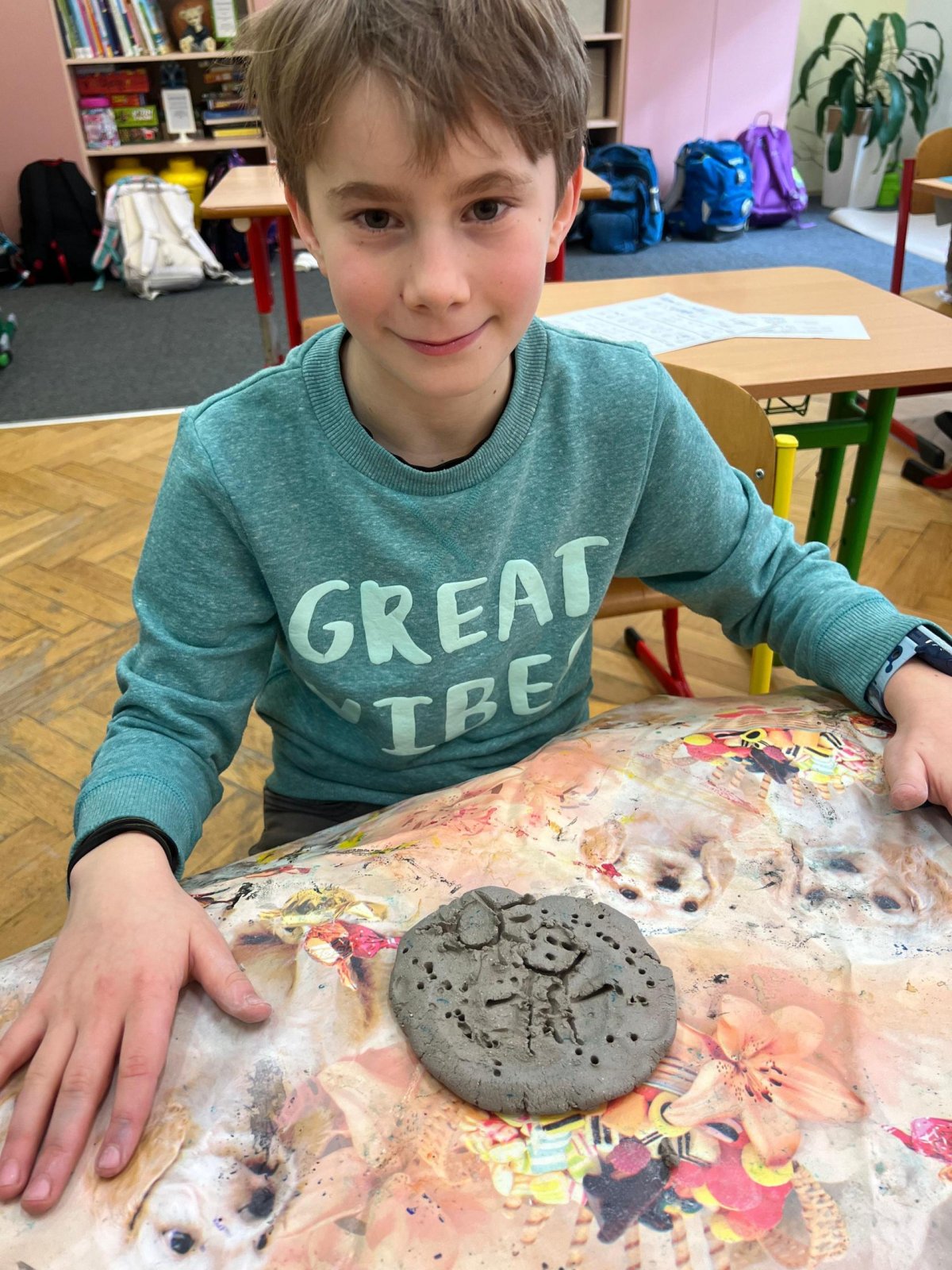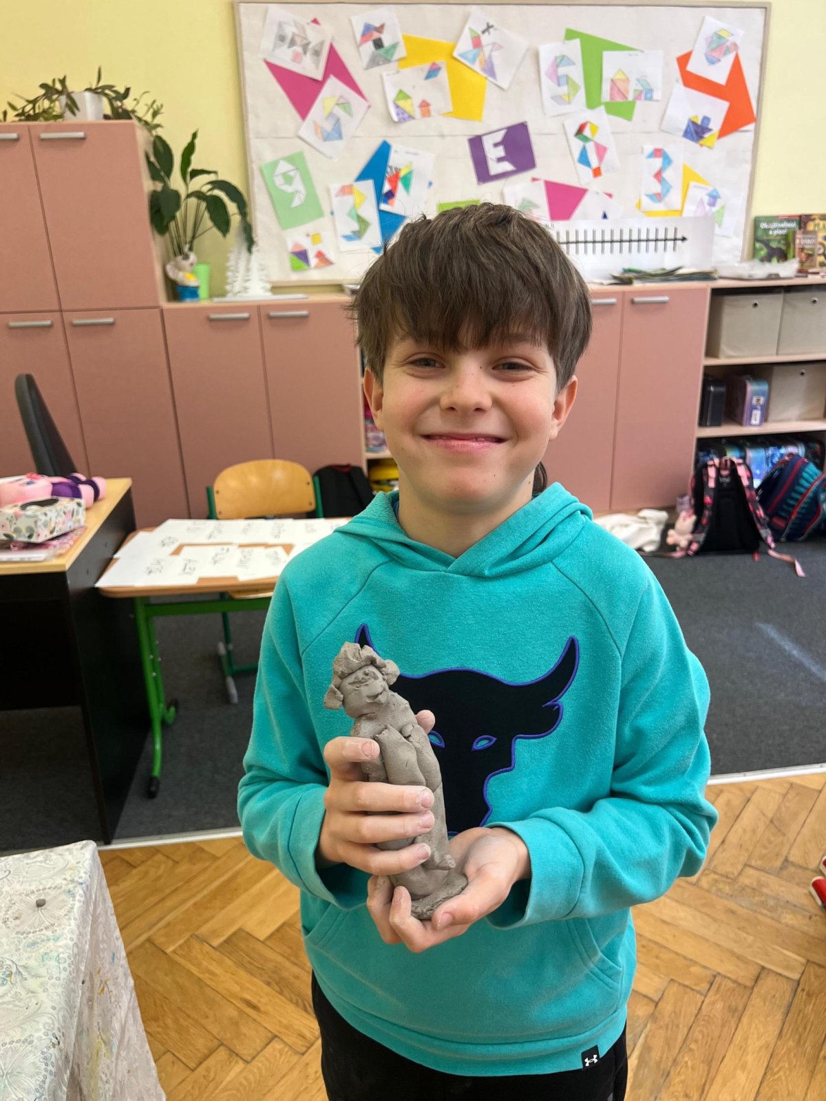 Ve vlastivědě pravěk, v muzeu výstava o tom, jak šel čas a v pracovních činnostech práce s keramickou hlínou... To byl jeden z našich školních dnů. Vůbec nebylo při práci s hlínou účelem, vytvořit umělecké dílo, to vypálit a vystavovat. Naopak - žáci si měli zkusit pracovat s "netradičním" materiálem a z této činnosti mít radost. Tento cíl byl naplněn na více než sto procent. Všichni si práci užili a zároveň vznikla krásná díla, která si na památku můžou odnést domů. Každý výrobek provázel krátký příběh o tom, jak vznikal a jak se každý u práce cítil, jak ji prožíval.