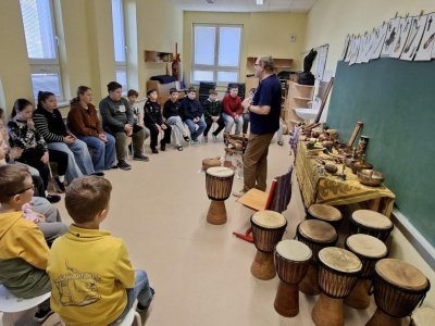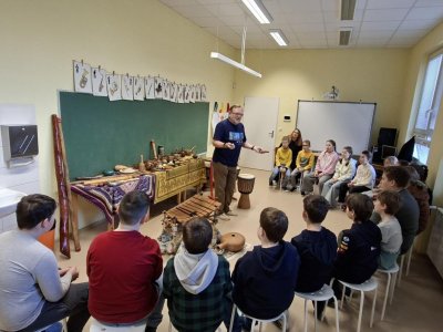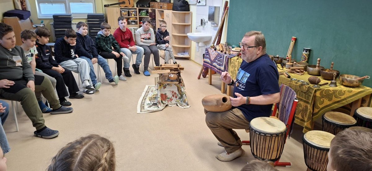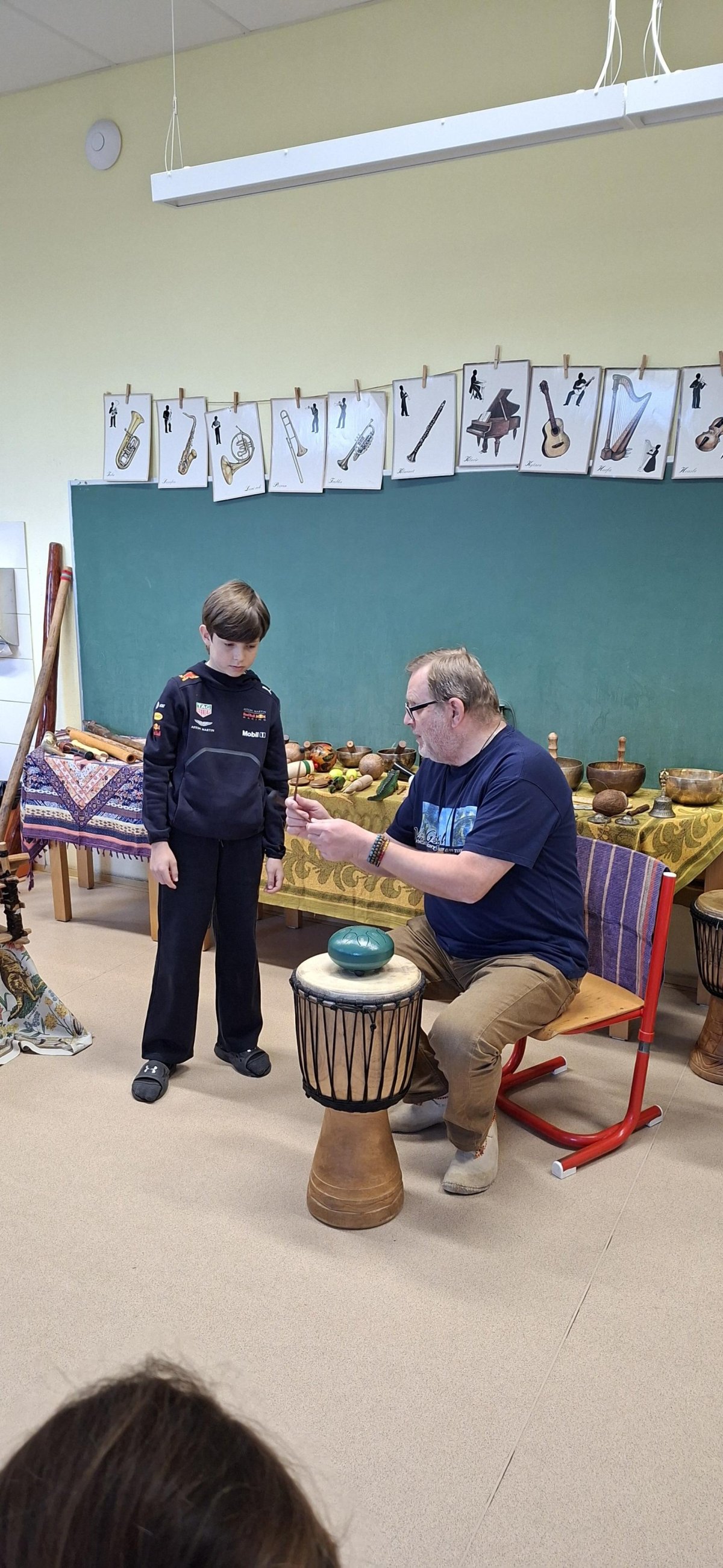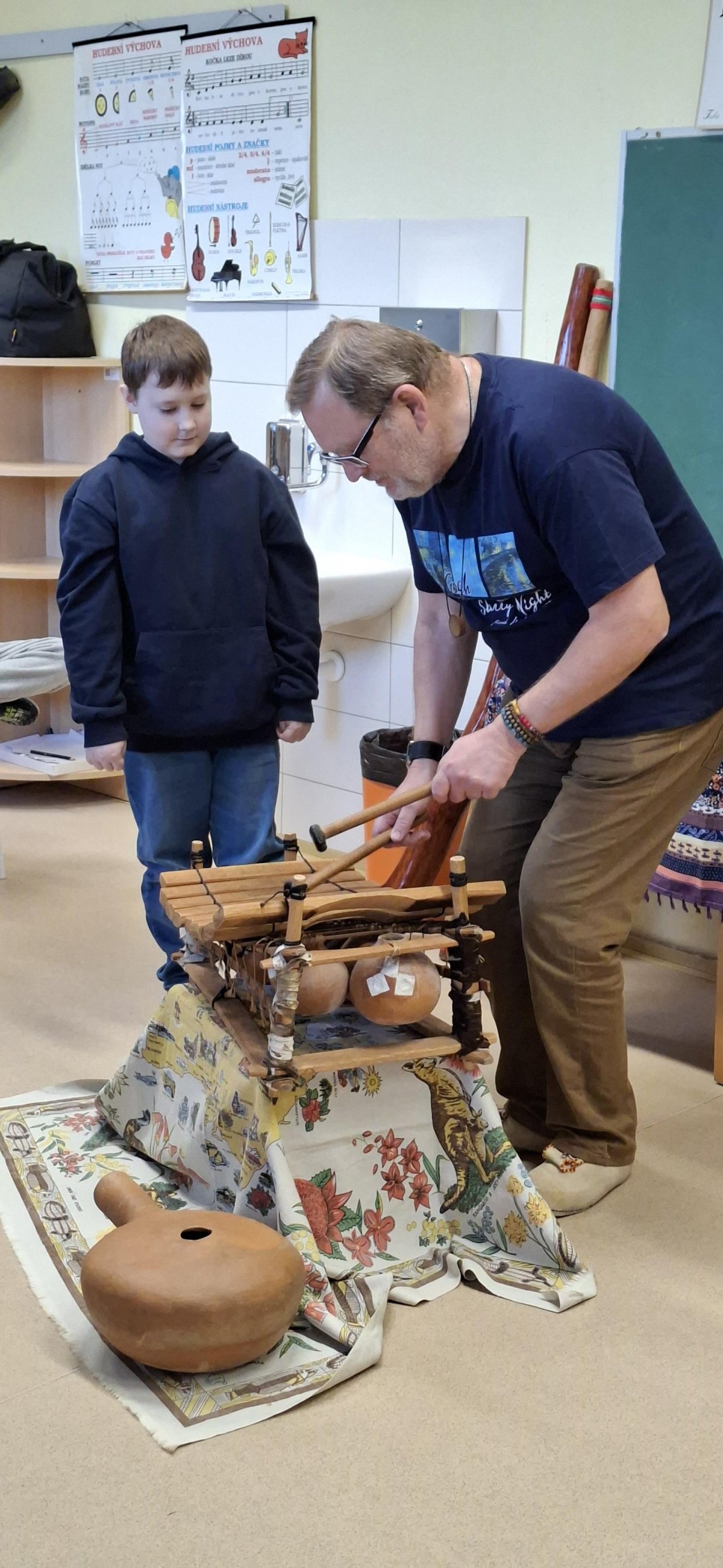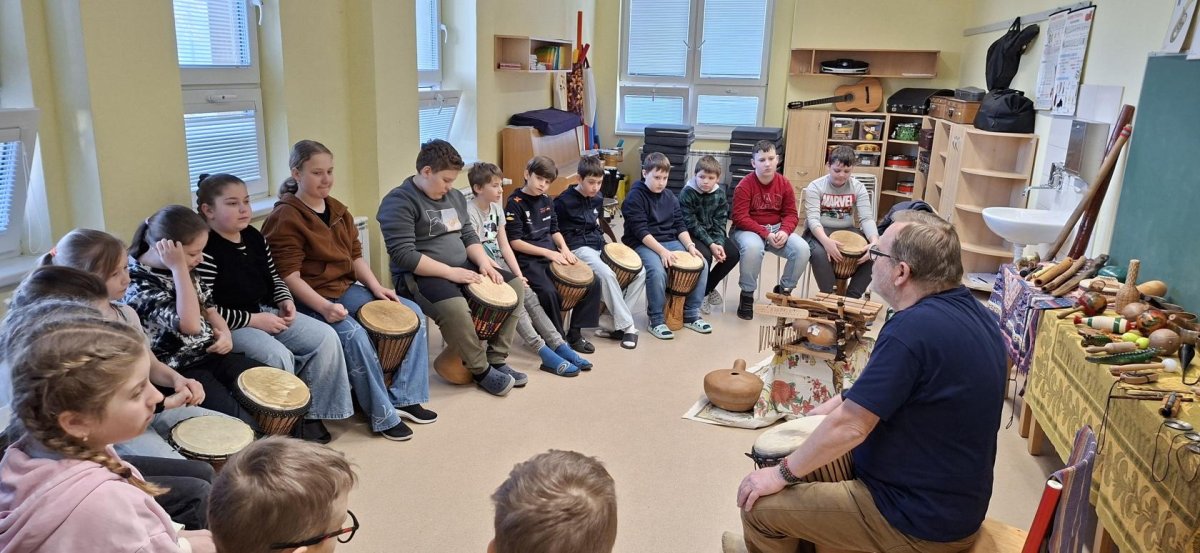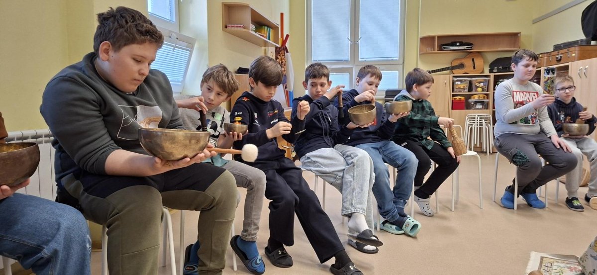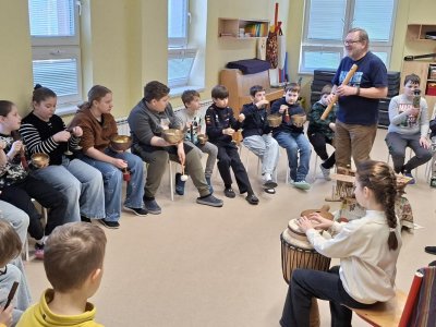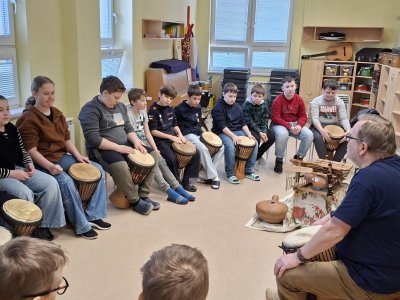 Také do naší třídy zavítal muzikoterapeut, pan Vysočan. Nejdříve nám vyprávěl o vzniku prvních hudebních nástrojů a mnohé zajímavosti o nich. Toto své povídání doplňoval ukázkami jednotlivých nástrojů i hrou na ně. Nakonec si samozřejmě i sami žáci zkusili, jak se na některé z nich hraje, bubnovali podle udávaných rytmů a také díky léčivým nástrojům vytvořili nádhenrnou hudební kulisu ke klidné, krátké meditaci.