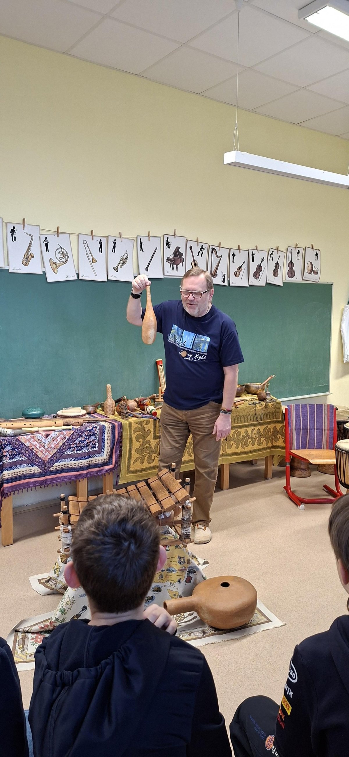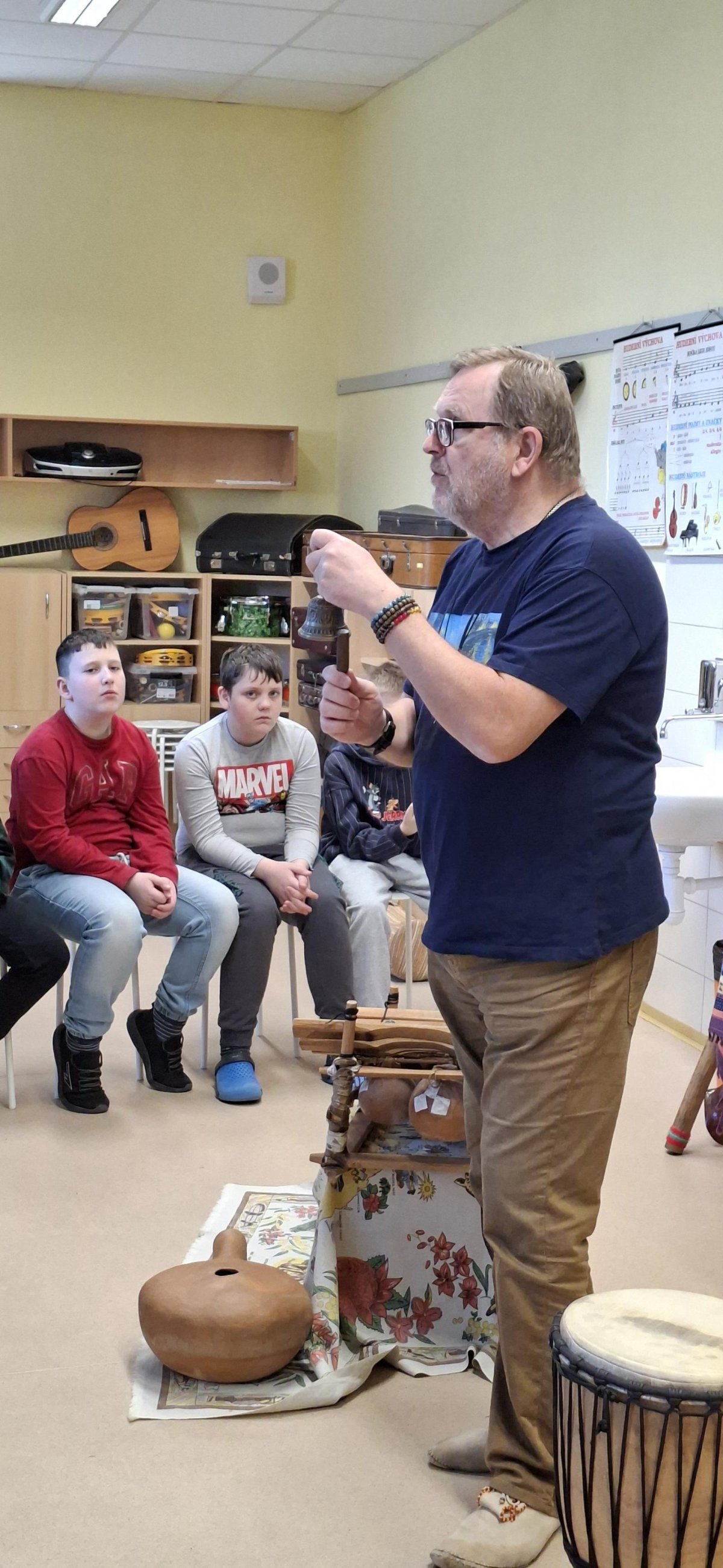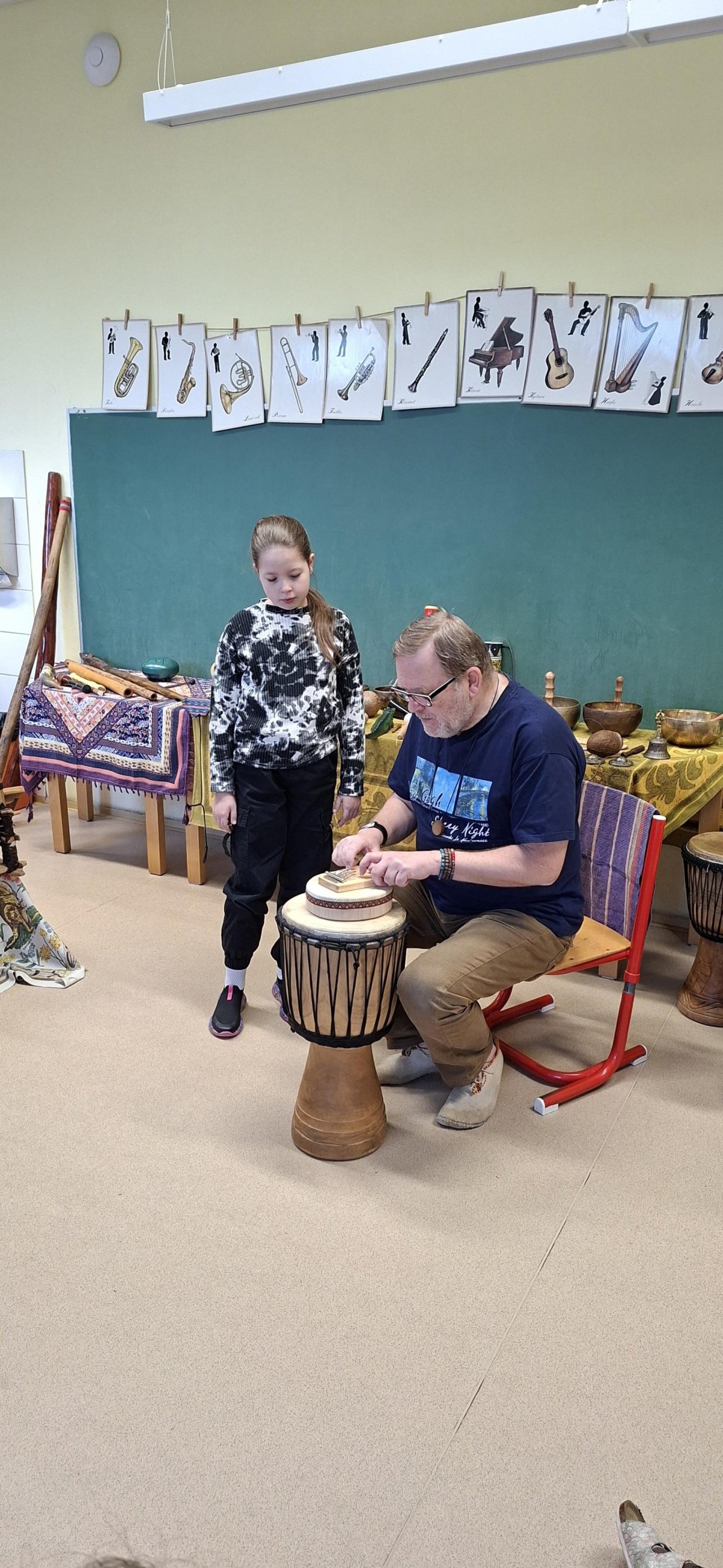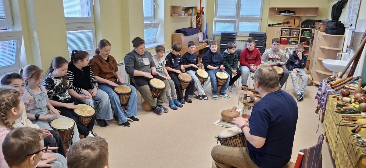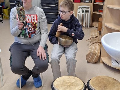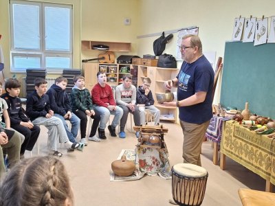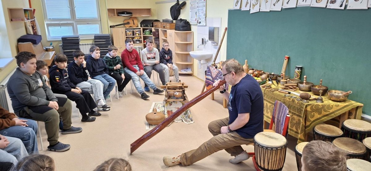 Také do naší třídy zavítal muzikoterapeut, pan Vysočan. Nejdříve nám vyprávěl o vzniku prvních hudebních nástrojů a mnohé zajímavosti o nich. Toto své povídání doplňoval ukázkami jednotlivých nástrojů i hrou na ně. Nakonec si samozřejmě i sami žáci zkusili, jak se na některé z nich hraje, bubnovali podle udávaných rytmů a také díky léčivým nástrojům vytvořili nádhenrnou hudební kulisu ke klidné, krátké meditaci.