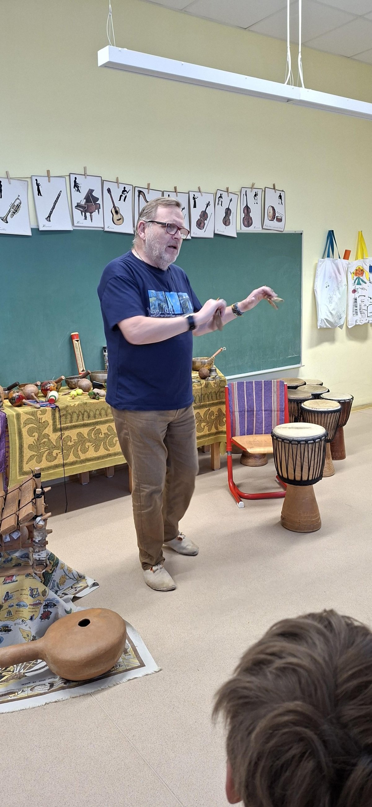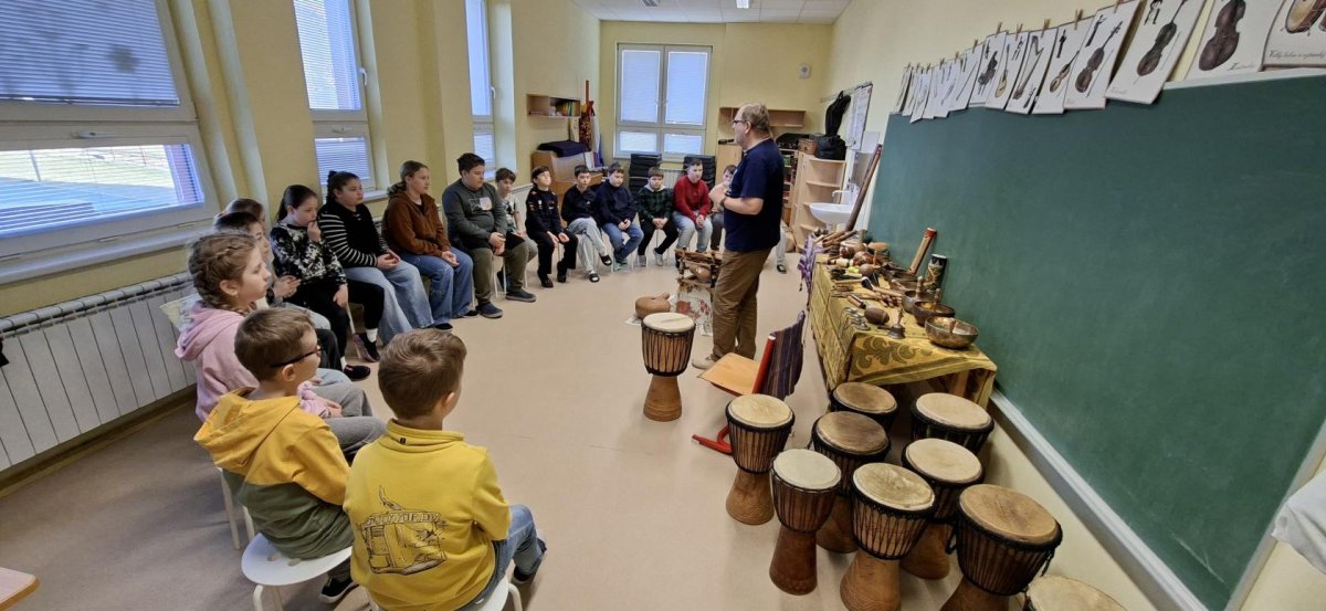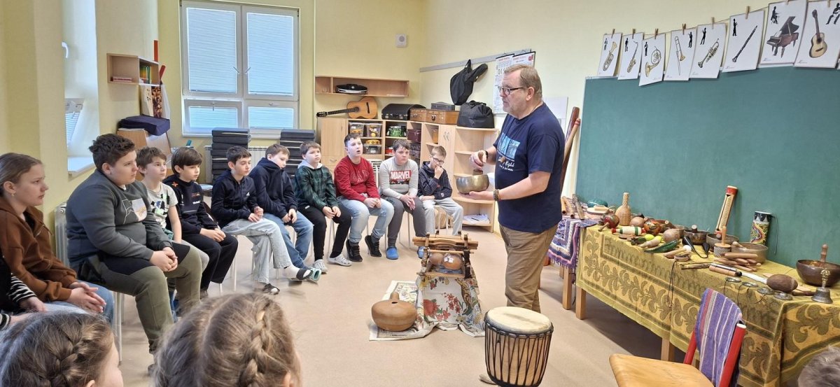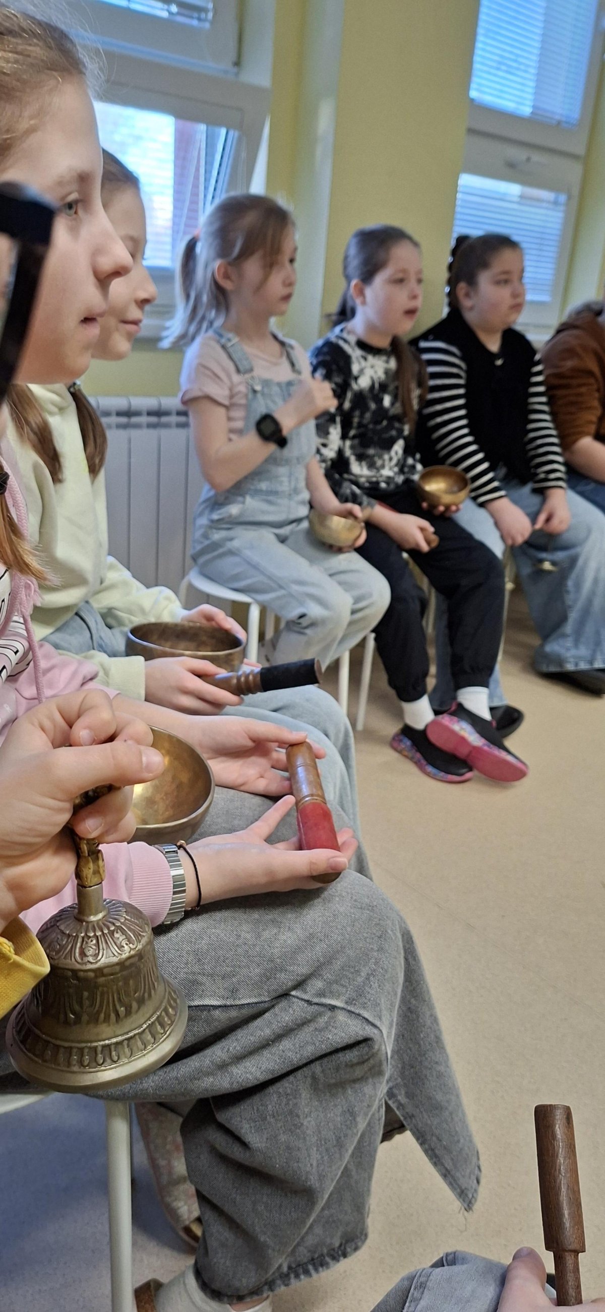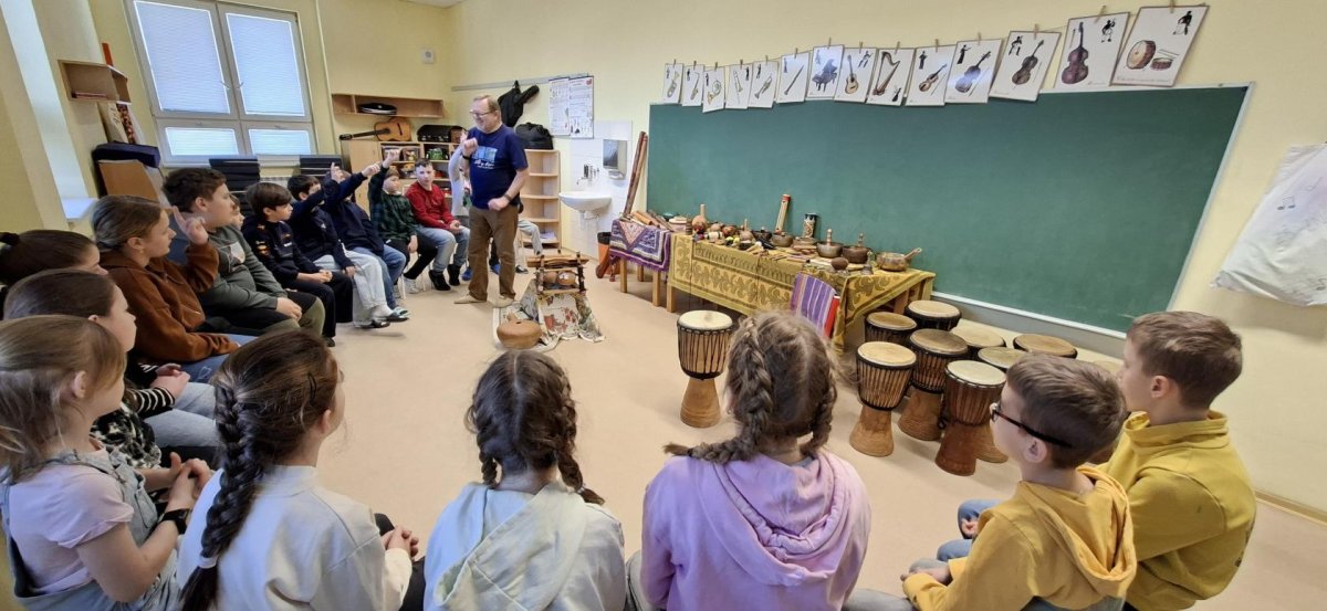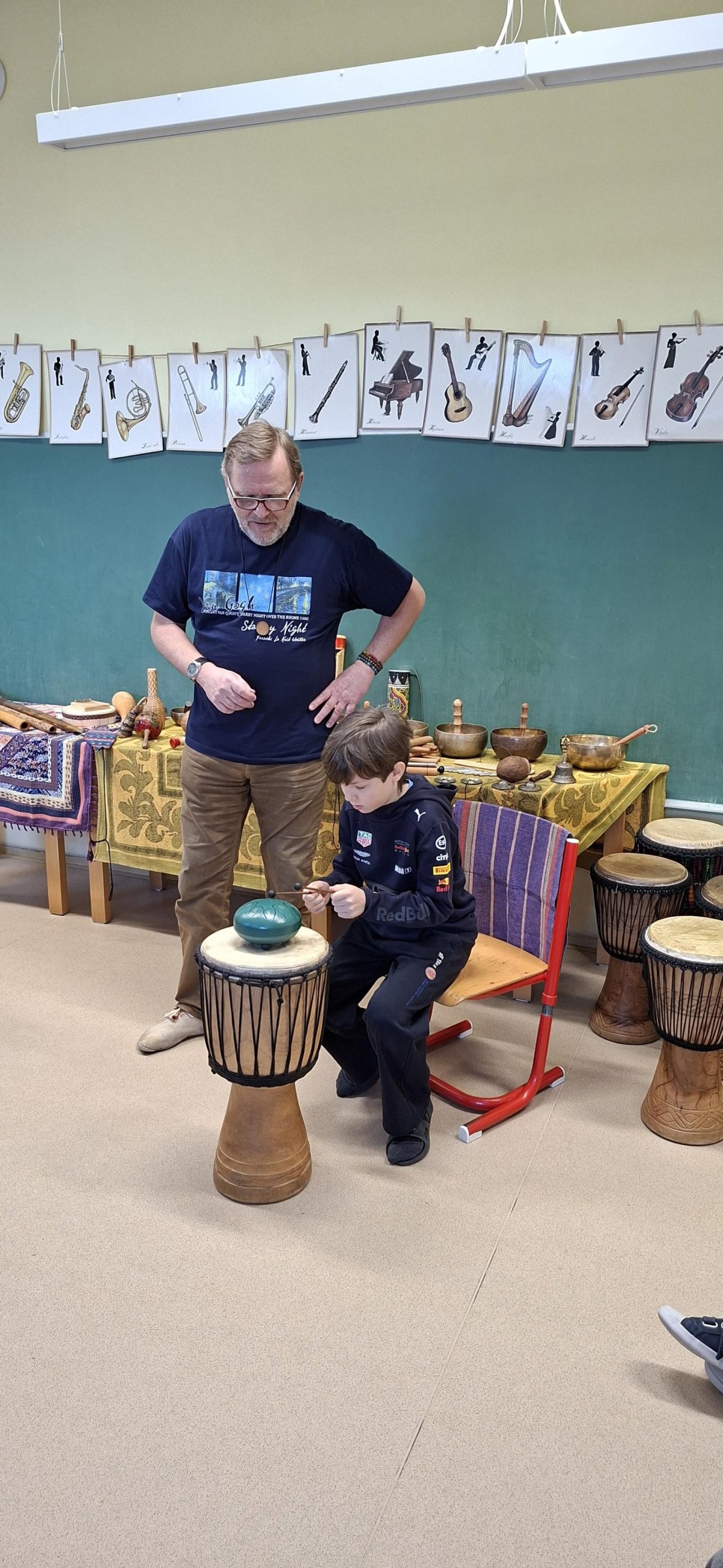 Také do naší třídy zavítal muzikoterapeut, pan Vysočan. Nejdříve nám vyprávěl o vzniku prvních hudebních nástrojů a mnohé zajímavosti o nich. Toto své povídání doplňoval ukázkami jednotlivých nástrojů i hrou na ně. Nakonec si samozřejmě i sami žáci zkusili, jak se na některé z nich hraje, bubnovali podle udávaných rytmů a také díky léčivým nástrojům vytvořili nádhenrnou hudební kulisu ke klidné, krátké meditaci.