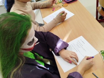Jako nejzajímavější úspěšnou činnost (kromě celodenního pojídání halloweenských pamlsků) jsme si vybrali přípravu halloweenských omalovánek pro mladší ročníky.