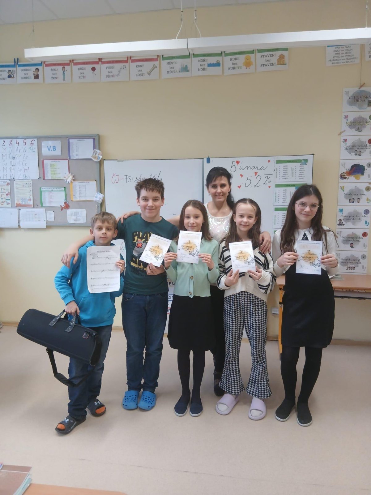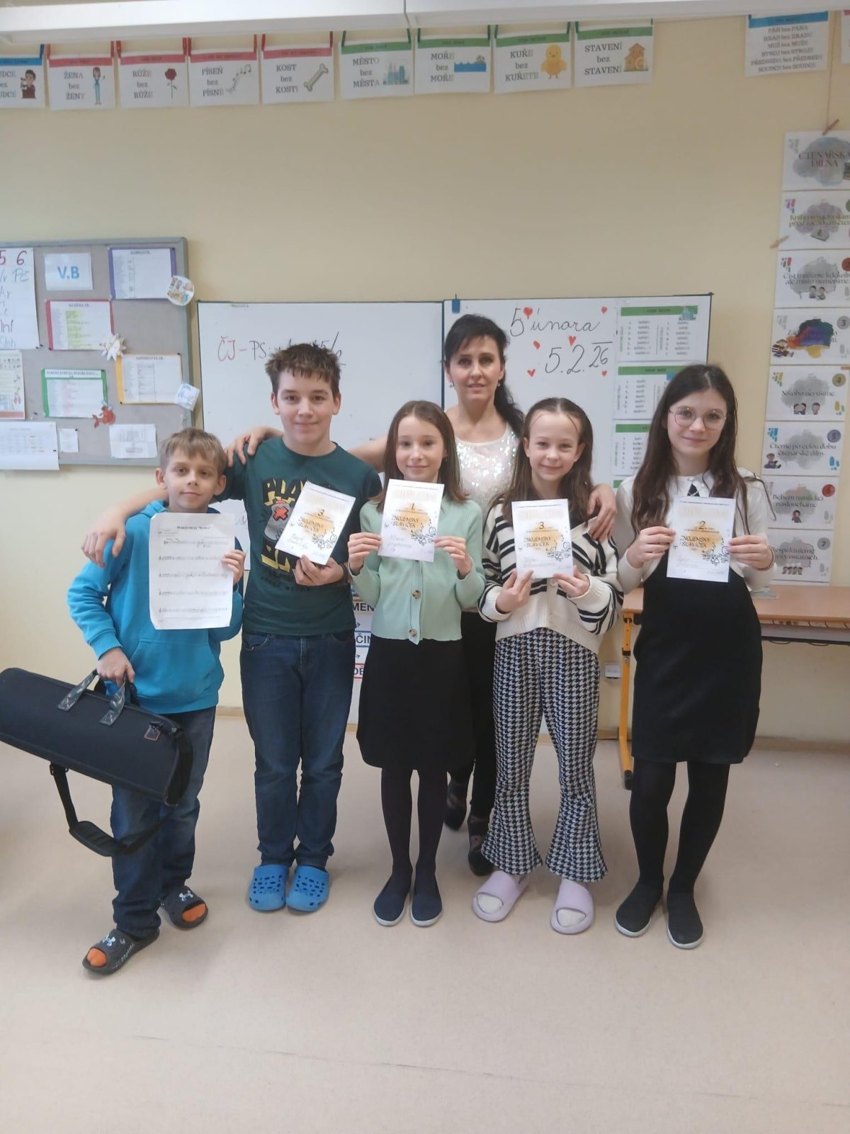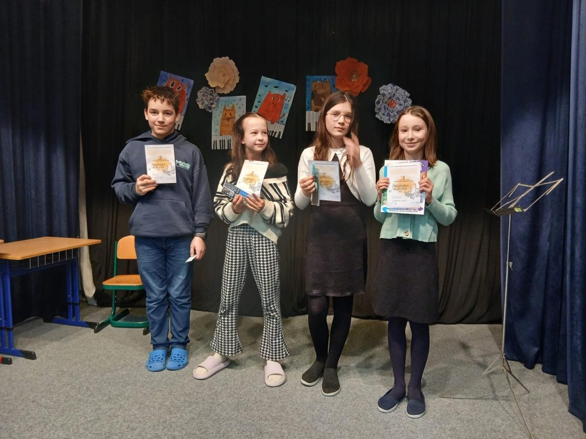 Náš krásný úspěch zcela plnohodnotně doplnil Karel Veljlupek, který hudební pauzy vyplnil hrou na trubku - příjemná hudební vsuvka nám udělala radost a společně jsme si vychutnali vítězství a úspěch. Všem žákům děkujeme. Jsme rádi, že je hudba pro děti stále potěšením, užili jsme si to.