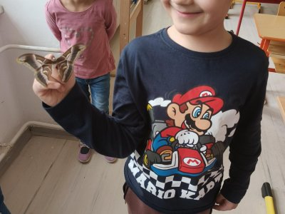 Ve třídě jsme se seznámili s živým nočním motýlem – martináčem pajasanovým, jedním z největších evropských motýlů. Děti měly možnost pozorovat celý jeho vývojový cyklus díky fotografiím housenek a skutečným kuklám, které jsme si společně prohlédli.