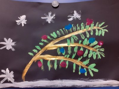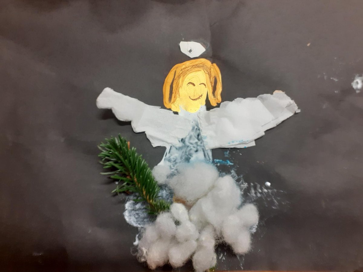 Kreslíme vánoční větvičku a andělíčka voskovkami,nebo vodovými barvami.