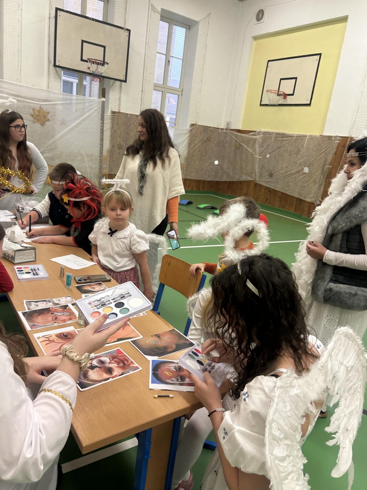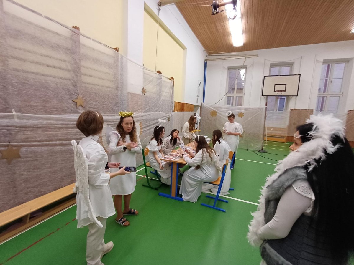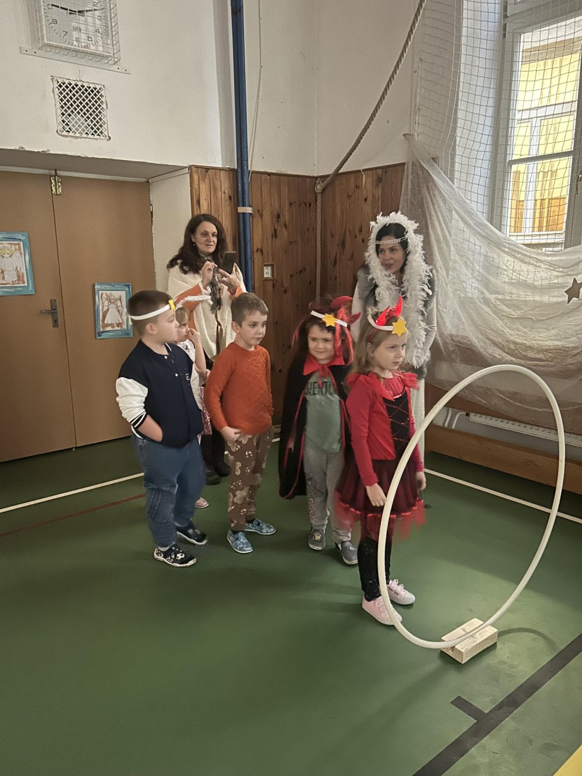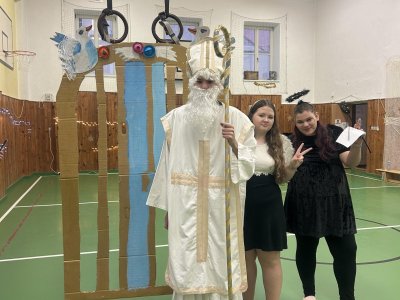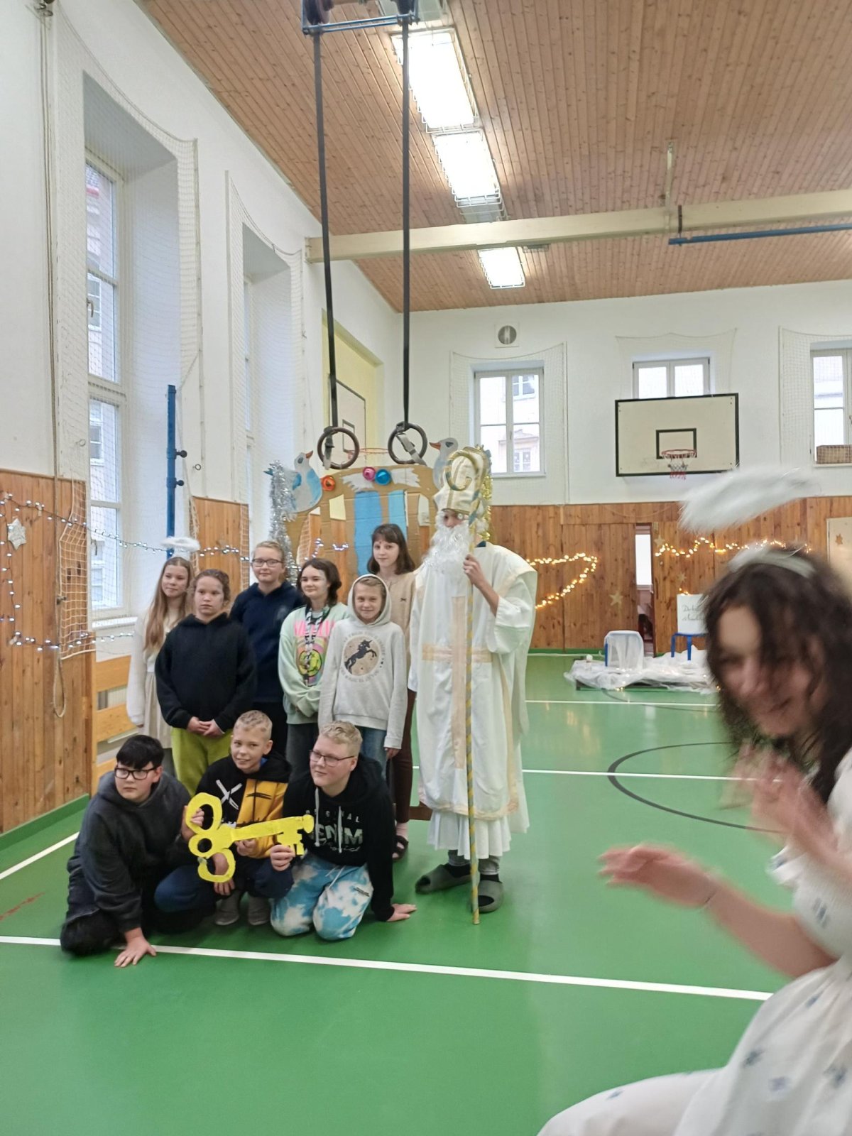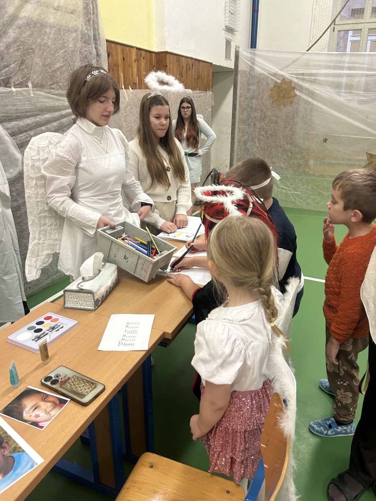 V pekle děti čekala tma a čerti je prověřili hmatovým poznáváním tvarů, následovala ochutnávka „pekelného“ nápoje a krátká audience u vládce pekel. Odtud žáky dva „padlí“ andělé odvedli do nebe. Děti zvládly překážkovou dráhu k nebeské bráně, nechaly si namalovat obličej a nakonec společně přivolaly Mikuláše. Ten je pochválil za jejich dobré skutky a povzbudil je, aby v nich pokračovaly. Na závěr dostaly perníčky, které napekla a nazdobila třída 8.B.