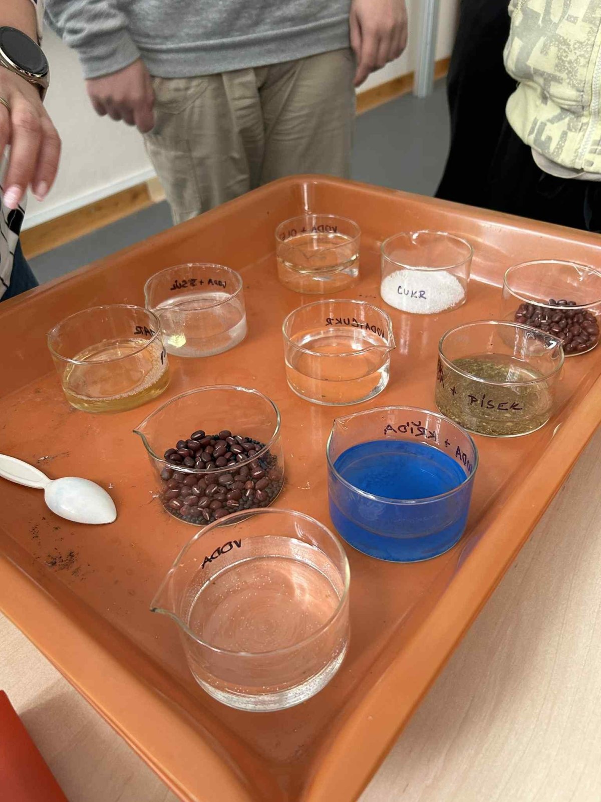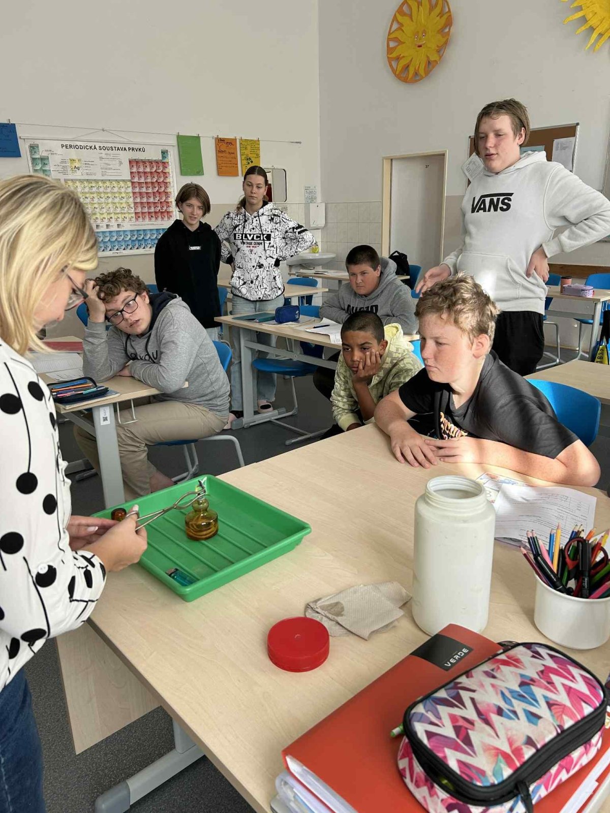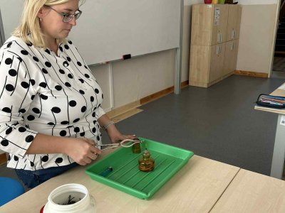 Paní učitelka nám při pokusu ukázala zajímavé vlastnosti různých látek. Bylo to zábavné a už se těšíme na další experimenty!