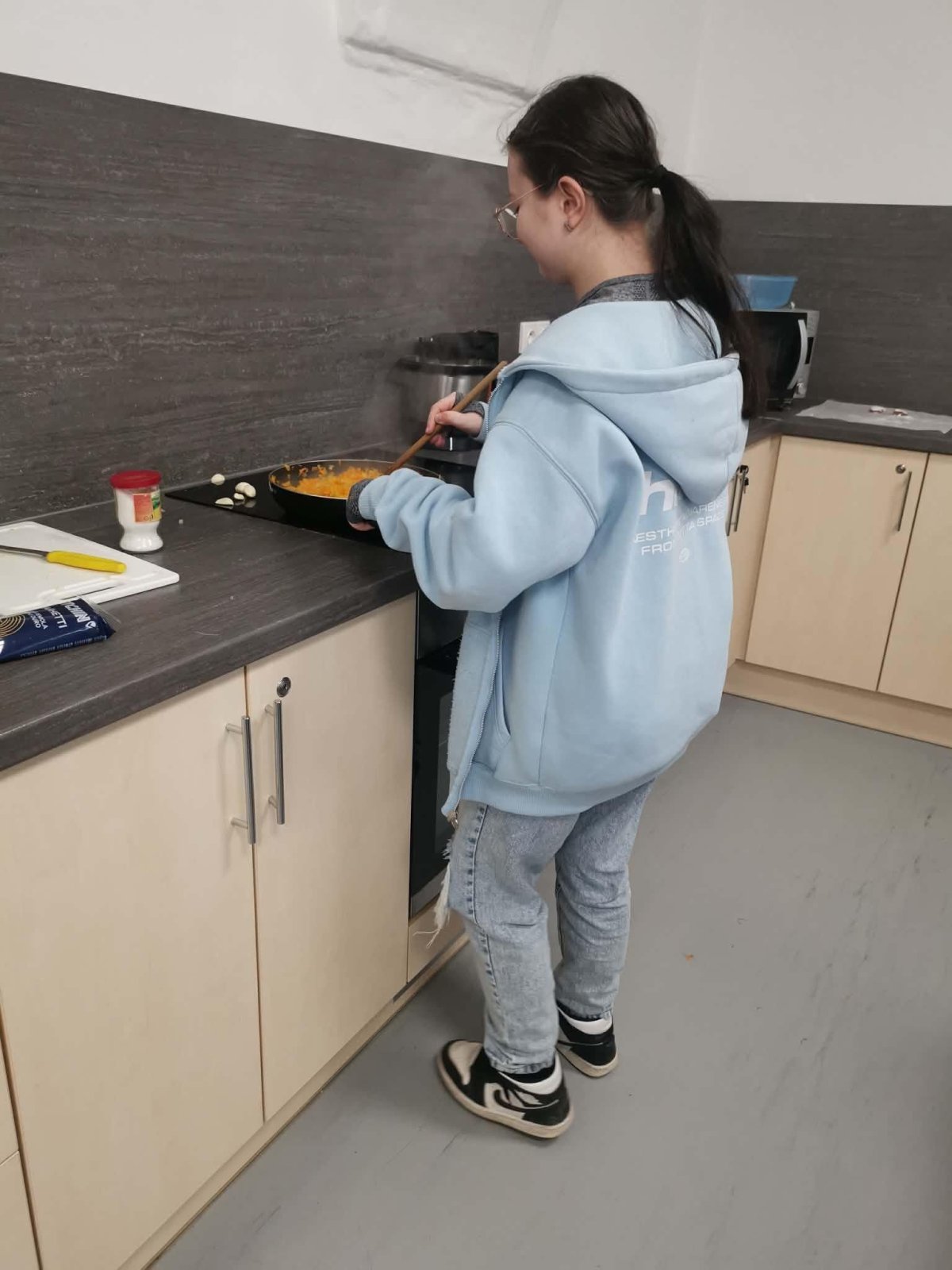 ... ale v kuchyni při vaření je teplo. A tak jsme i my zkusili ukuchtit něco lahodného. Tentokrát to byly špagety s restovanoou zeleninou - mrkev, řapíkatý celer, cibule, česnek, na tomatovém základě, sypané strouhaným parmezánem.