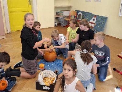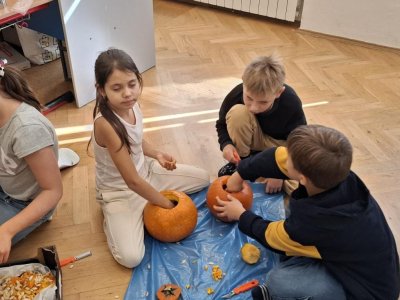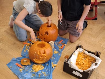 Na páteční výuku výtvarné výchovy se celá třída velmi těšila. A proč? Protože jsme se věnovali přípravě oslavy Halloweenu, která bude následovat příští týden v pátek, 31. 10. 2025. A co všechno jsme zvládli? Tak nejvíce se děti těšily na dlabání dýní, které jsme si předem opatřili. Vůbec to nebyla jednoduchá práce. Děti pracovaly s různými vykrajovátky, malými pilkami, noži a dalšími pomůckami. Fantazii se meze nekladou. Celou dobu jsem dohlížela na bezpečnost, aby se někdo nezranil.