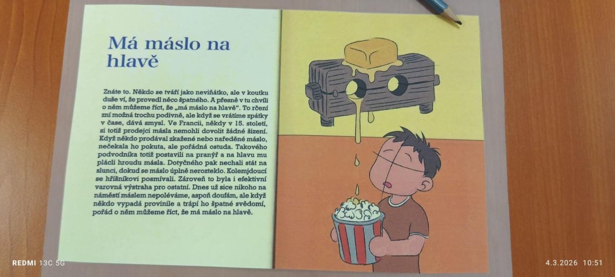 Možná máte něco v merku nebo máslo na hlavě, popřípadě hážete flintu do žita! Co vlastně tato slovní spojení znamenají? Odkud a jak vznikla a jaký byl jejich původní význam? Na tyto otázky jsme si společně odpověděli v rámci besedy v Městské knihovně. I přesto, že tato spojení používáme poměrně často, již málokdoví, jak vlastně vznikla a odkud pocházejí. Tímto směrem byla vedena naše beseda, čtení, zkoumání a následný rozbor. My už víme, proč se našim Jozífkům říká Pepo a odkud pochází jméno Saša, ačkoliv je spisovně Alexandr. A když má někdo něco za lubem, tak něco skrývá, plánuje nebo dokonce zamlčuje. A co je to "lub", už víme také. A vy?