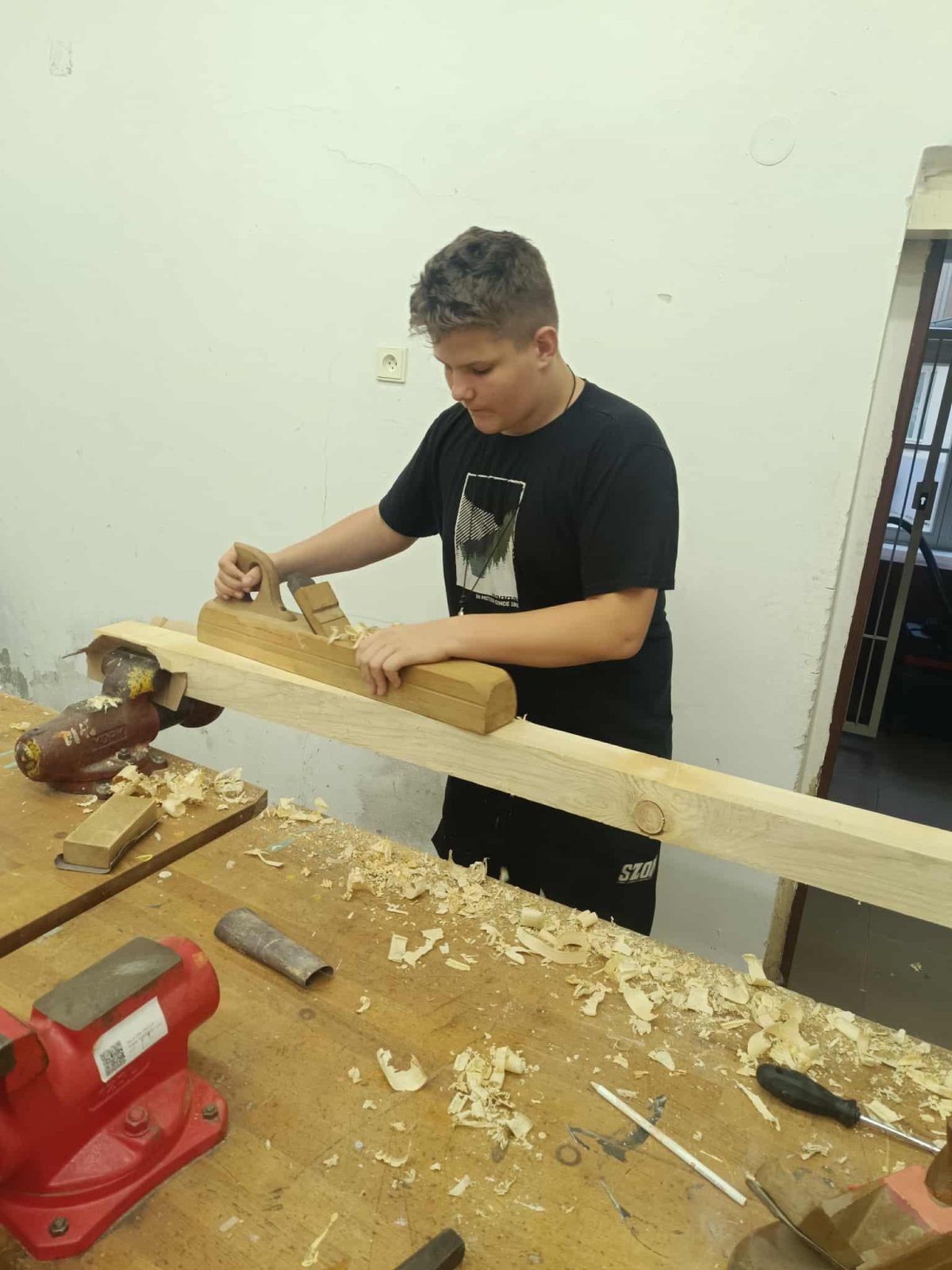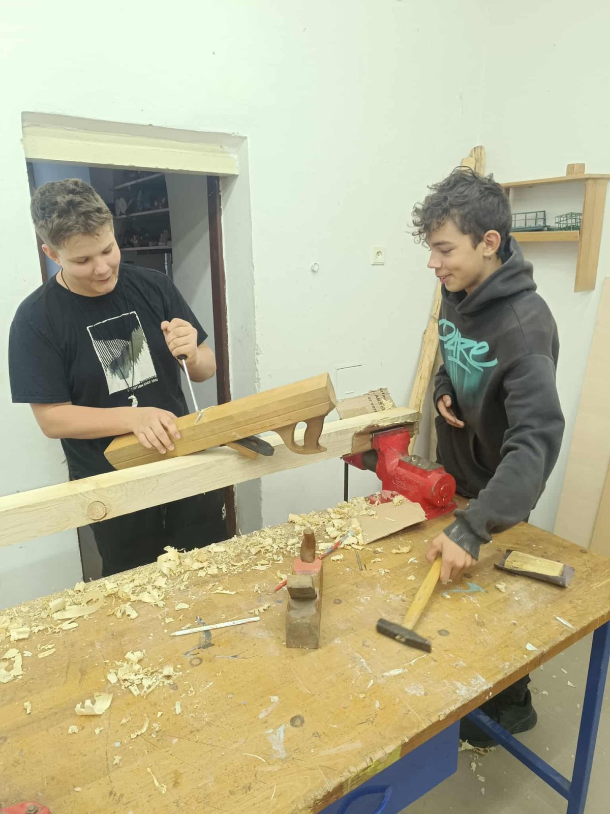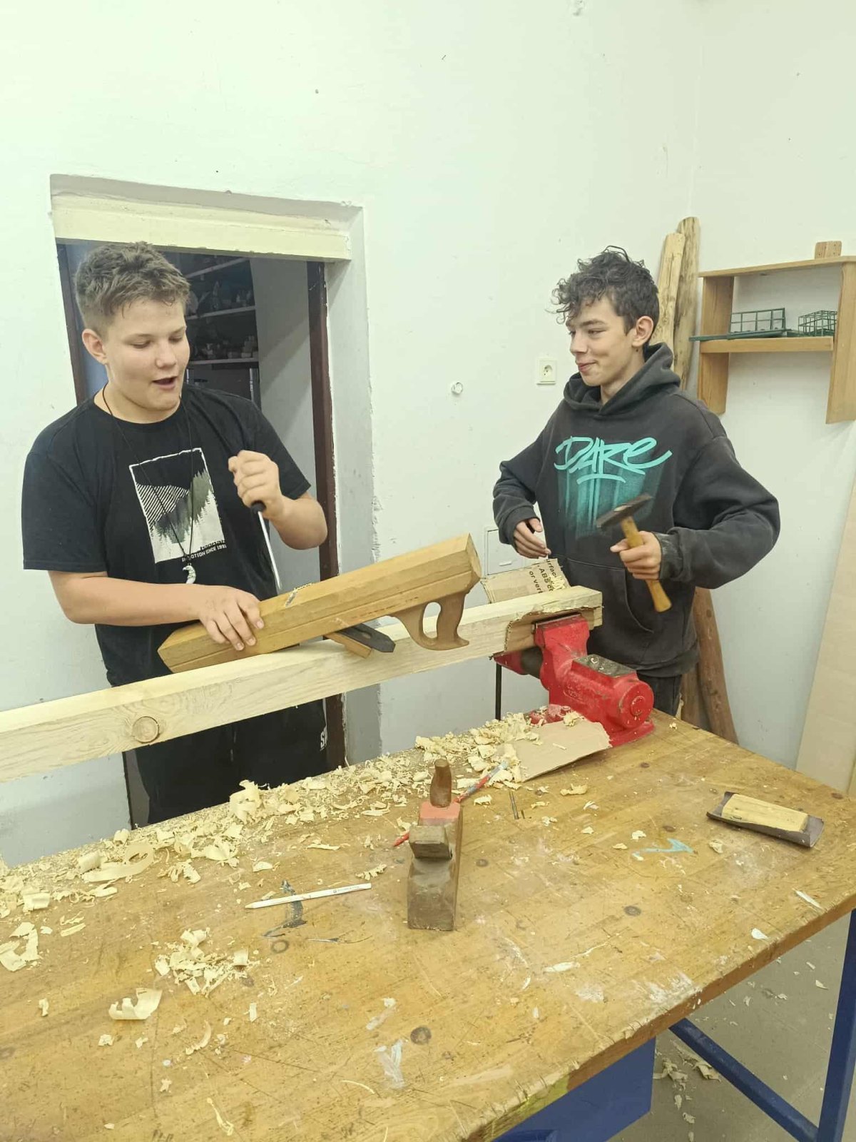 Už jsme osmáci a chceme zkusit něco pořádného s dospěláckým nářadím. Jsme tedy moc rádi, když můžeme vzít do ruky hoblík a pořádně se do něj opřít. Výsledek je sice nejistý, ale vždyť se to teprve učíme. Jednou budeme skvělí řemeslníci.